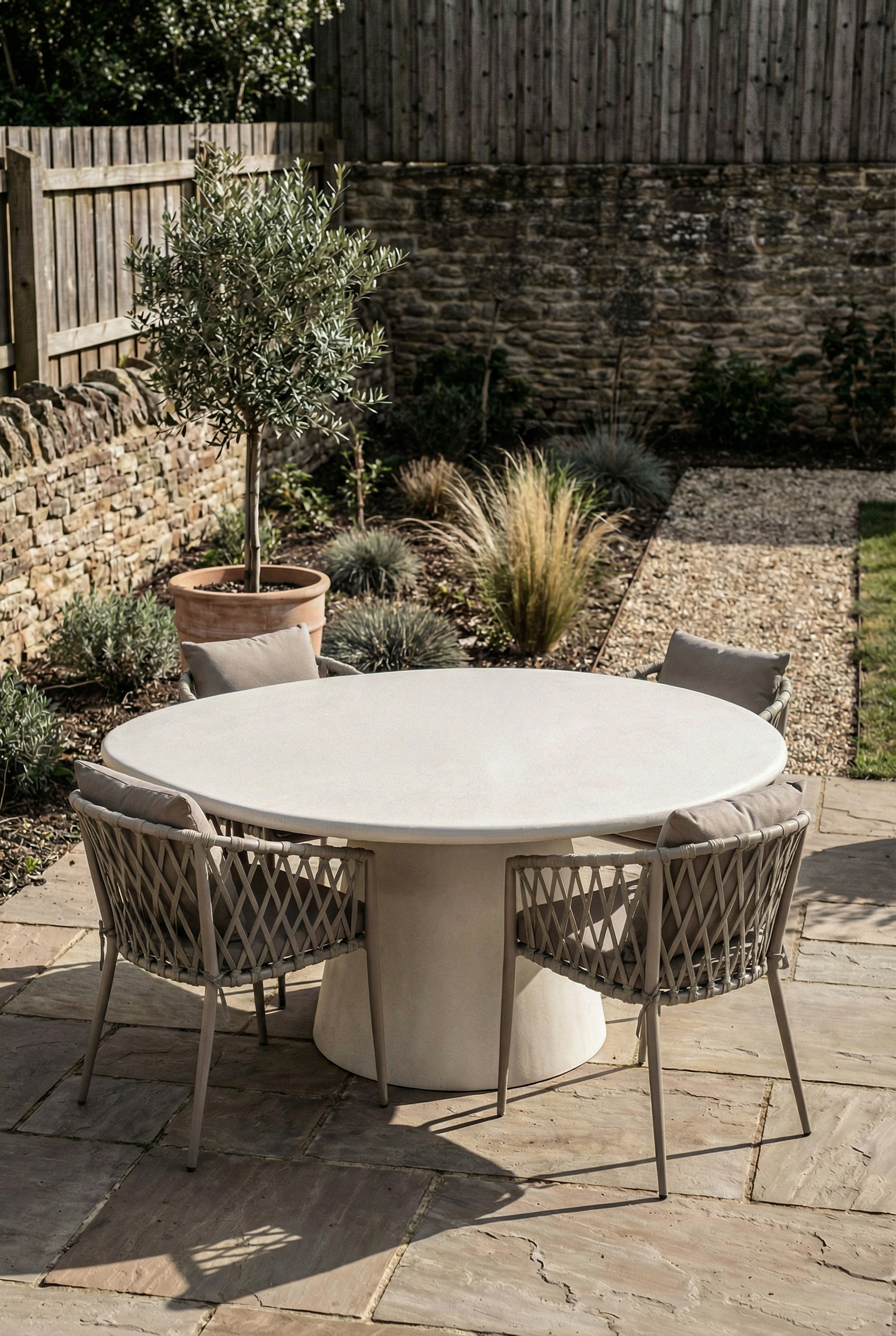 Designed to elevate your outdoor setting, this concrete coated dining table brings sculptural elegance and calm minimalism to your space with its soft matte finish and refined silhouette, creating a serene backdrop for sunlit gatherings, effortless styling, and modern outdoor living.