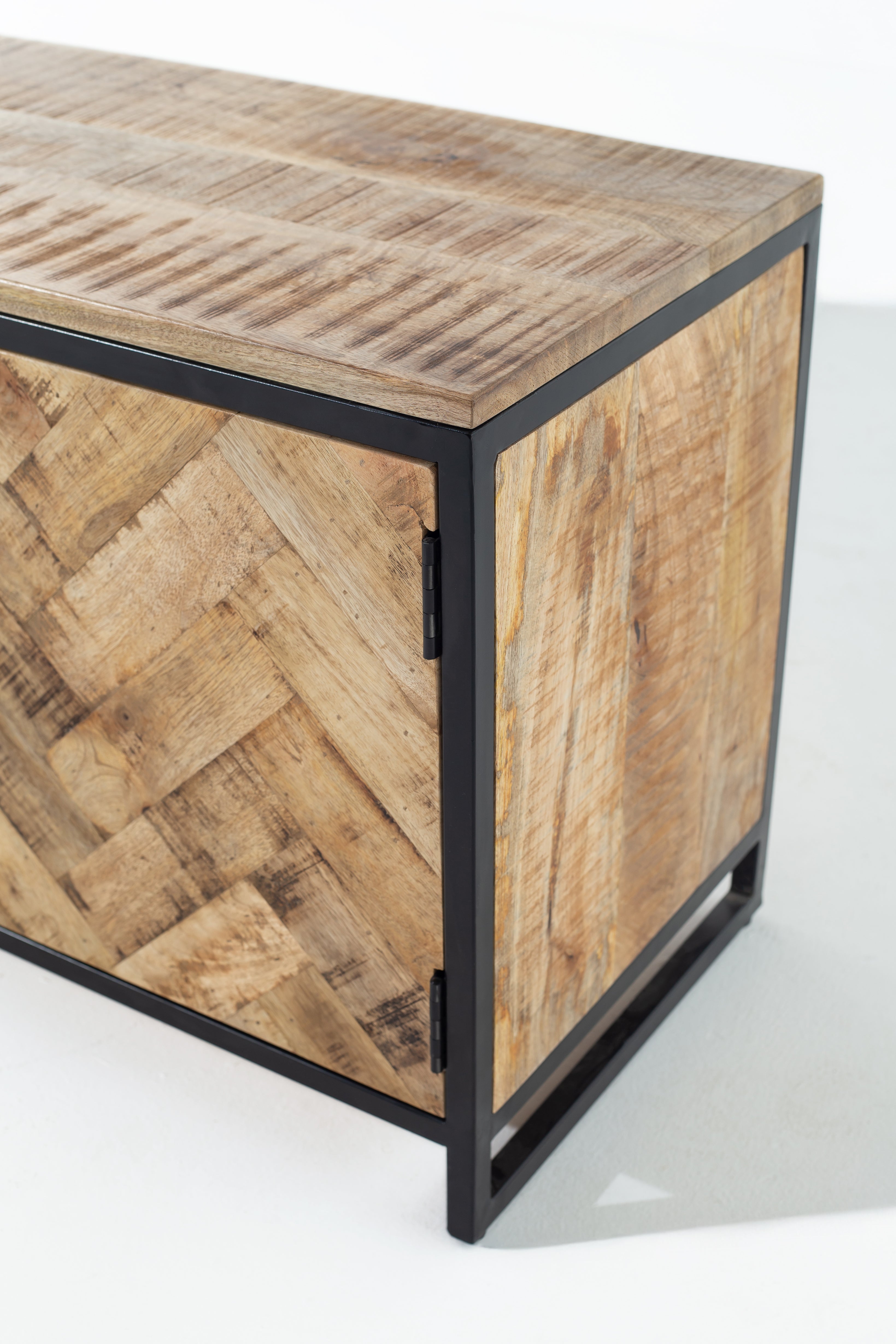 Bring a touch of industrial charm and rustic elegance to your living space with this handcrafted wood and metal TV unit. Expertly designed with natural mango wood in a striking herringbone pattern on both side cabinets, and encased in a sleek matte black metal frame, this media console blends durability with aesthetic appeal. The unit features two closed cabinets, a spacious open shelf ideal for media devices, and six compact drawers for practical storage of remotes, accessories, and more. Perfect for modern, urban, or boho interiors, this TV stand not only organizes but enhances your living room decor with its warm wood grain and functional design. Its timeless construction ensures long-lasting quality, making it a stylish and versatile centerpiece for any entertainment setup.