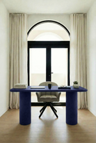 A rich cobalt blue microconcrete surface brings depth and confidence to your workspace, where sculptural cylindrical legs and a smooth matte texture create a striking balance between artistic expression and modern restraint, transforming focused moments into an elevated design experience filled with character, calm, and contemporary elegance.