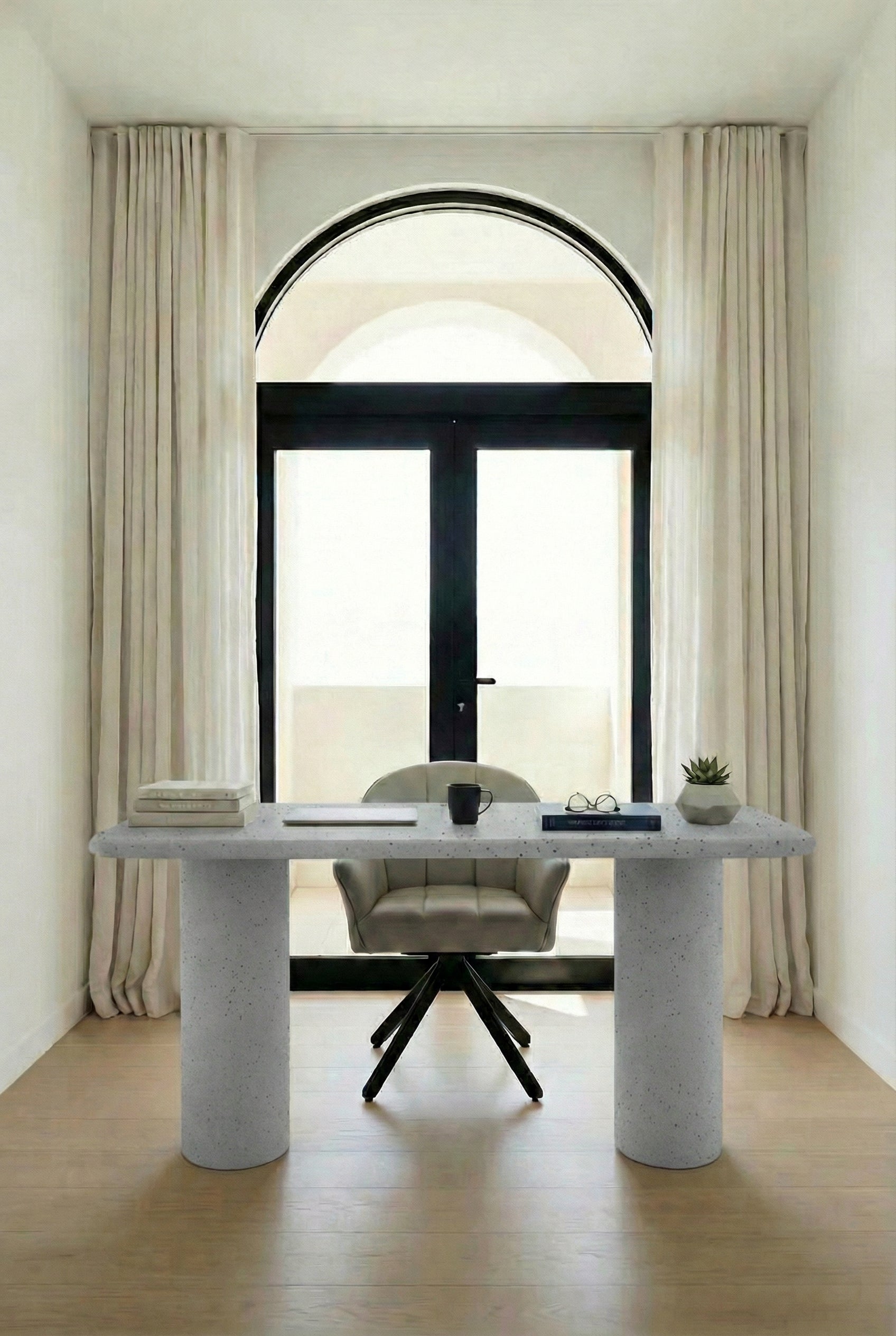 A soft grey microconcrete surface enriched with refined speckled detailing brings subtle texture and contemporary depth to your workspace, while rounded edges and sculptural cylindrical legs create a balanced architectural silhouette that feels modern, grounded, and effortlessly elegant, allowing you to design a calm, light-filled office with timeless character.