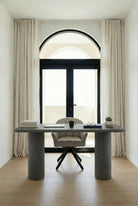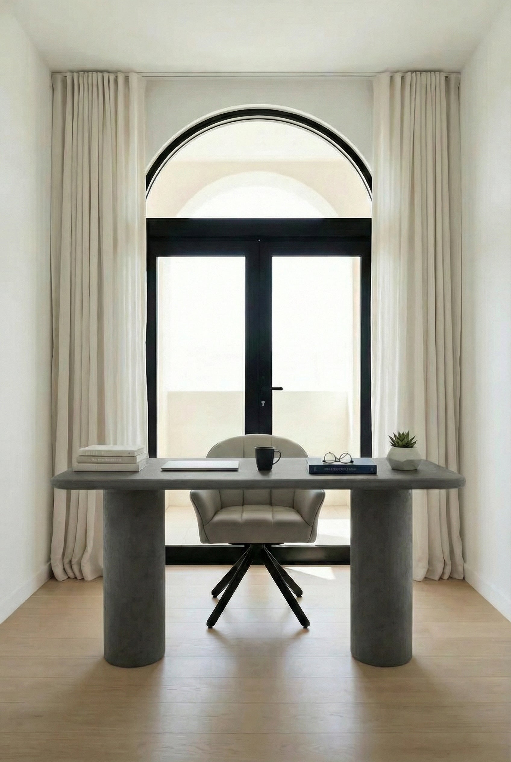 Deep midnight grey microconcrete with a smooth matte texture and sculptural cylindrical legs creates a grounded and sophisticated workspace that enhances focus and intention, bringing a sense of architectural balance, modern elegance, and calm strength to thoughtfully designed home offices and creative interiors.