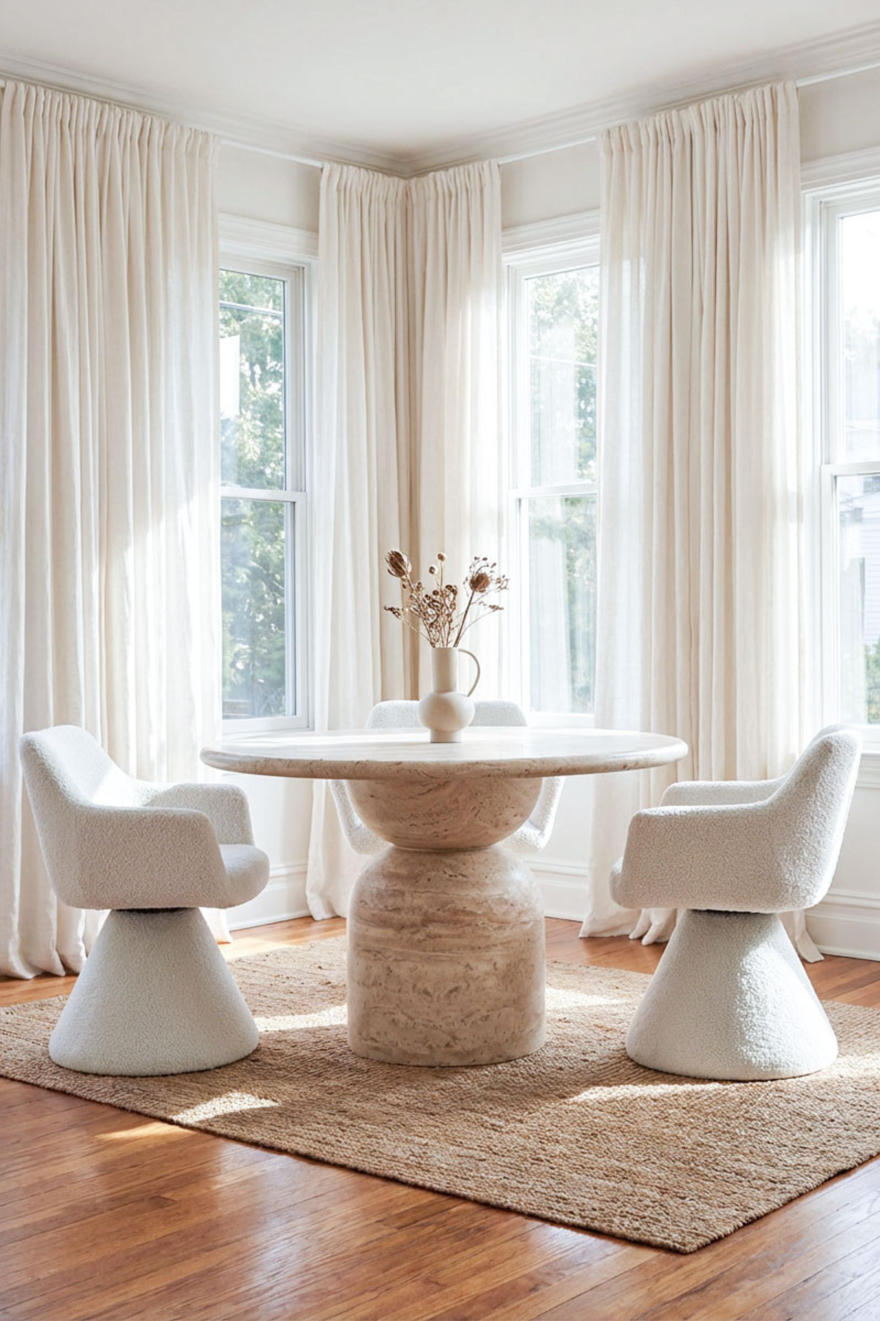 Indulge in effortless elegance with this modern swivel dining chair, wrapped in plush bouclé fabric for a soft, tactile experience. Its sculpted silhouette, complete with gently curved armrests and a conical base, adds artistic charm to any dining or lounge setting. Designed for both comfort and movement, the 360° swivel feature brings flexibility to everyday seating. Perfect for contemporary, minimalist, or Scandinavian spaces, it offers a luxurious blend of texture, style, and functionality.