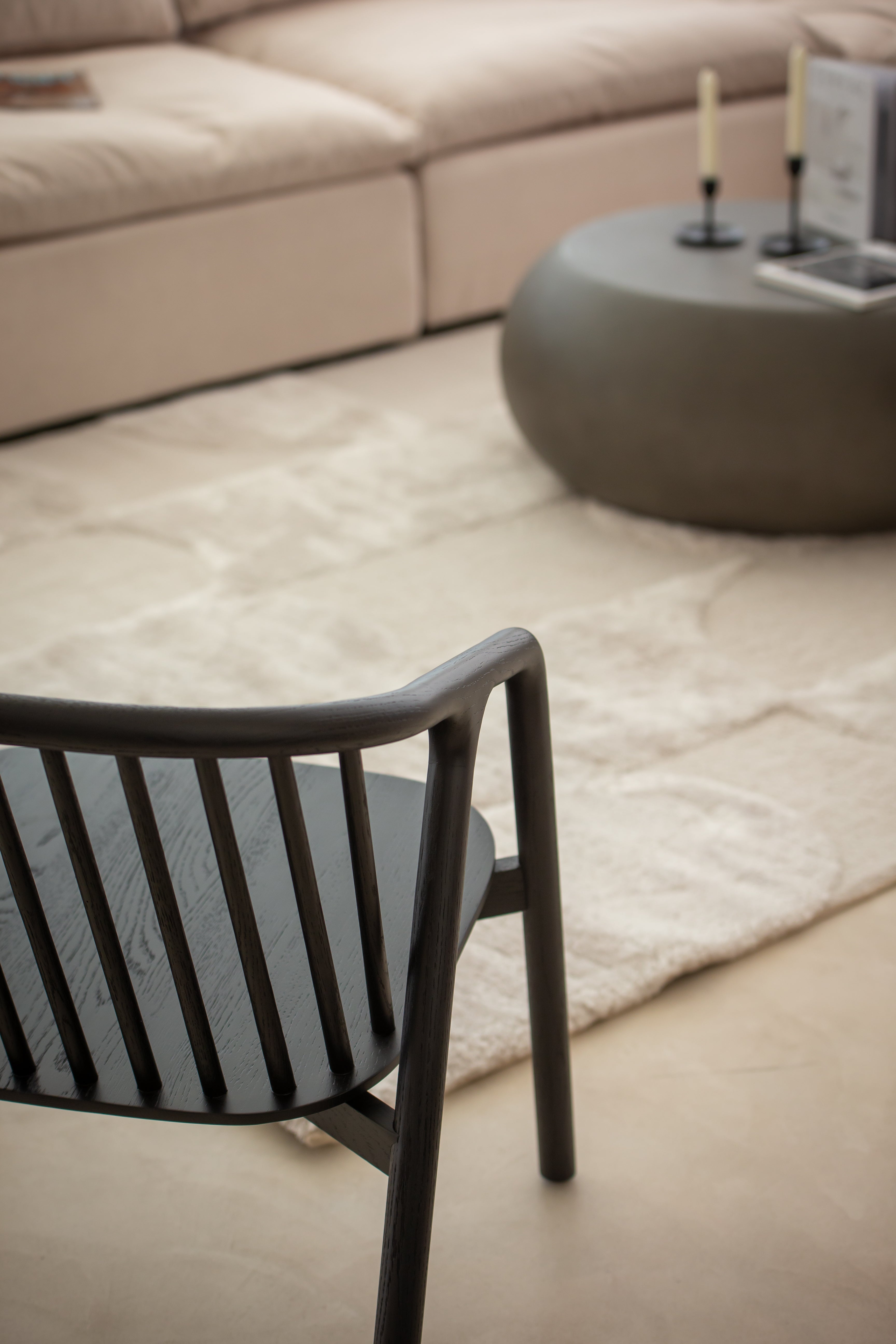 You settle into the curved embrace of a sculpted oak frame, its deep black finish exuding modern elegance. Vertical slats form a striking backrest, offering support while maintaining an airy aesthetic. Beneath you, a smooth wooden seat reveals the organic beauty of natural grain, seamlessly blending comfort with craftsmanship. Whether styled in a cozy reading nook or as a statement lounge chair, this refined silhouette transforms your space with its minimalist charm.