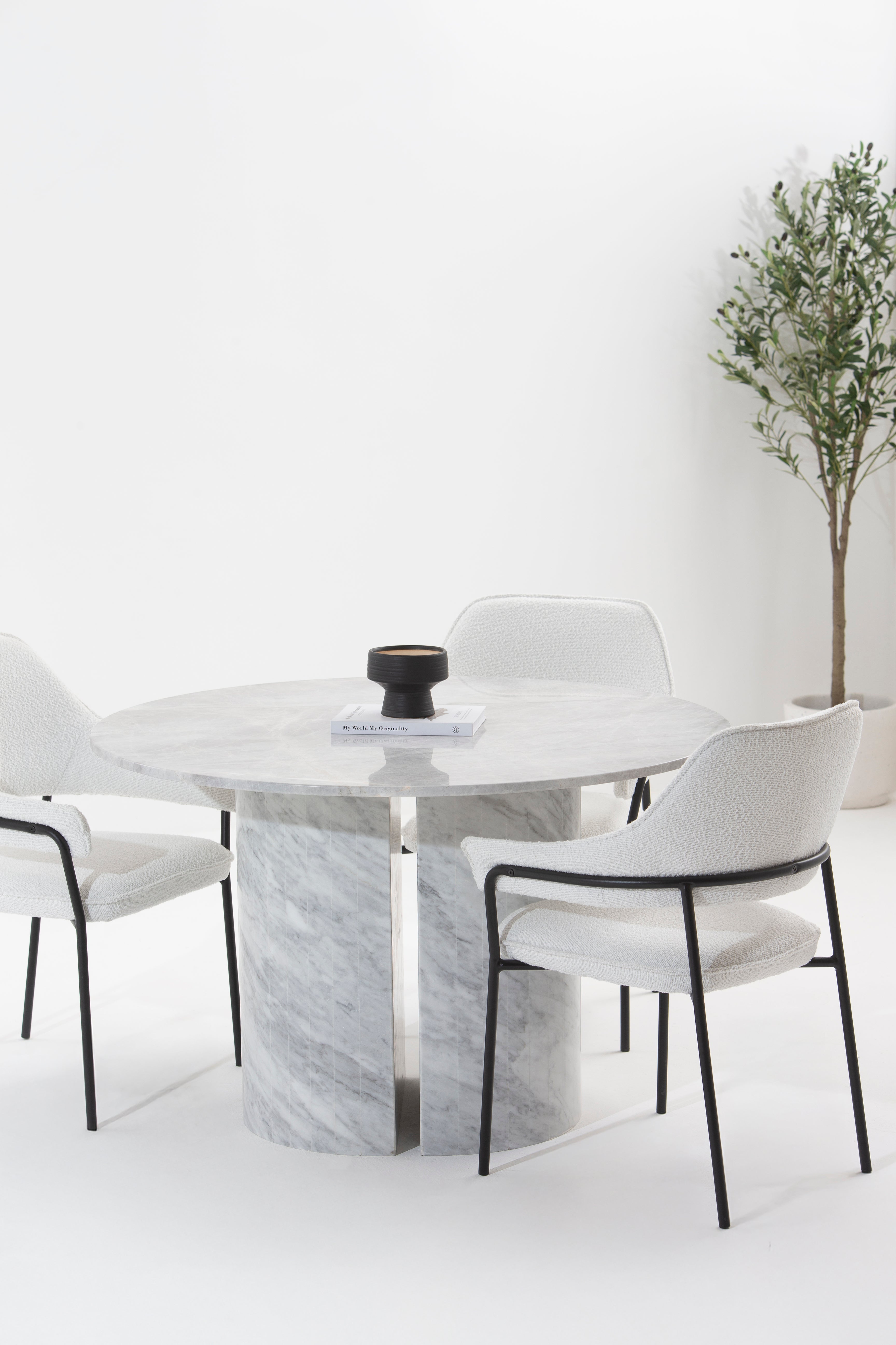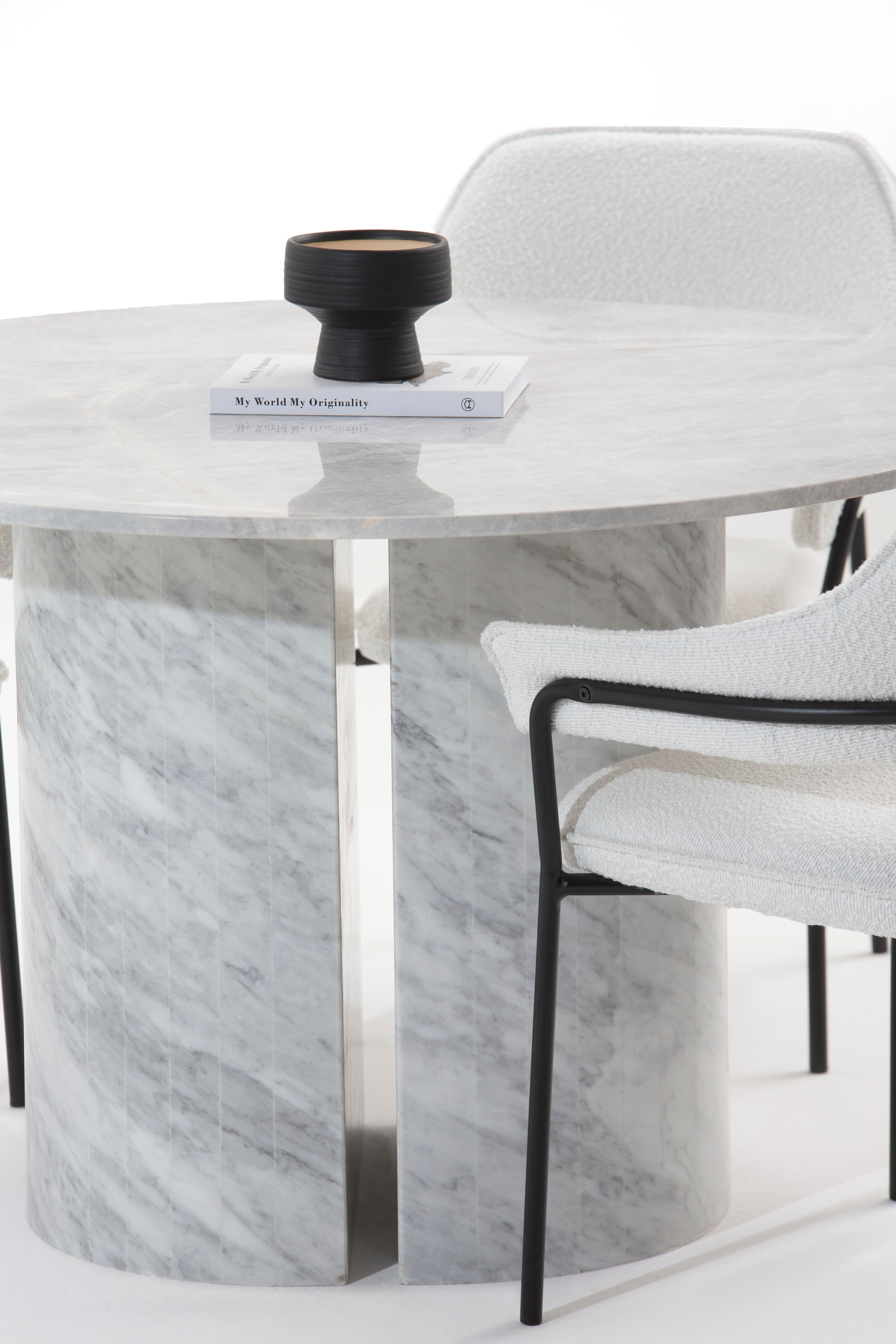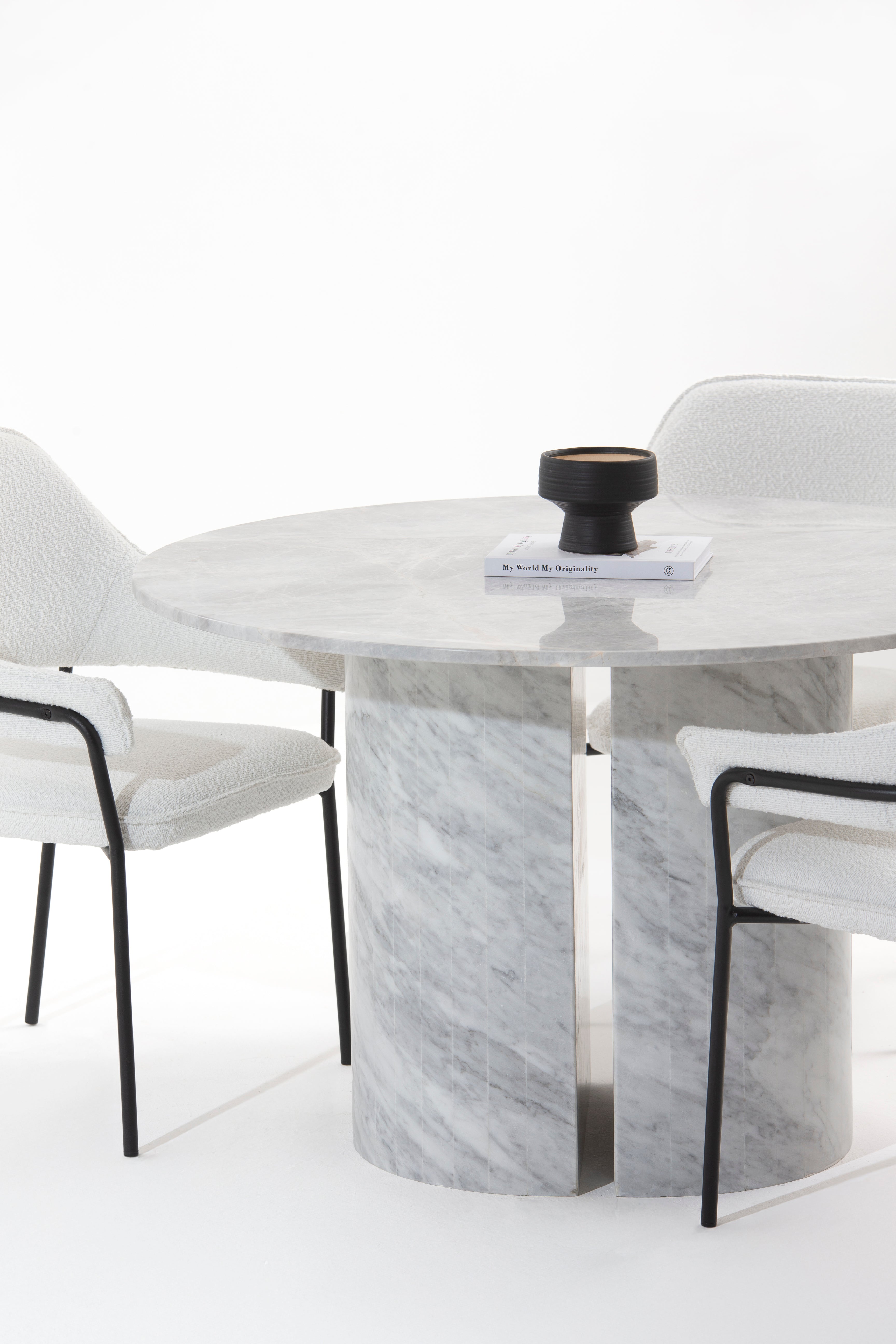 A statement piece crafted from luxurious Fior De Pasco marble. Featuring a striking round tabletop with soft grey veining and a sculptural base composed of two half-moon marble pedestals, this table blends timeless elegance with architectural sophistication. Its natural stone texture and cool, silvery tones add depth and serenity to any modern or minimalist dining space. As the centerpiece of your room, the Arcus Table invites conversation, style, and unforgettable gatherings—where your taste becomes the design language.