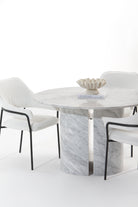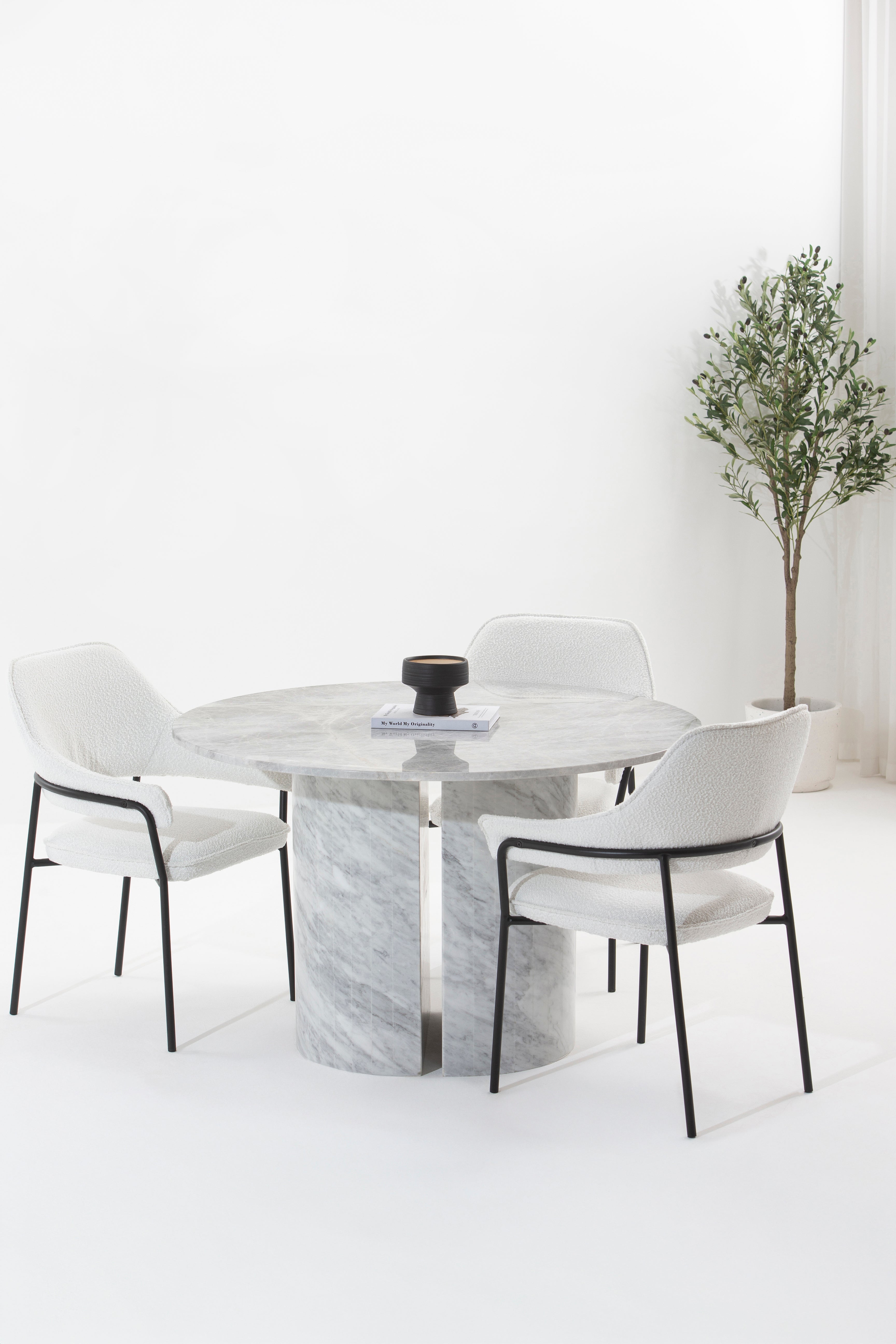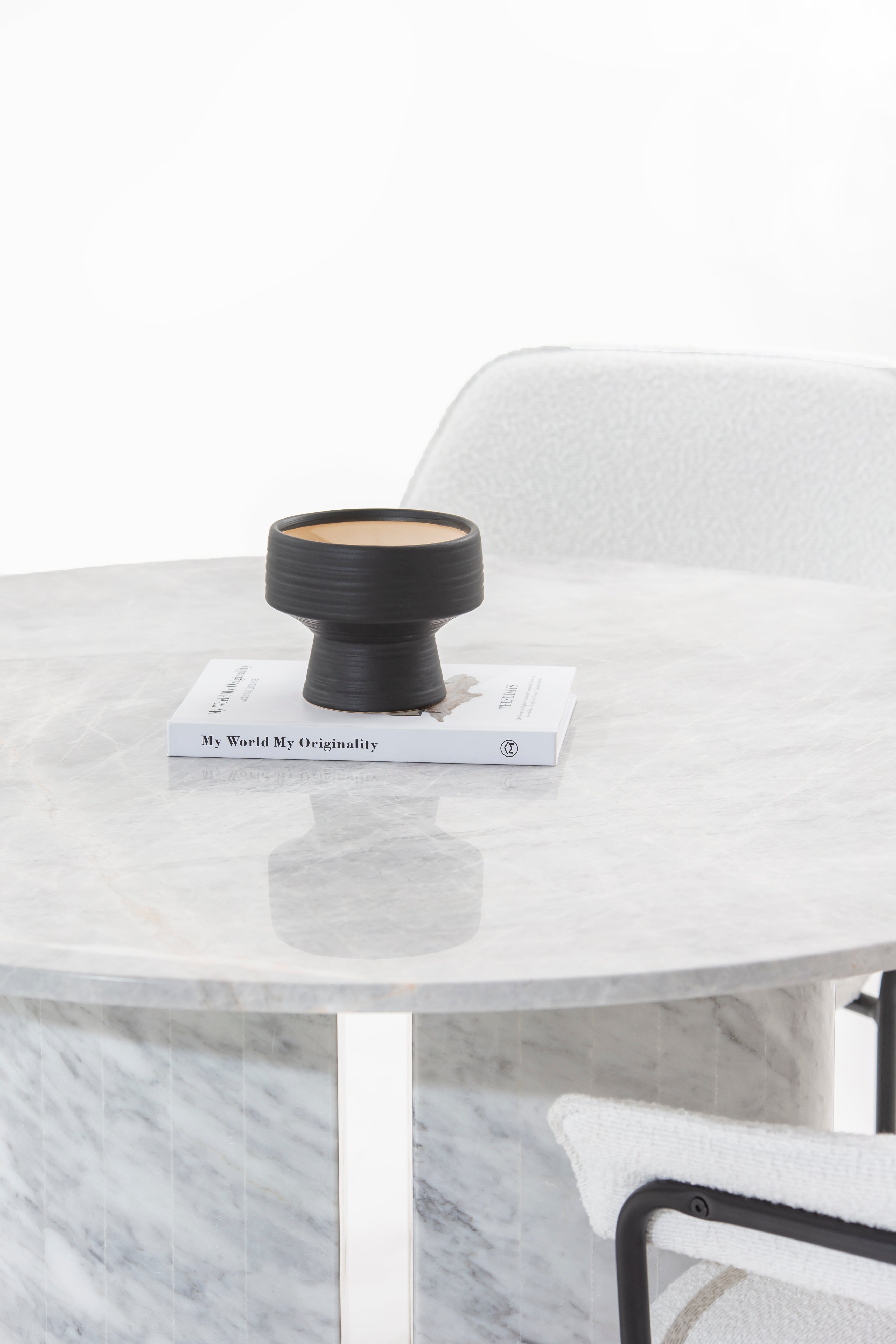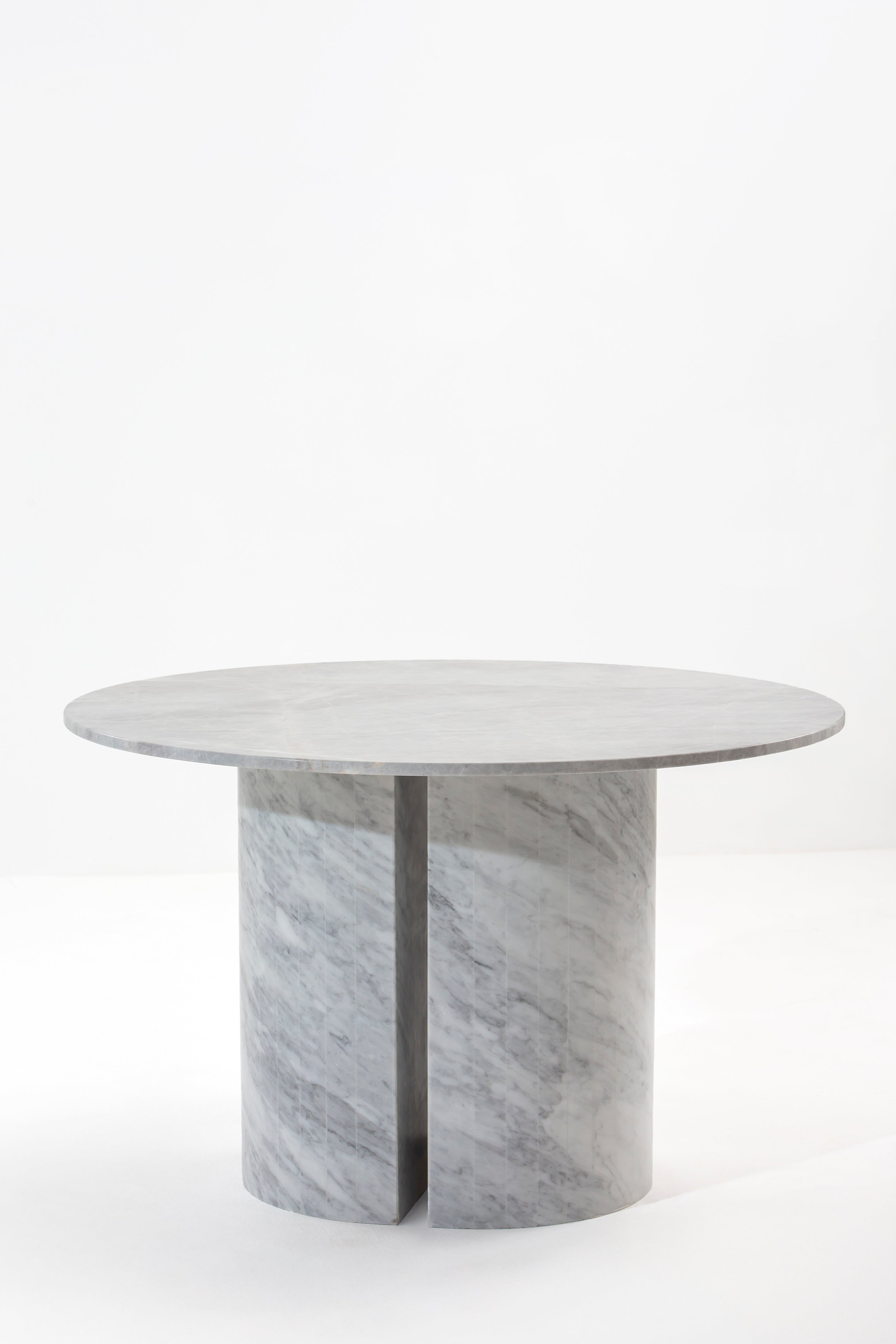 A statement piece crafted from luxurious Fior De Pasco marble. Featuring a striking round tabletop with soft grey veining and a sculptural base composed of two half-moon marble pedestals, this table blends timeless elegance with architectural sophistication. Its natural stone texture and cool, silvery tones add depth and serenity to any modern or minimalist dining space. As the centerpiece of your room, the Arcus Table invites conversation, style, and unforgettable gatherings—where your taste becomes the design language.