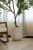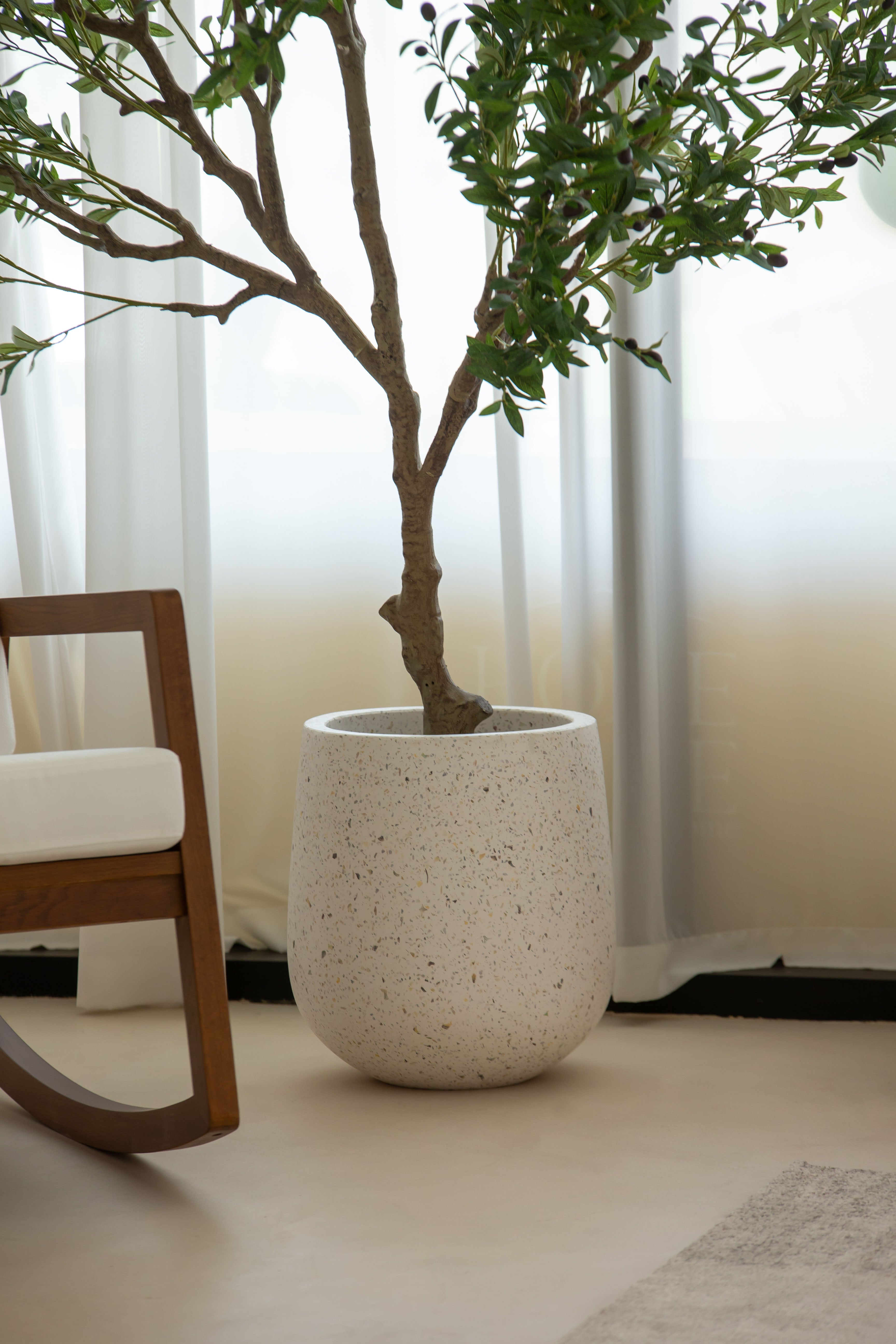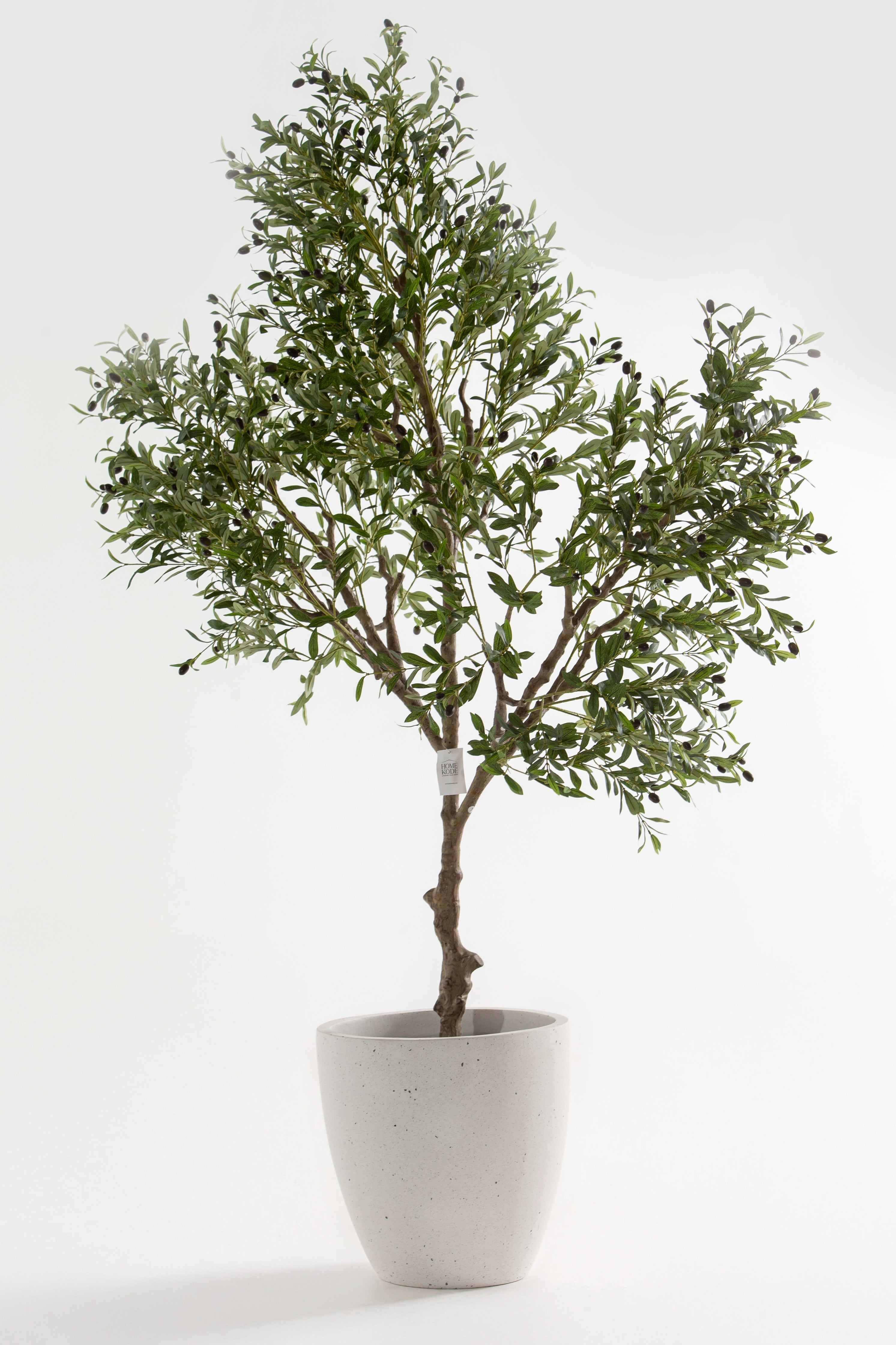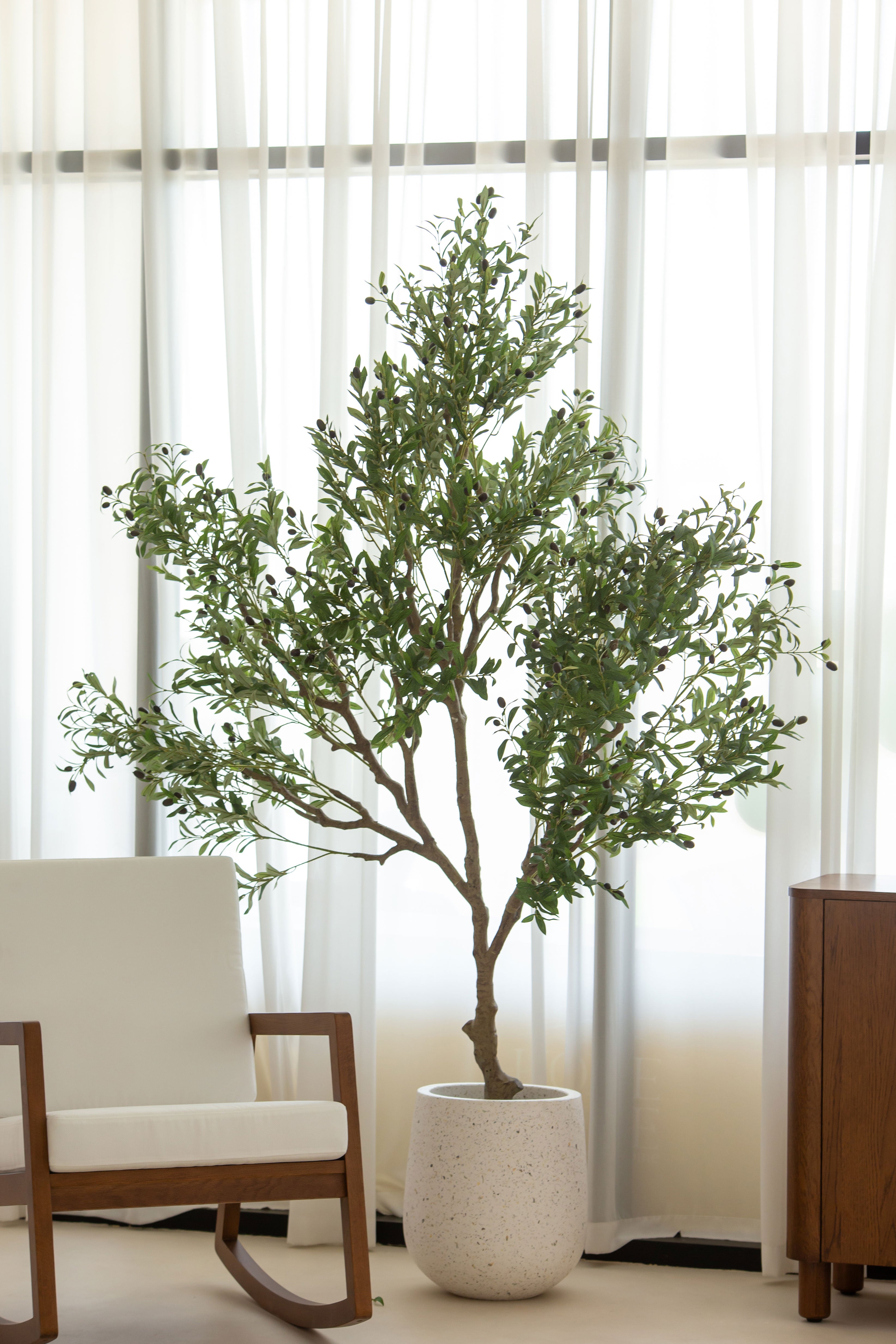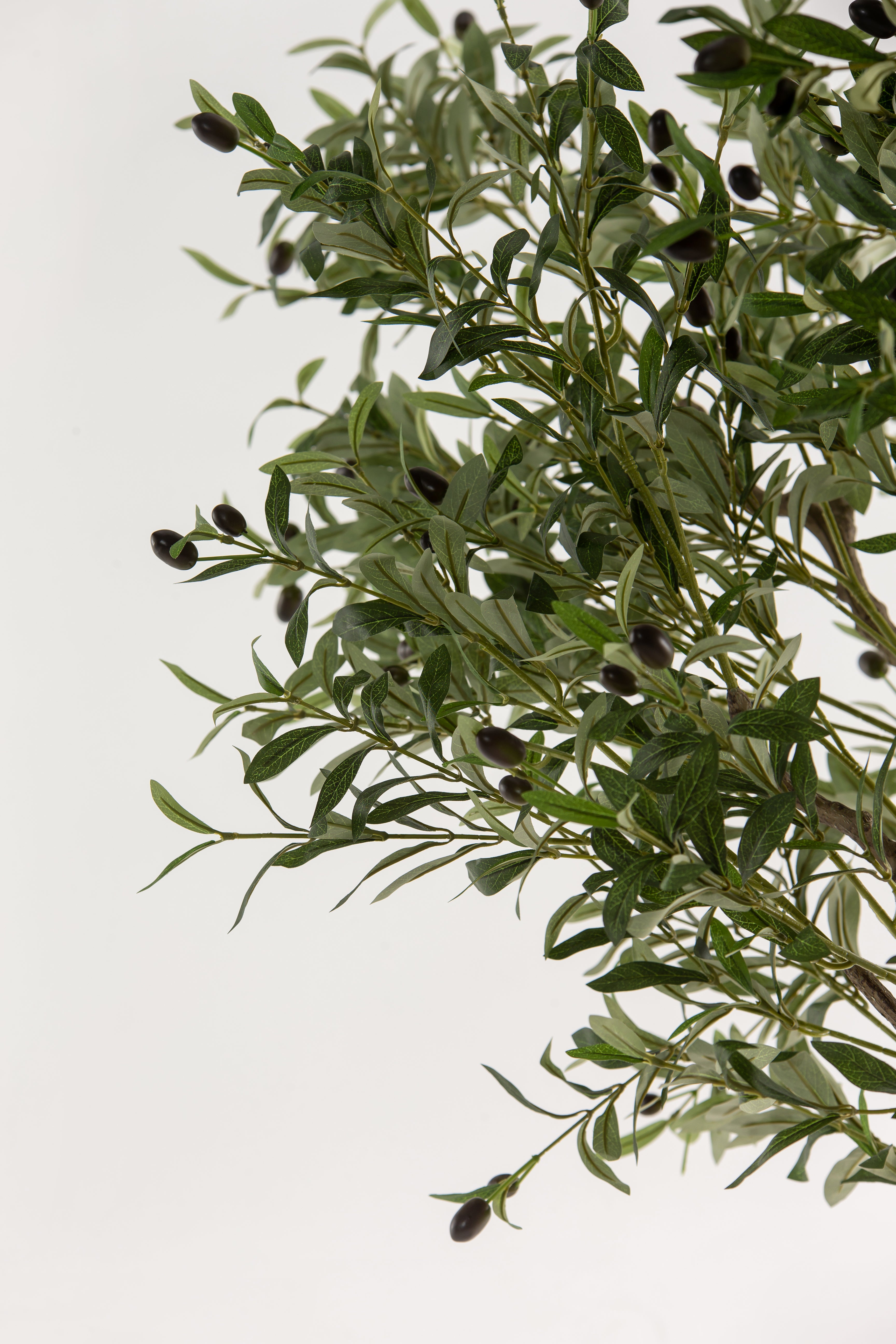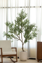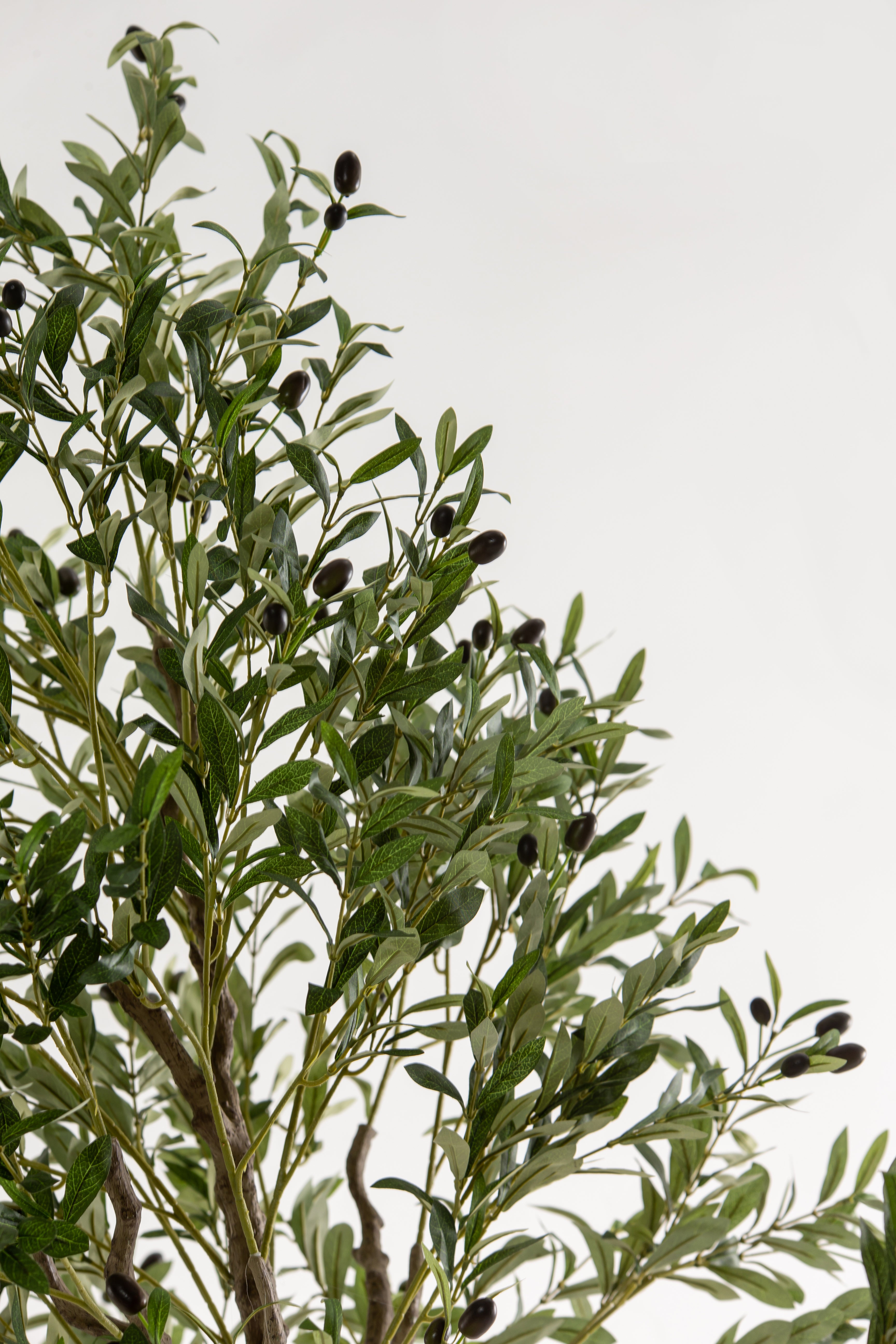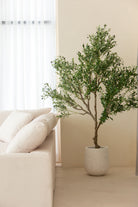 This artificial olive tree features a gracefully branching structure with lifelike green leaves and delicately scattered black olives, offering a refined take on Mediterranean greenery. Its full, asymmetrical silhouette adds volume and character to interiors while maintaining a natural, airy feel. The soft foliage texture and botanical realism make it an ideal statement piece for bringing height, depth, and organic movement to styled spaces—all without the need for watering or sunlight.