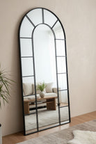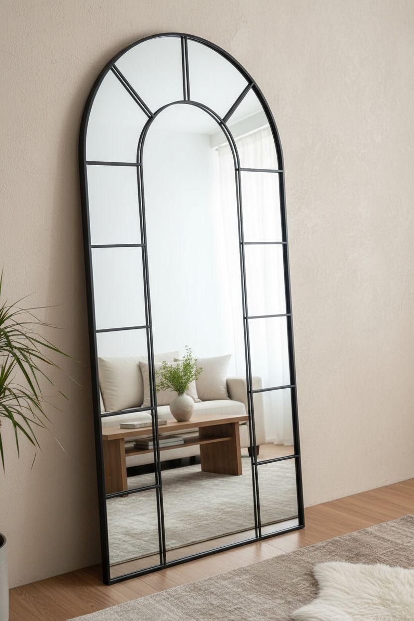 Add timeless elegance to your space with this black arched mirror, designed to resemble a classic window frame. The tall, curved silhouette and grid detailing create an architectural focal point that enhances light and depth in any room. Crafted with a sleek black metal frame, it complements modern, industrial, or minimalist interiors. Whether placed in a hallway, bedroom, or living area, it effortlessly opens up your space with refined sophistication and contemporary charm.