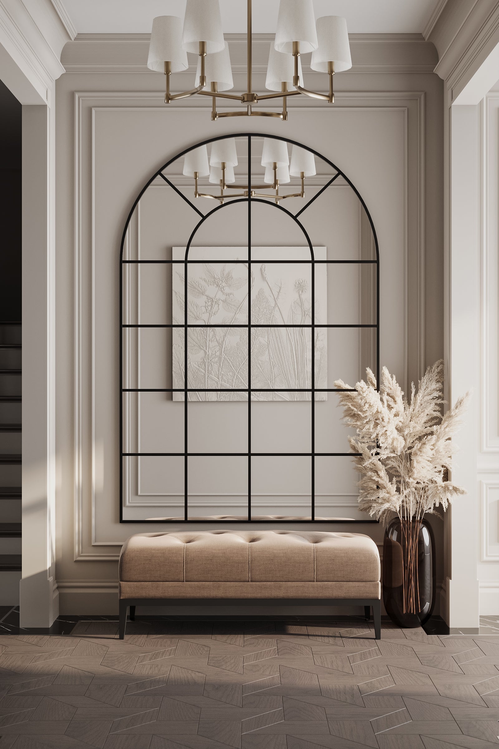 Bring architectural elegance to your interiors with this Black Arched Full-Length Window Mirror. Inspired by classic windowpane designs, this mirror features a striking black metal frame with symmetrical grid lines and a rounded arch top that adds visual depth and sophistication to any room. Whether used in an entryway to expand light, as a statement piece in a living room, or to reflect space in a narrow hallway, this mirror offers both style and function. The tall, slender silhouette is perfect for full-length reflection, while the bold black finish makes it a versatile accent across various design aesthetics—from modern classic to industrial or transitional.