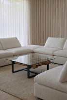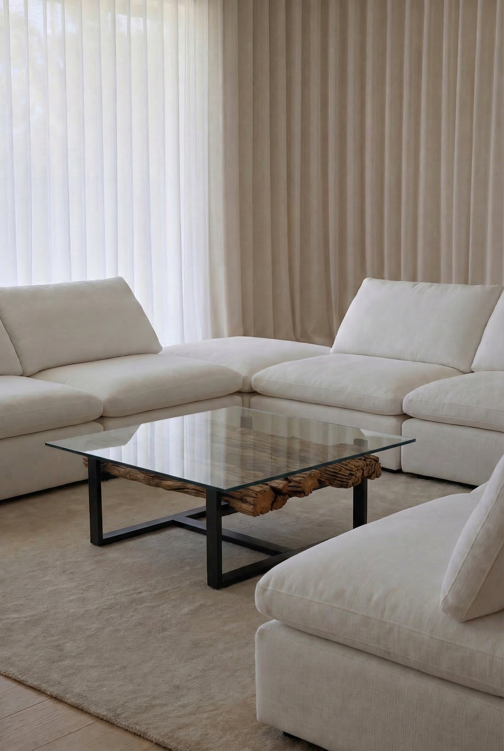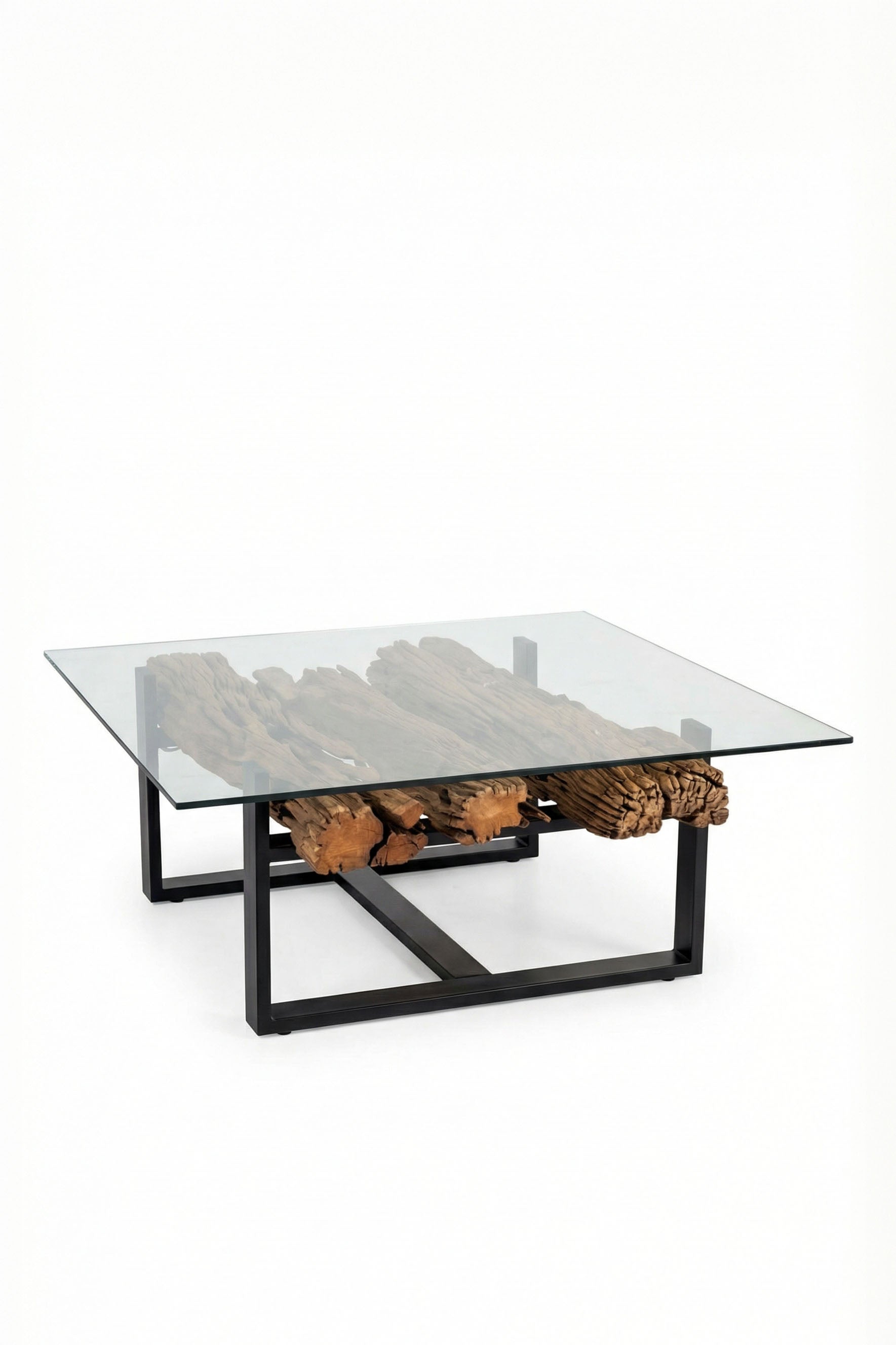 This modern glass and wood coffee table is the perfect addition to any living room. The clear glass top provides a clean and contemporary look, while the wood pieces add a touch of warmth and sophistication. The table is the perfect size for displaying books, magazines, remote controls, and other household items. It is also sturdy enough to support drinks and snacks.