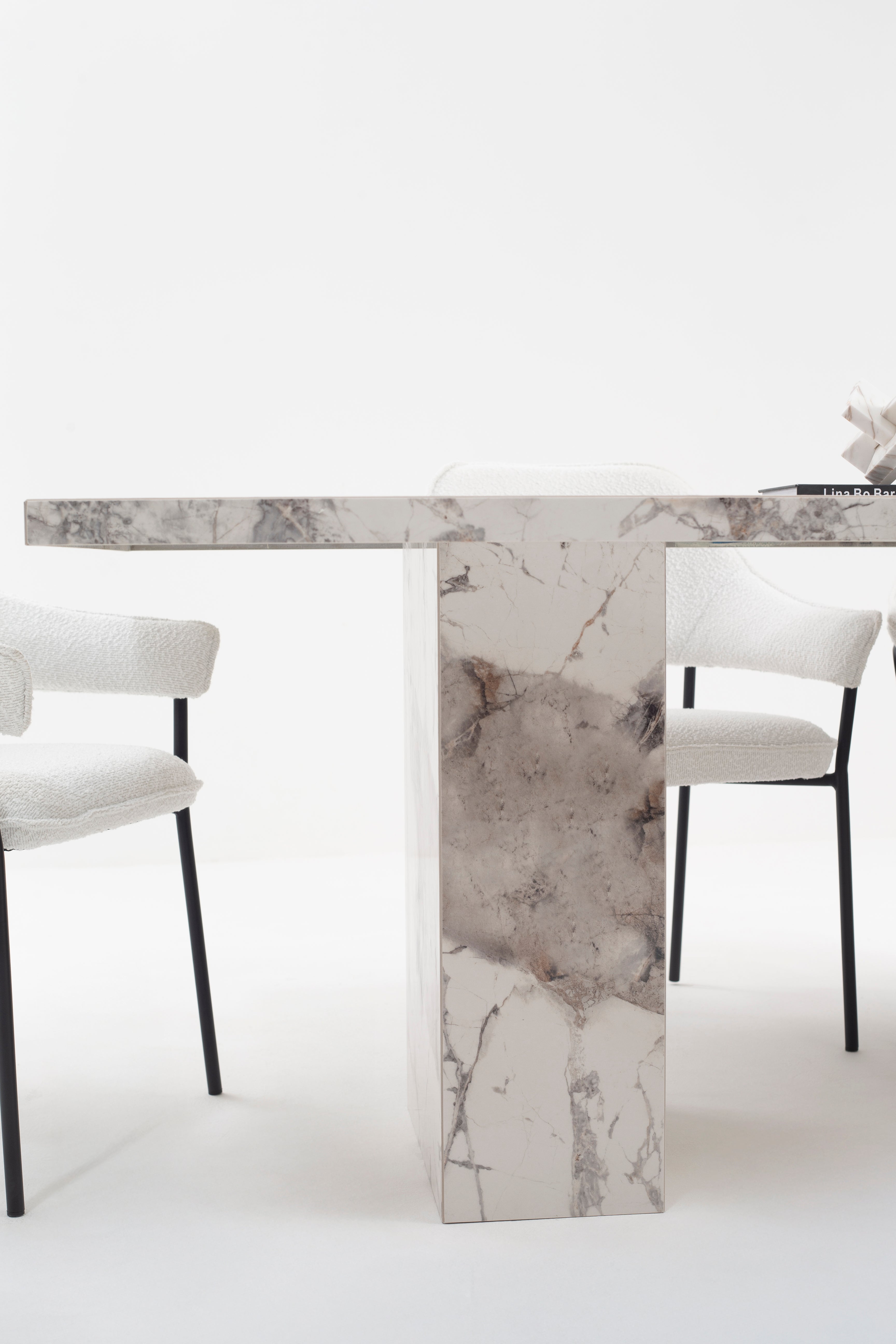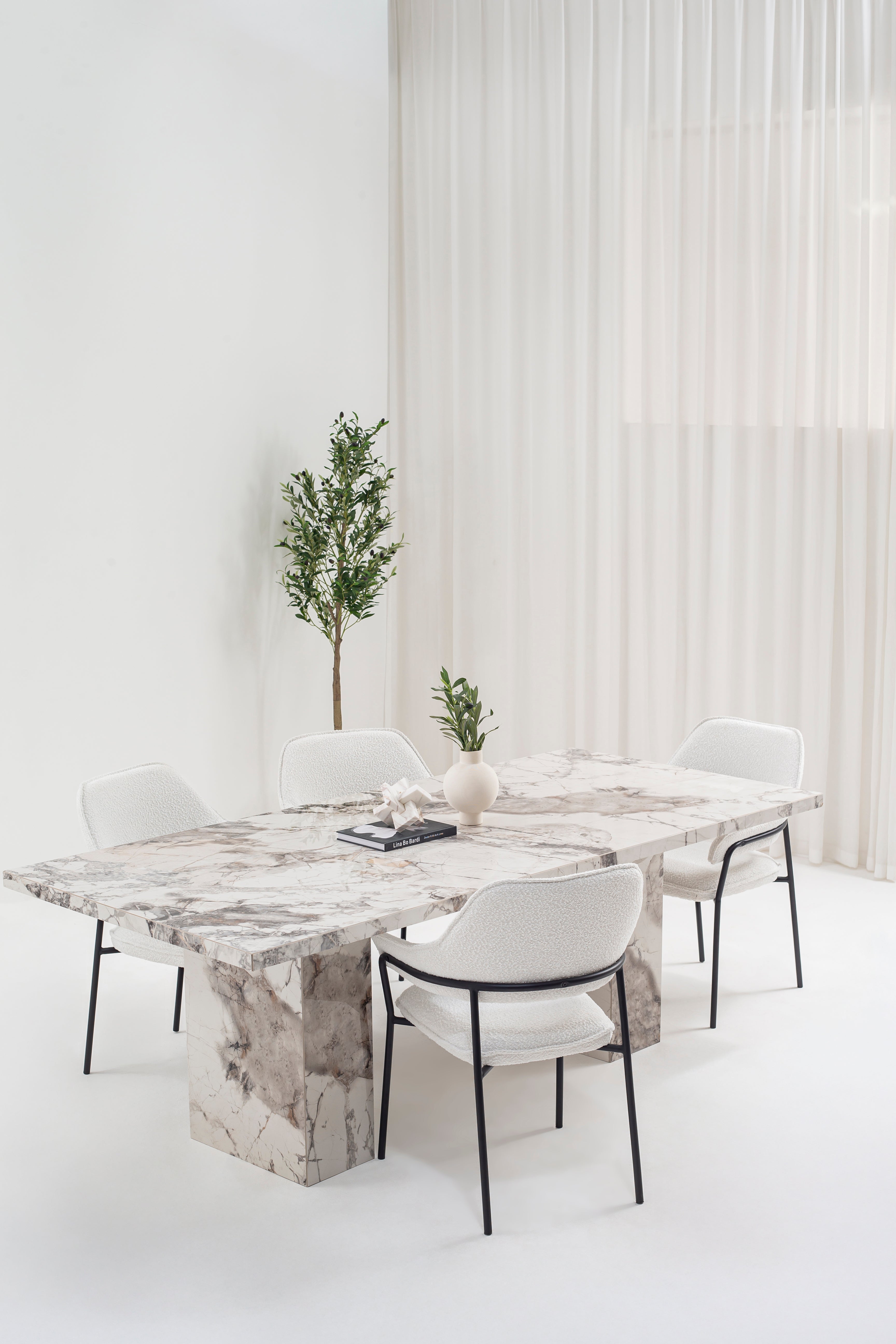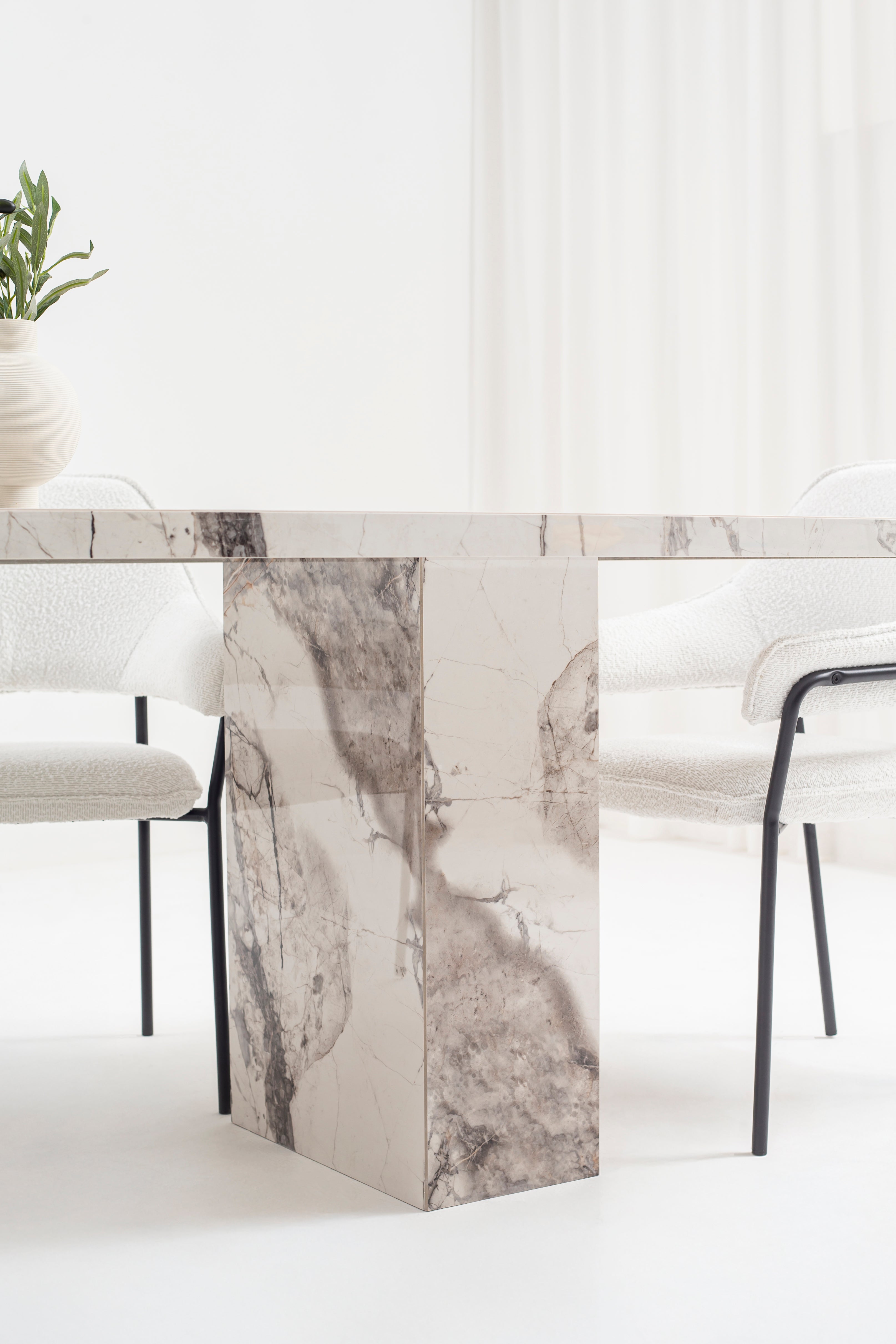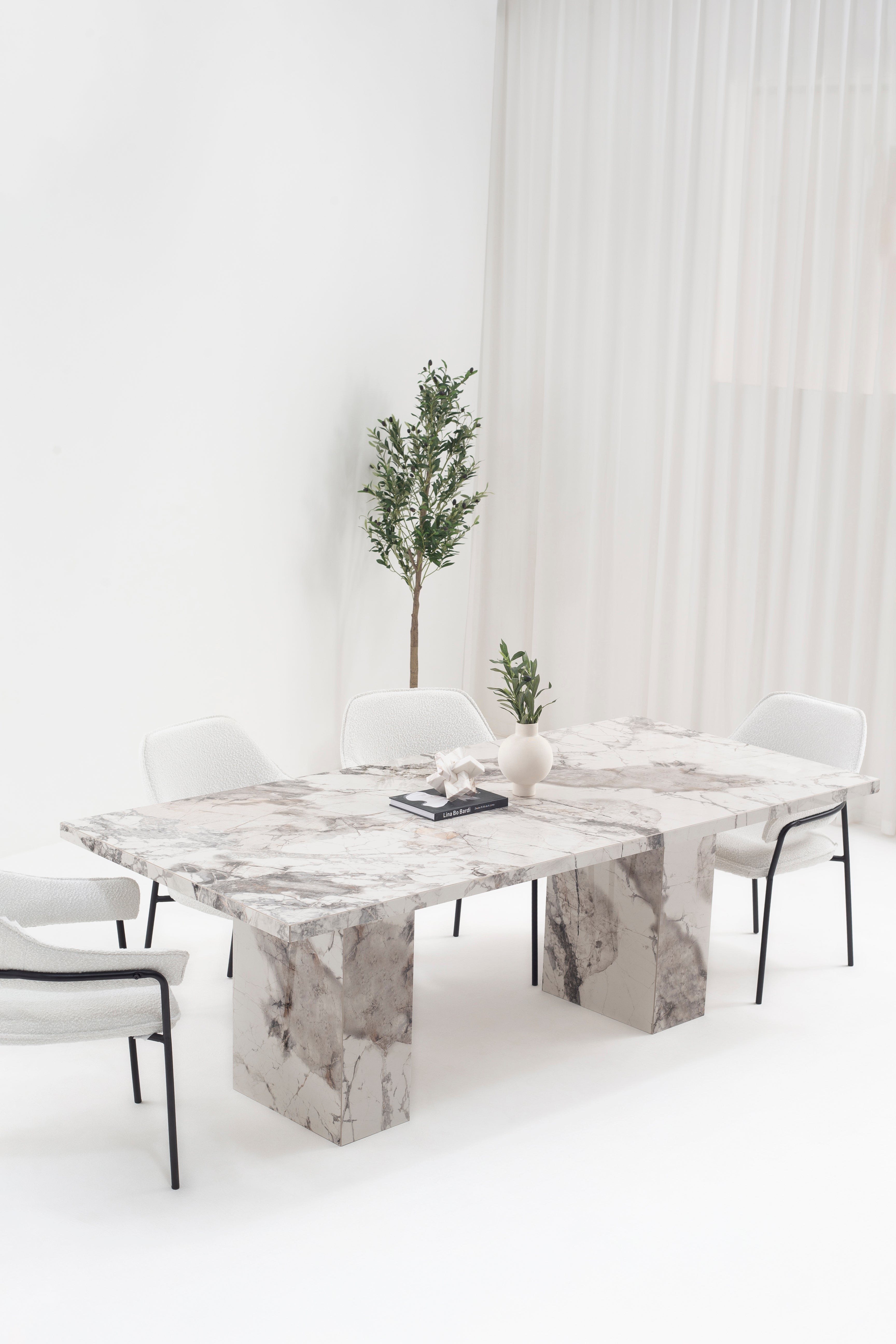A bold fusion of contemporary design and stone-inspired elegance. This Dining Table, crafted from durable Blue Jeans Finish Porcelain, captures the rich texture and denim-toned veining of natural stone in cool greys and soft whites, evoking the casual sophistication of vintage blue jeans. Its clean-lined rectangular form and sculptural dual block legs offer a minimalist, architectural presence. With a smooth, low-maintenance surface, this table balances form and function, making it the perfect statement piece for modern interiors.