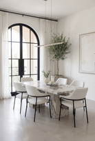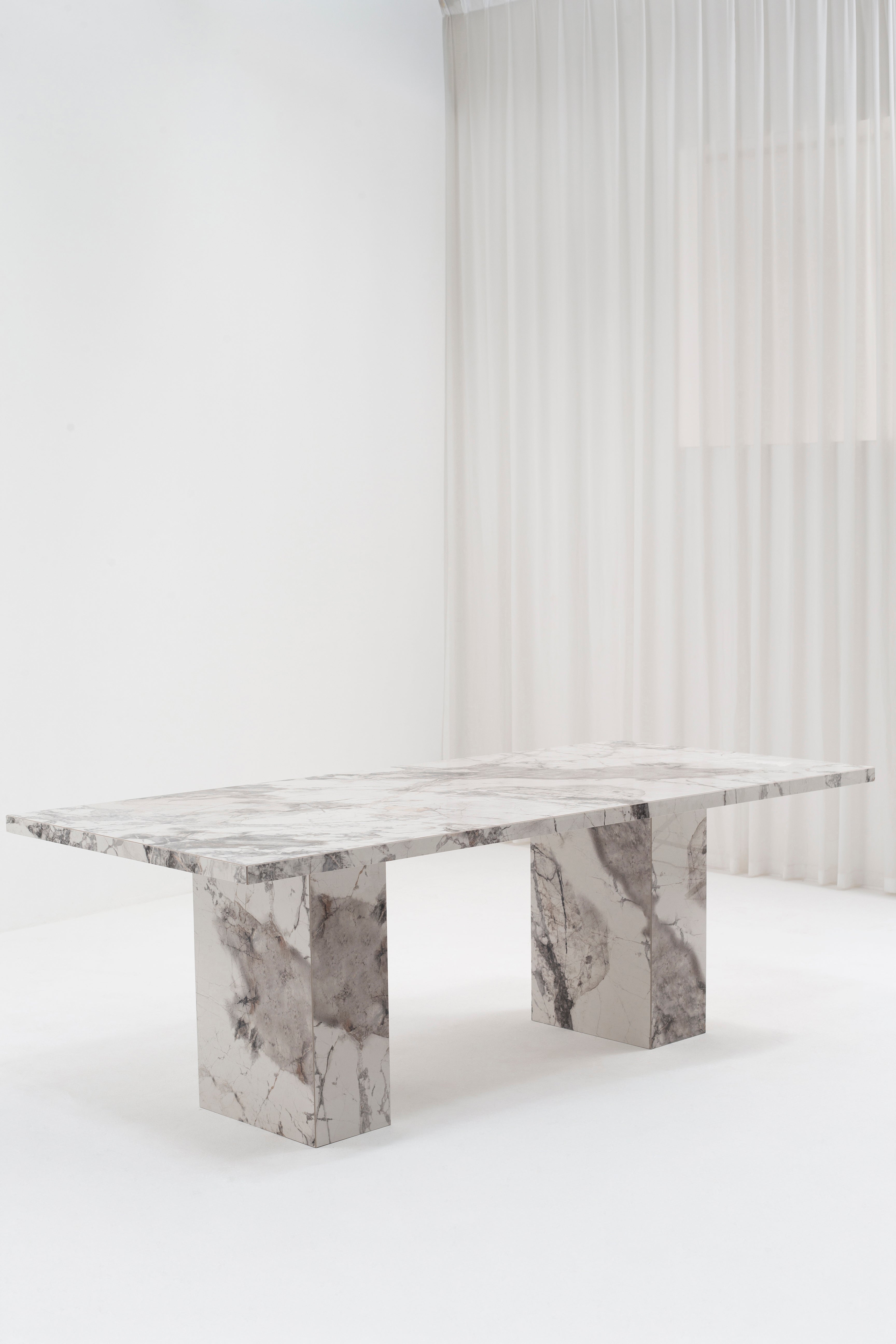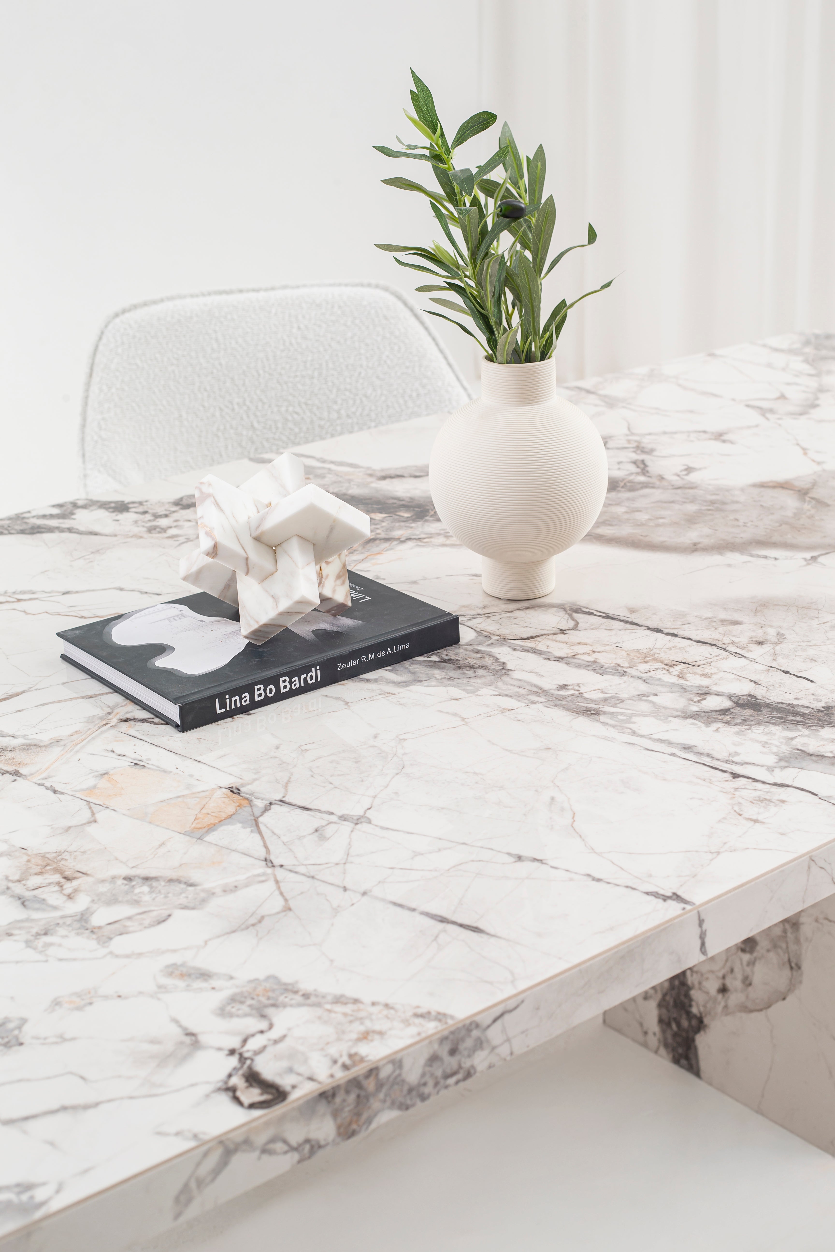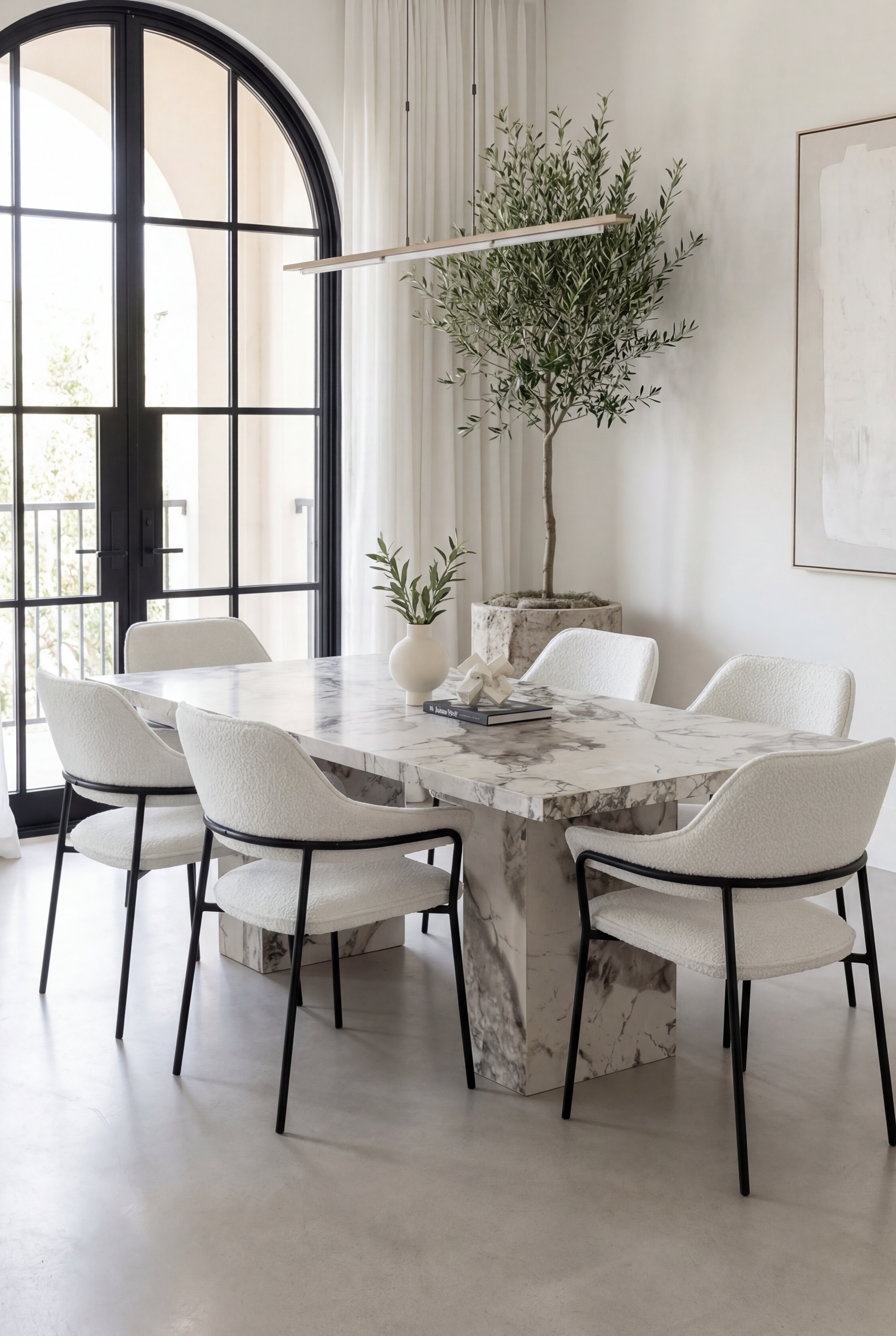 A bold fusion of contemporary design and stone-inspired elegance. This Dining Table, crafted from durable Blue Jeans Finish Porcelain, captures the rich texture and denim-toned veining of natural stone in cool greys and soft whites, evoking the casual sophistication of vintage blue jeans. Its clean-lined rectangular form and sculptural dual block legs offer a minimalist, architectural presence. With a smooth, low-maintenance surface, this table balances form and function, making it the perfect statement piece for modern interiors.