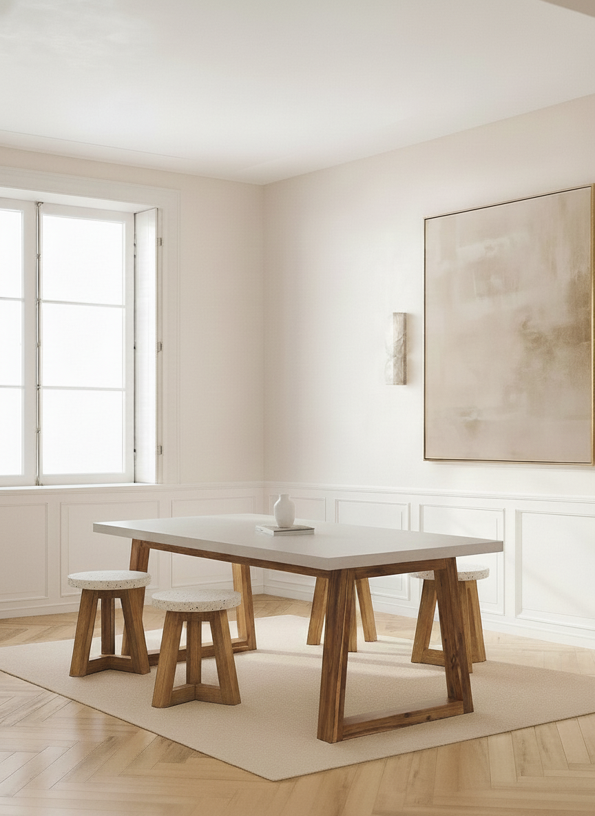 Step into your dining space and feel the harmony between nature and modern elegance with this beautifully crafted piece. Its sleek rectangular top, made of smooth concrete, reflects light softly, adding a refined touch to your meals. The natural wood base, with its clean lines and warm grain patterns, contrasts the cool gray tone of the surface, creating a perfect balance of warmth and modernity. Every curve and angle is designed to draw your eye inviting you to gather, connect, and make memories. The tactile texture of concrete and the organic feel of solid wood come together in a minimalist aesthetic that fits seamlessly into any contemporary home.