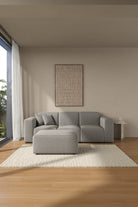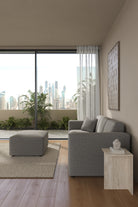 Add a refreshing, airy vibe to your living room with the cool sophistication of silver mist fabric. Its soft touch pairs beautifully with the modular form, while the ottoman enhances versatility, offering comfort and understated elegance.
