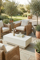 Designed for outdoor use, this minimalist microconcrete coffee table features a clean rectangular form with a low, solid profile. The smooth matte surface has a lightly textured finish that highlights the natural character of the material, while the off white tone keeps the look calm and neutral. Its block-style construction provides a stable surface for everyday outdoor use, suitable for books, tableware, or decorative pieces. Well suited for terraces, patios, and covered garden lounges, it works comfortably within minimalist, Japandi, and contemporary outdoor settings.