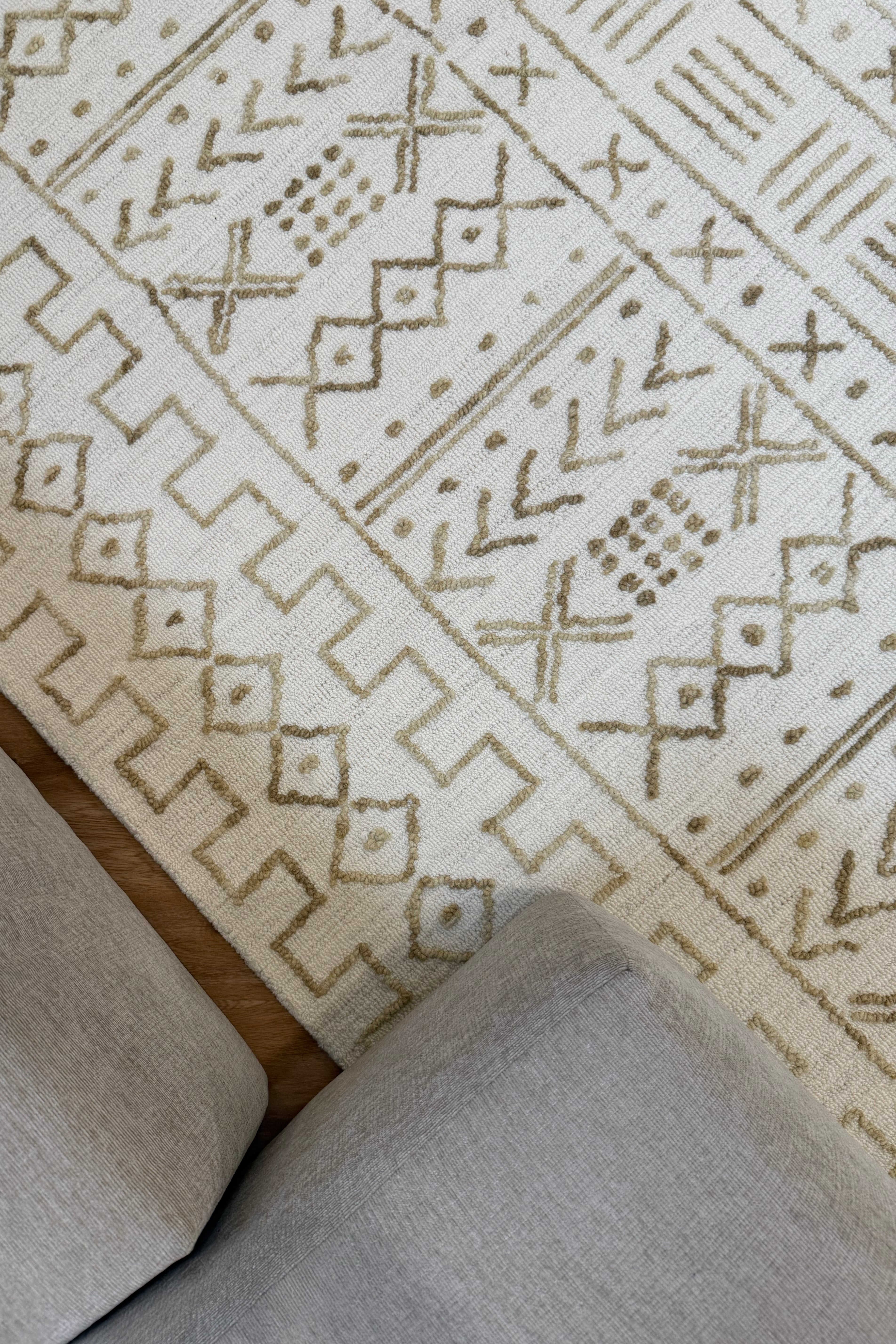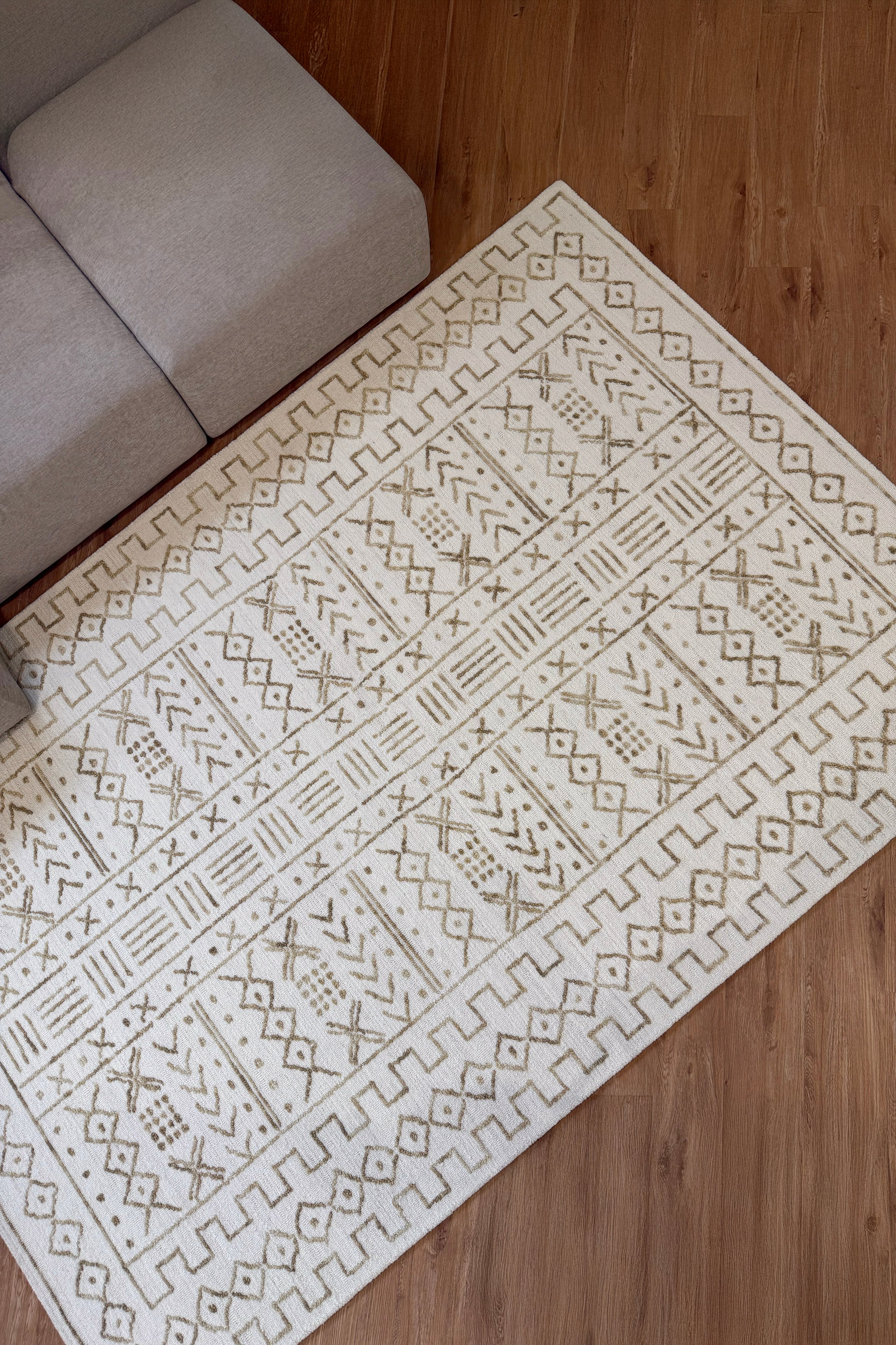 This rug is crafted from a premium wool and cotton blend for a soft, durable finish. The geometric tufted patterns stand out on a neutral base, adding warmth and texture to your floors. Its rectangular silhouette and artisan hand-tufted texture make it ideal for living rooms, bedrooms, or entryways. The intricate lines and minimal tones complement both modern and bohemian interiors effortlessly. A statement in craftsmanship and calm, this piece brings quiet character to your home.