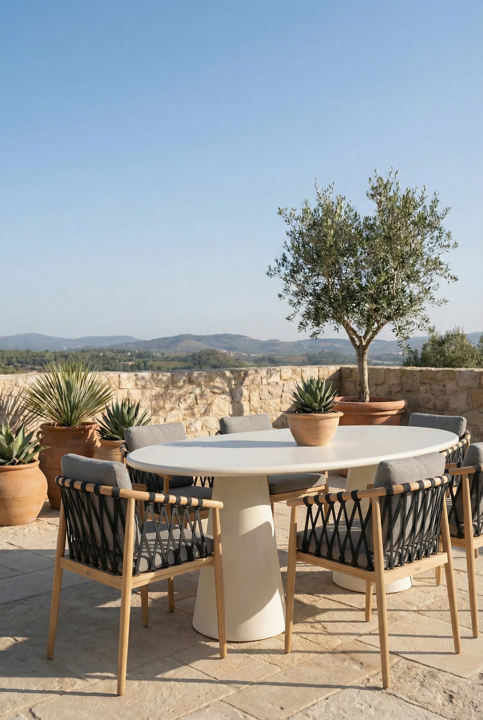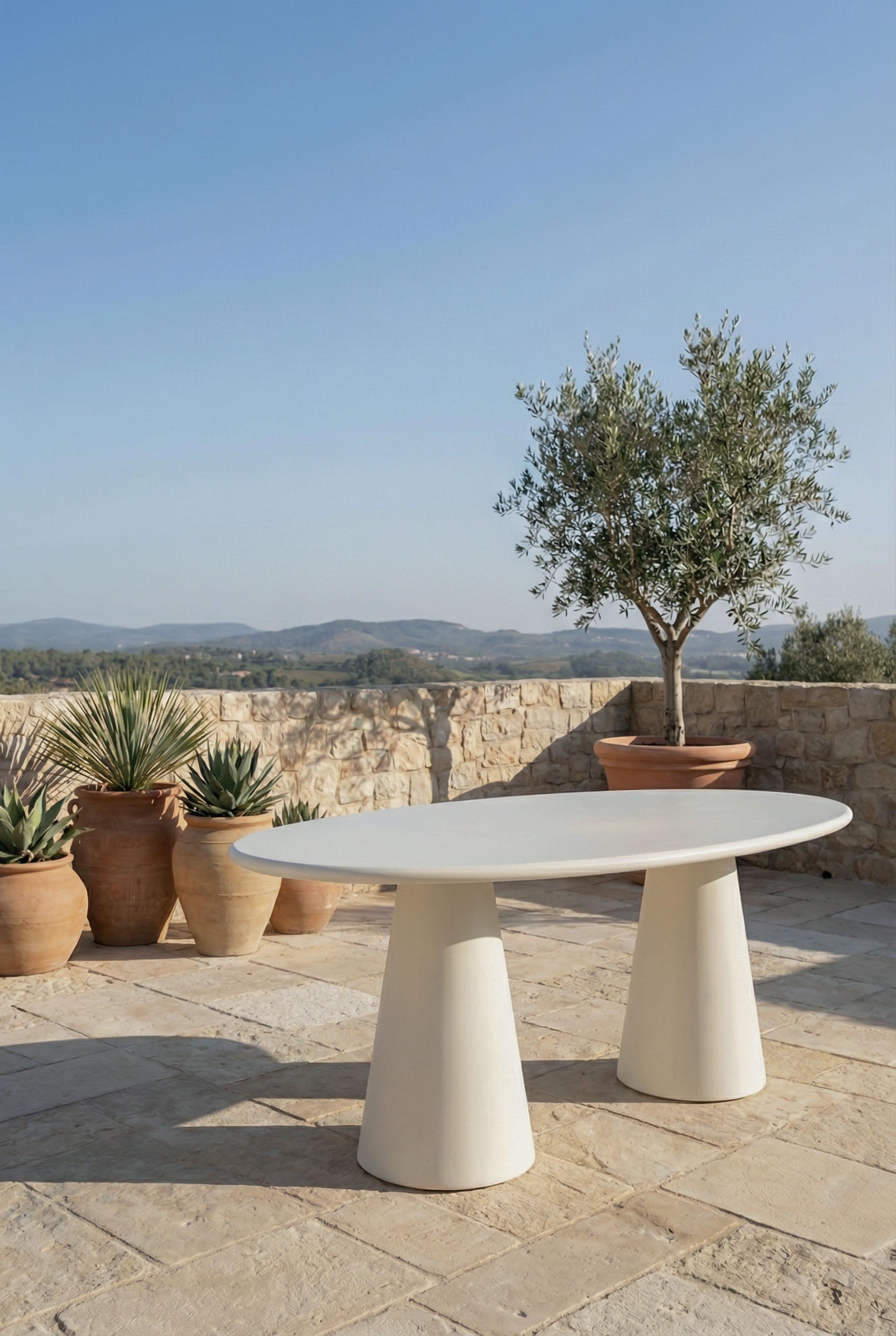 Elevate your Outdoor dining experience with this sculptural micro concrete dining table where organic form meets minimalist design. Featuring a smooth, matte surface in a soft ivory hue, its dual cone shaped bases offer visual balance and architectural flair. The oval top provides generous seating while maintaining a refined, airy presence in your space. Whether you're hosting intimate dinners or slow morning coffees, this micro cement dining table becomes the quiet centerpiece of your modern home beautifully grounding every gathering with texture, tone, and timeless style.