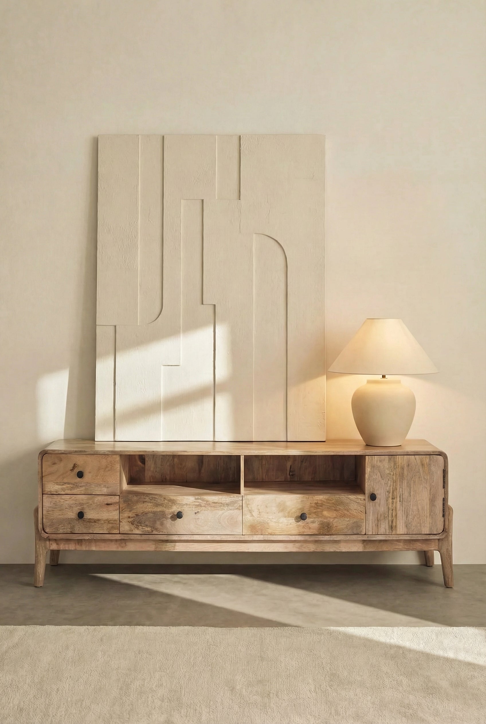 Blaine Wooden TV Unit is crafted from warm natural wood, featuring a low streamlined silhouette with open shelving and smooth drawers for a balanced modern look. Soft beige and honey toned grain patterns highlight its organic texture, while rounded edges create a refined architectural presence. Designed to anchor your entertainment space with understated elegance, it brings natural warmth, functional storage, and contemporary simplicity into your home.