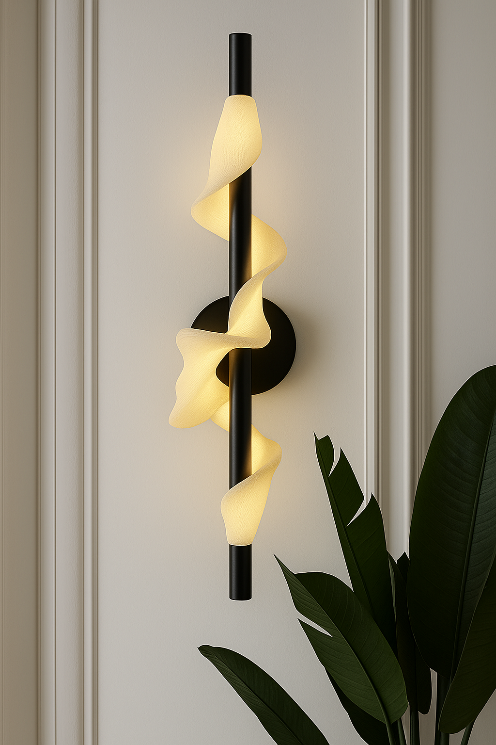 Introduce a touch of sculptural elegance to your interior with this modern wall sconce, designed to create both ambience and visual impact. A sleek black vertical frame is wrapped in a flowing ribbon-like form that diffuses a warm, inviting glow across the room. Its artistic silhouette makes it as much a piece of wall art as it is a functional light, perfect for hallways, bedrooms, or statement living spaces. Crafted with a refined balance of modern minimalism and organic movement, this wall light enhances interiors with a blend of sophistication and soft illumination, transforming walls into focal points of contemporary design.