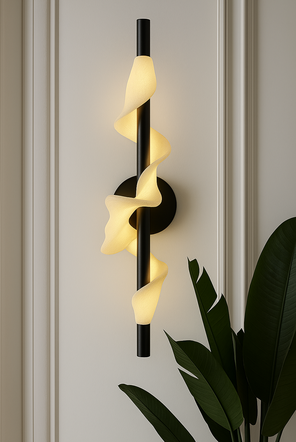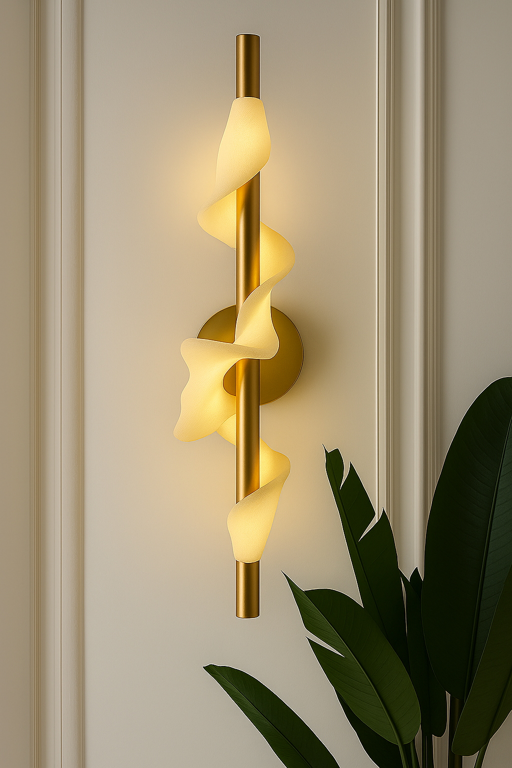 Elevate your walls with a sculptural wall sconce that blends artistry with modern functionality. A sleek vertical frame is wrapped in a fluid ribbon-like form, finished in a radiant gold tone that adds warmth and luxury to any space. The design diffuses a soft, ambient glow, creating an atmosphere that feels both inviting and sophisticated. Perfect for living rooms, hallways, or bedrooms, this piece acts as both a source of light and a striking decorative element. With its golden finish and contemporary silhouette, it transforms walls into a canvas of refined elegance and timeless style.