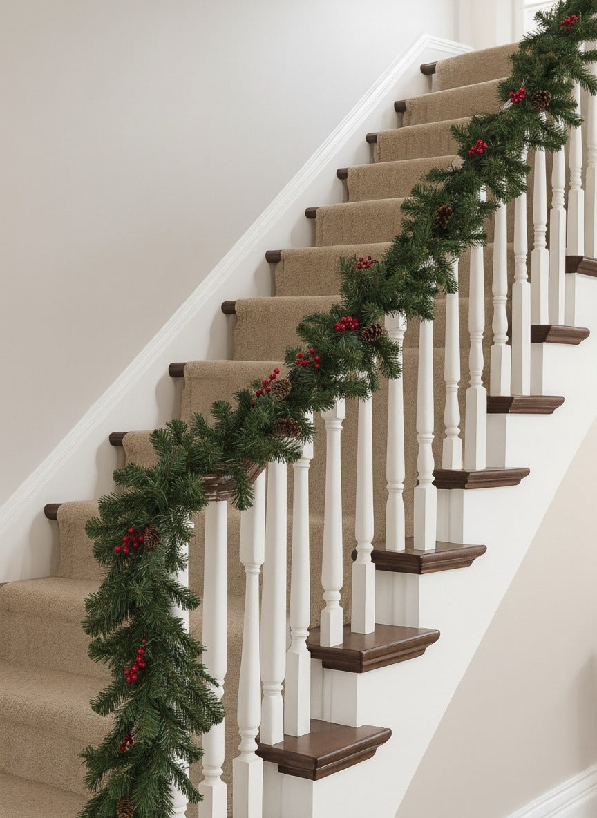 As you begin decorating for the holidays, you bring a touch of natural Christmas charm into your space with a garland that looks as if it was gathered fresh from a winter forest. Imagine soft deep green pine needles layered with lifelike texture, clusters shaped like real woodland branches, warm brown pinecones that add rustic depth, and bright red berries that create a festive pop of color like tiny ornaments sprinkled by nature. The rich evergreen tones and full bushy structure drape beautifully along mantels staircases dining tables and entryways, letting you shape your own cozy holiday story. Every detail from the forest inspired silhouette to the realistic needle density invites warmth, elegance and celebration into your home, enhancing photos displays and seasonal styling with effortless beauty.
