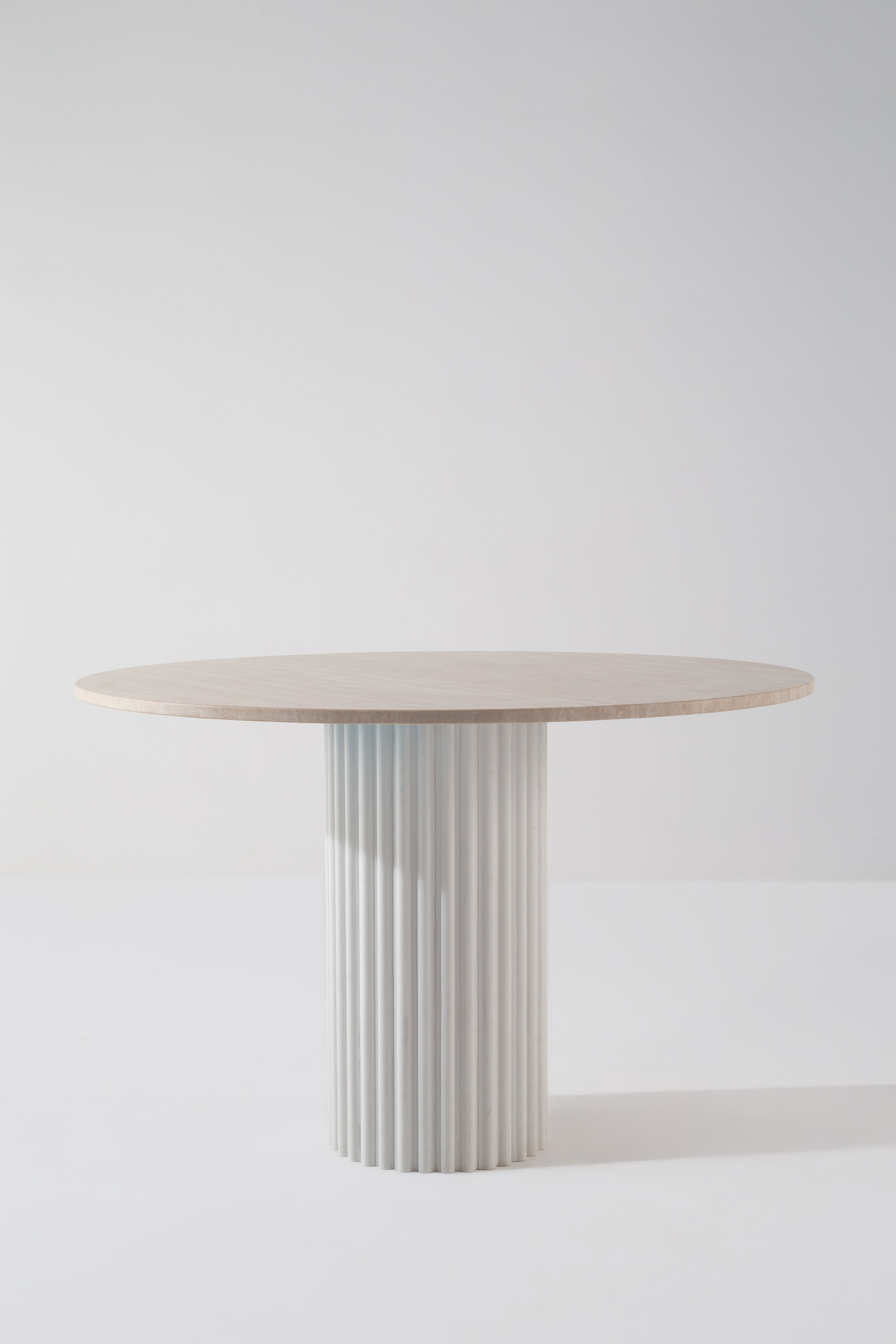 A refined balance of textures, this round travertine dining table features a smooth beige stone top resting on a striking white quartz fluted base. The natural veining enhances its organic charm, while the contrast between the warm travertine and crisp quartz brings depth. Designed to complement both modern and classic interiors, it adds a touch of sophistication to any dining space.