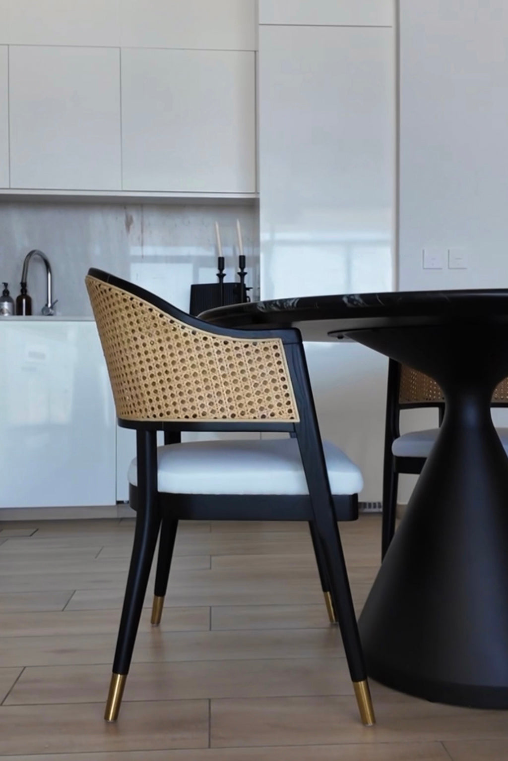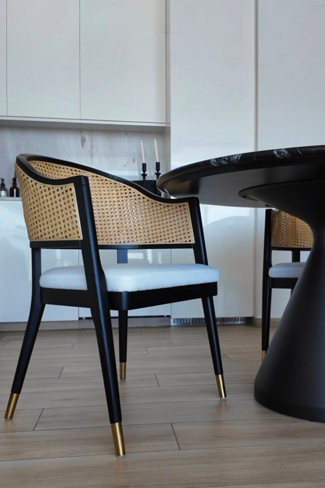 Transform your dining space with a wooden dining chair crafted from solid ashwood and natural rattan, combining timeless elegance with lasting durability. The gracefully curved wooden frame offers a sleek, modern silhouette, while the woven rattan backrest & Fabric Seat add breathable comfort and a touch of natural texture. With its warm wood tones and organic appeal, this chair complements contemporary, Scandinavian, and rustic interiors effortlessly. Designed for both style and support, it invites you to unwind and enjoy every meal in comfort and sophistication.
