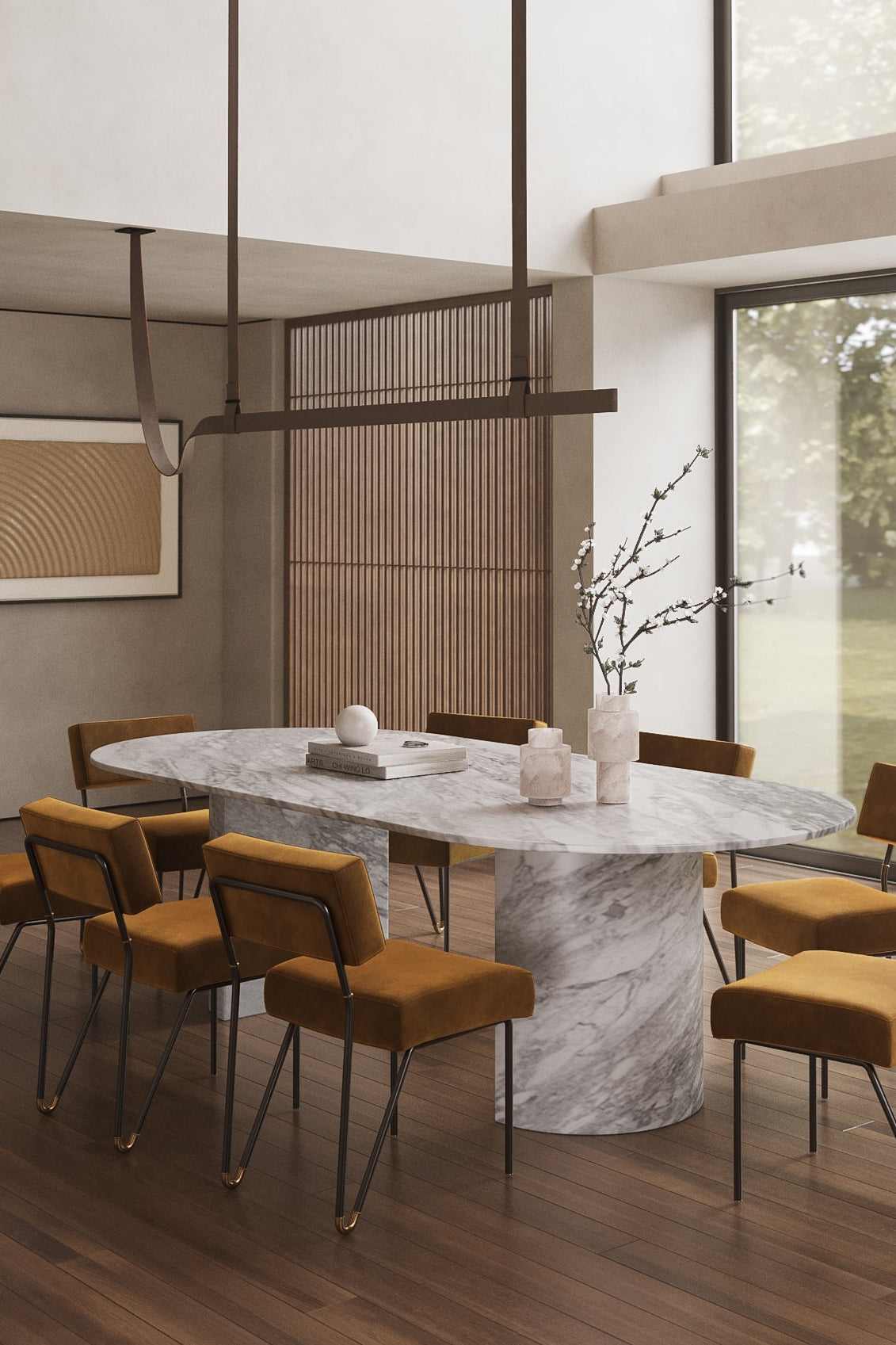 Enhance your dining room with this Bianco Joya stone dining table, featuring a polished stone surface, natural veining, and sculptural half-moon legs ideal for modern, contemporary, and minimalist interiors. Designed for durability and visual impact, this luxury stone dining table offers a spacious layout perfect for family meals, hosting guests, and elevating your home with timeless elegance and premium craftsmanship.
