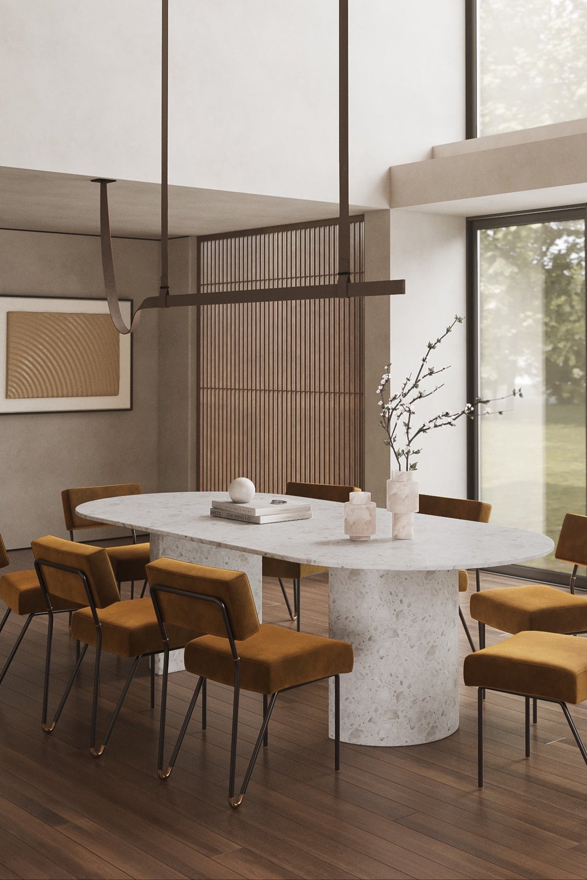 Upgrade your dining room with this Bianco Terrazzo dining table, featuring a polished terrazzo surface, subtle stone patterning, and sculptural half-moon legs perfect for modern, contemporary, and minimalist interiors. Designed for durability, function, and visual impact, this luxury terrazzo dining table offers ample space for family meals, entertaining guests, and elevating your home with refined texture and timeless elegance.