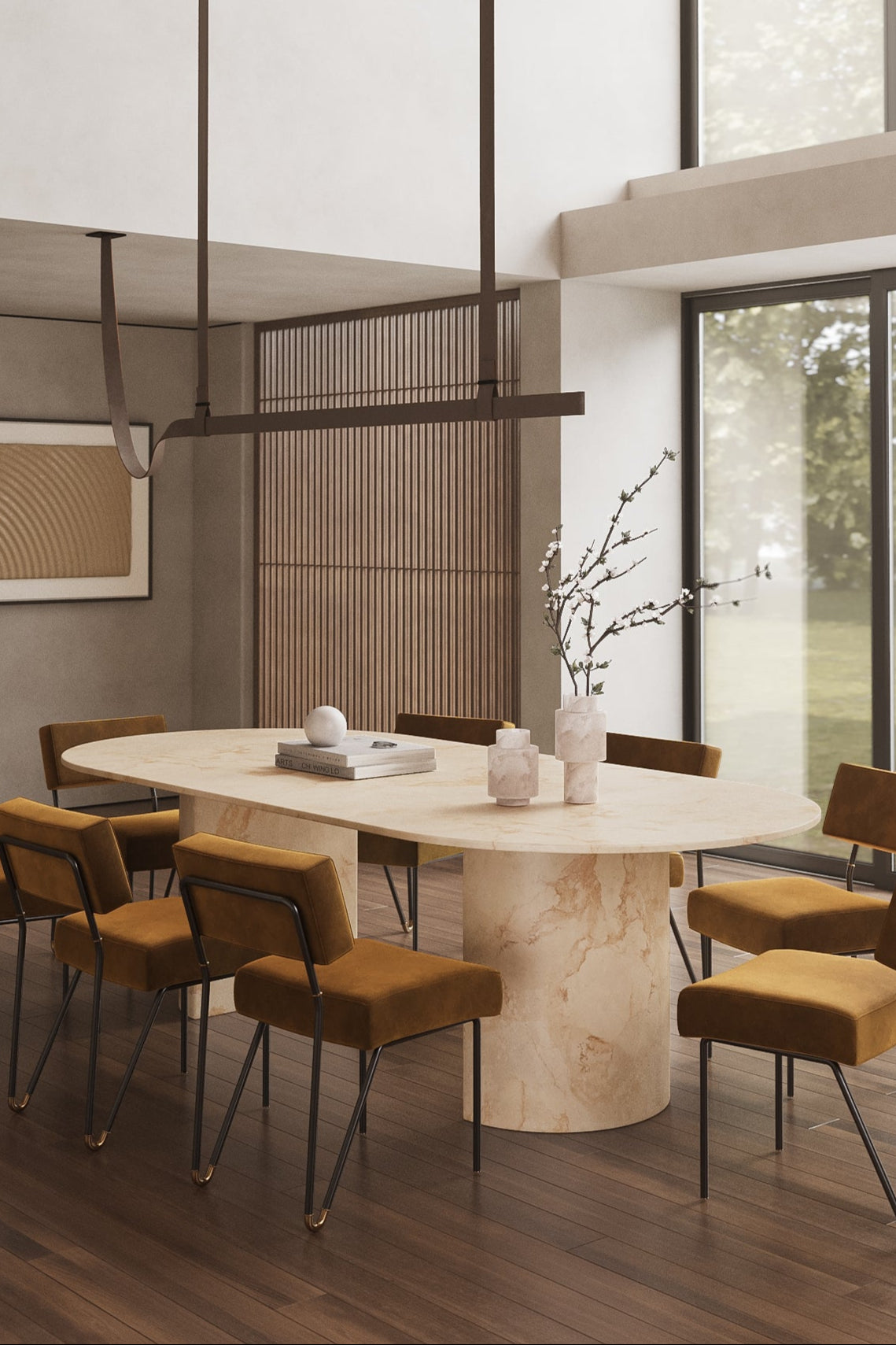 Elevate your dining room with this Jerusalem Stone dining table, featuring a polished natural stone surface, warm beige tones, and sculptural half-moon legs ideal for modern, contemporary, and minimalist interiors. Designed for durability, visual warmth, and daily functionality, this luxury stone dining table offers ample space for family meals, entertaining guests, and enhancing your home with timeless elegance and Mediterranean-inspired sophistication.
