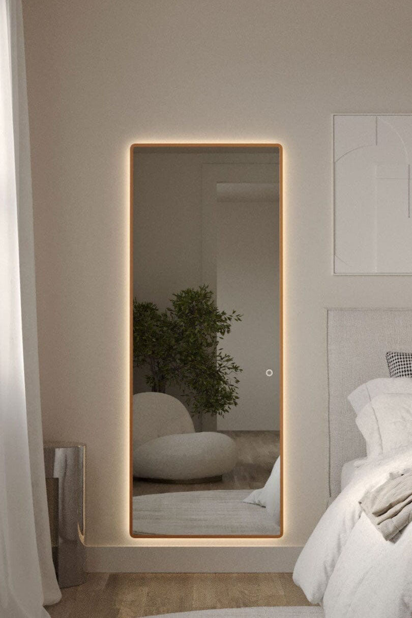 This gold aluminum framed backlit mirror radiates warmth with its rectangular design and softly rounded corners. The integrated LED emits a gentle golden hue that enriches reflections and adds depth to the surrounding space. Clear mirror glass offers crisp clarity while the slim metallic frame introduces a refined contrast against neutral walls. Ideal for bedrooms, dressing rooms, or entryways where subtle illumination enhances everyday routines.