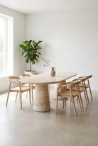 The Dolce dining table exudes contemporary charm with its smooth, rounded design and dual cylindrical bases, crafted from durable Fiber Reinforced Concrete (FRC) and finished in a refined travertine effect that brings natural warmth and organic texture to any dining space. Its soft beige tones and subtle stone-like striations enhance minimalist, Scandinavian, and modern interiors, while the rounded tabletop creates an inviting focal point for daily meals or social gatherings. The matte, touchable surface highlights the artisanal quality of its FRC composition, with gentle variations that lend each piece a uniquely refined character. Blending strength, style, and timeless sophistication, this dining table elevates your home with a balanced fusion of durability and understated elegance.