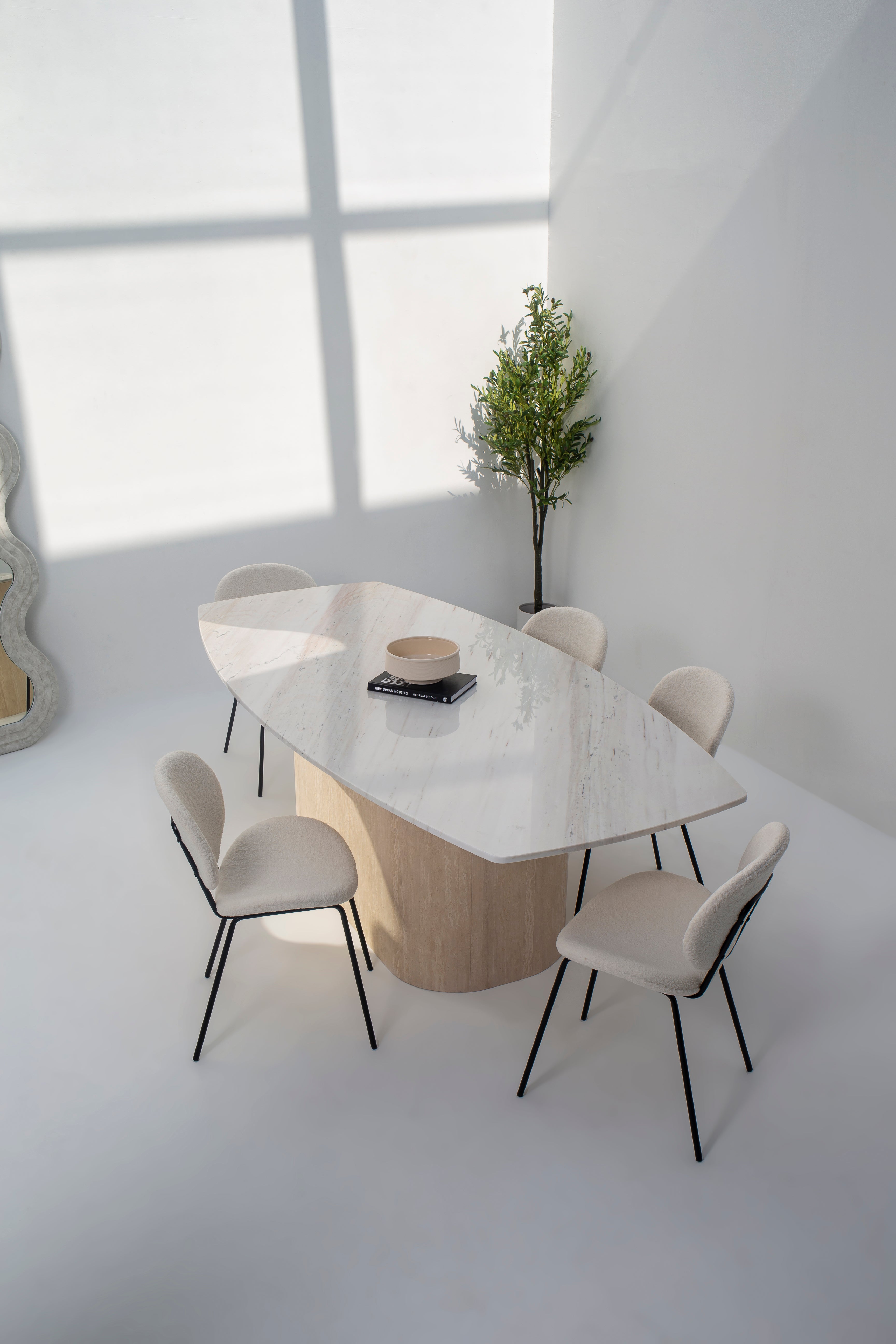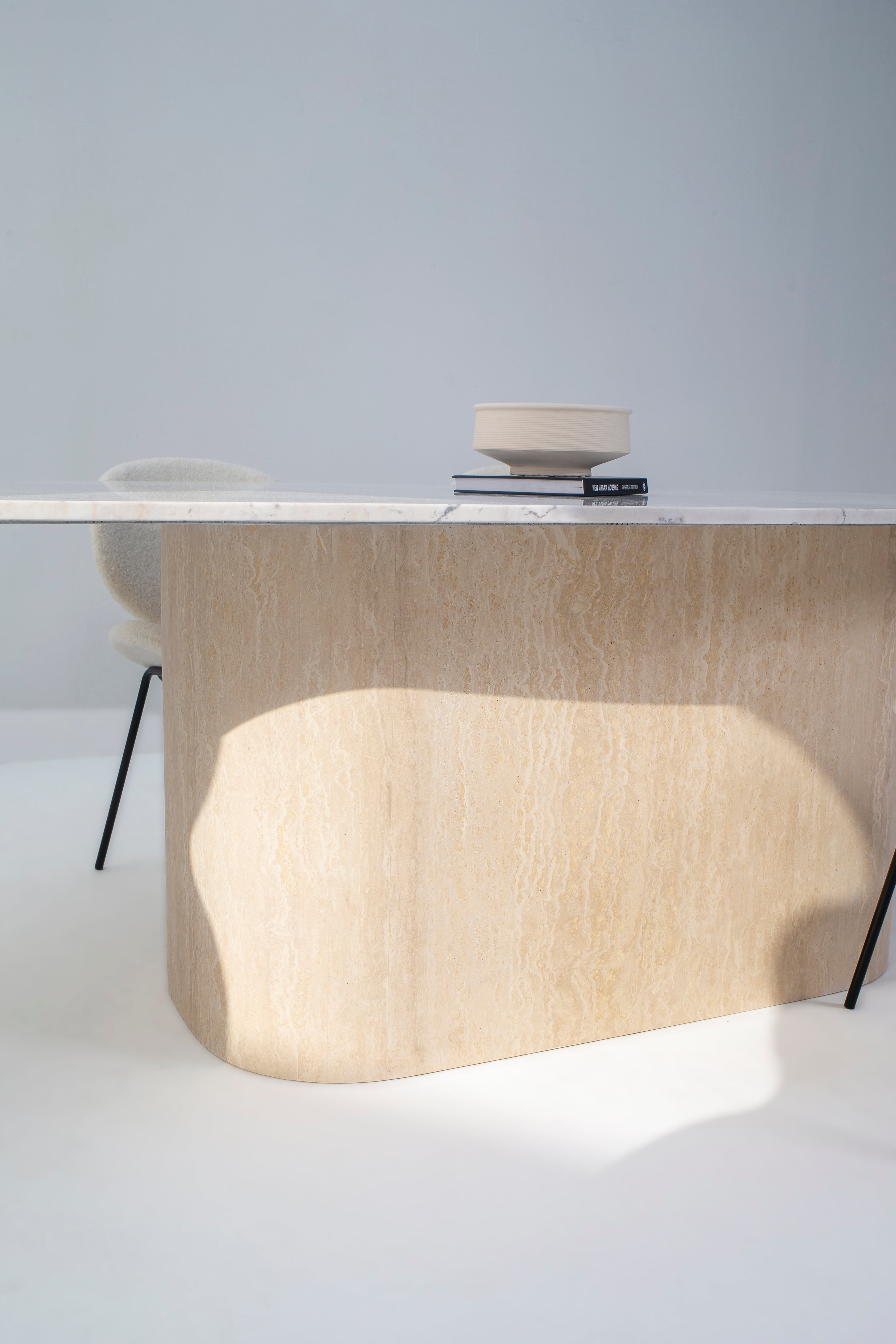 Expertly crafted, the travertine base enhances the organic charm of the marble top, providing a contrast that elevates its beauty. This dining table is a perfect blend of artistic design and functional elegance, making it an excellent choice for gatherings or as a showpiece in contemporary and traditional homes. Experience dining with a touch of luxury and natural artistry.