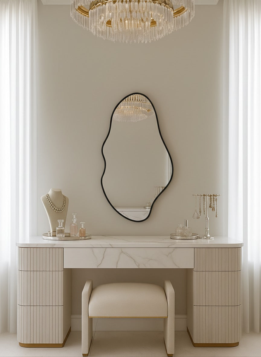 The Eve Black Irregular Wall Mirror features a freeform organic shape framed in slim black metal that adds a contemporary edge. Its smooth reflective surface enhances depth and brightness, bringing movement and style to any space. Perfect for bedrooms, entryways, or living areas, this mirror pairs modern artistry with everyday function. The sculptural outline makes it a striking accent that complements minimalist, industrial, or Scandinavian interiors beautifully.