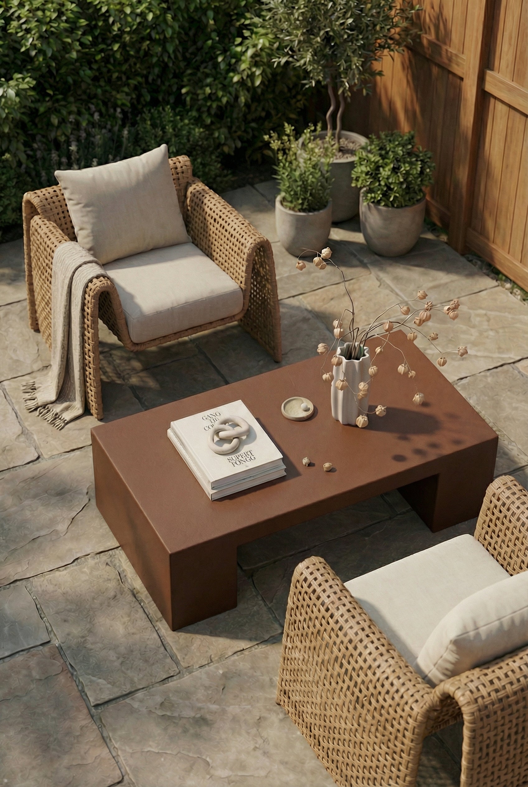 A low rectangular coffee table crafted from microconcrete in a warm mocha tone, Evora brings structure and calm to outdoor living spaces. Its broad surface and solid block legs create a balanced, sculptural form that feels grounded yet effortless in open-air settings. The smooth matte finish adds tactile warmth while remaining durable and easy to maintain outdoors. Ideal for styling with books, trays, or decorative accents, it anchors terraces and patios with quiet strength, blending architectural presence with everyday outdoor functionality.