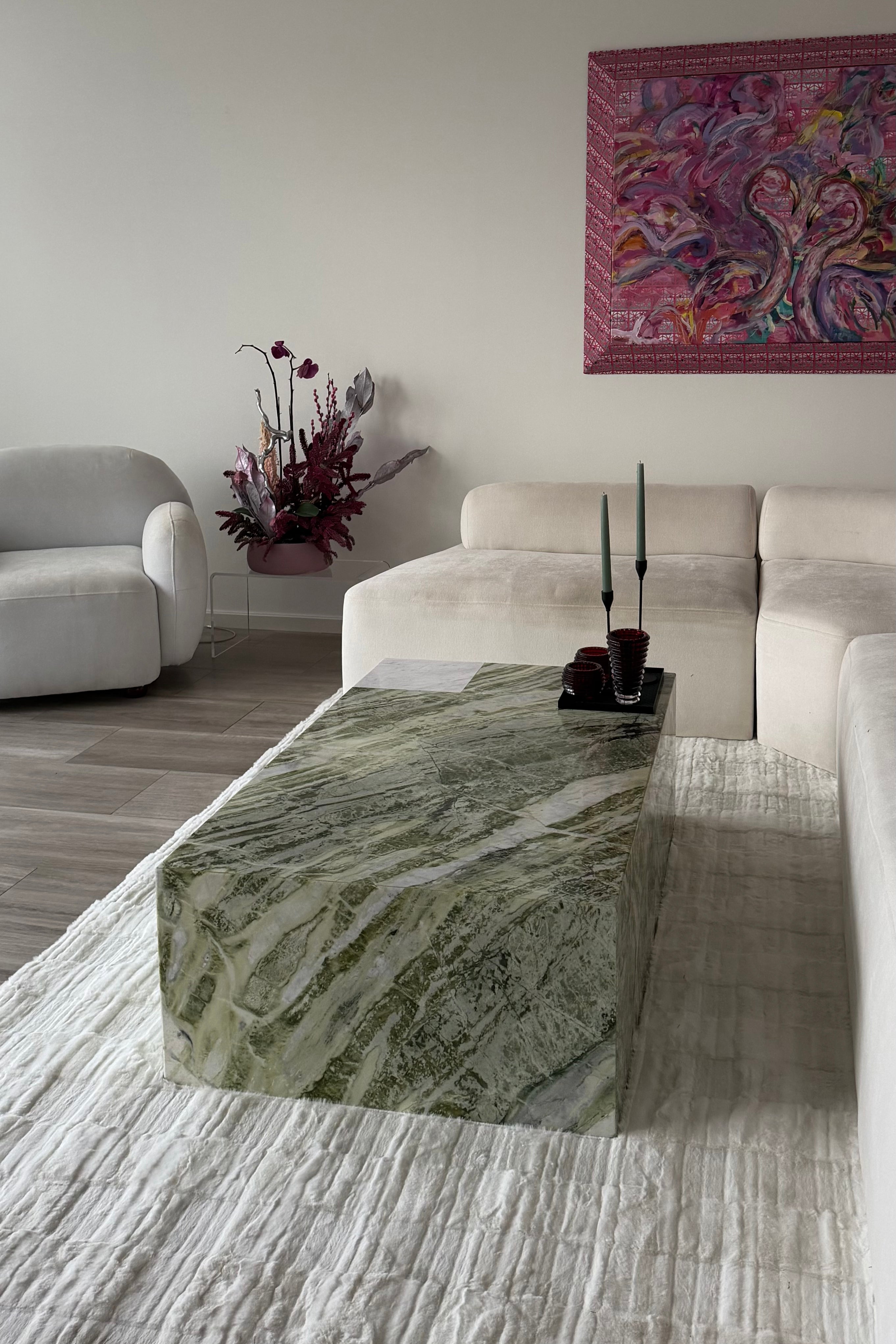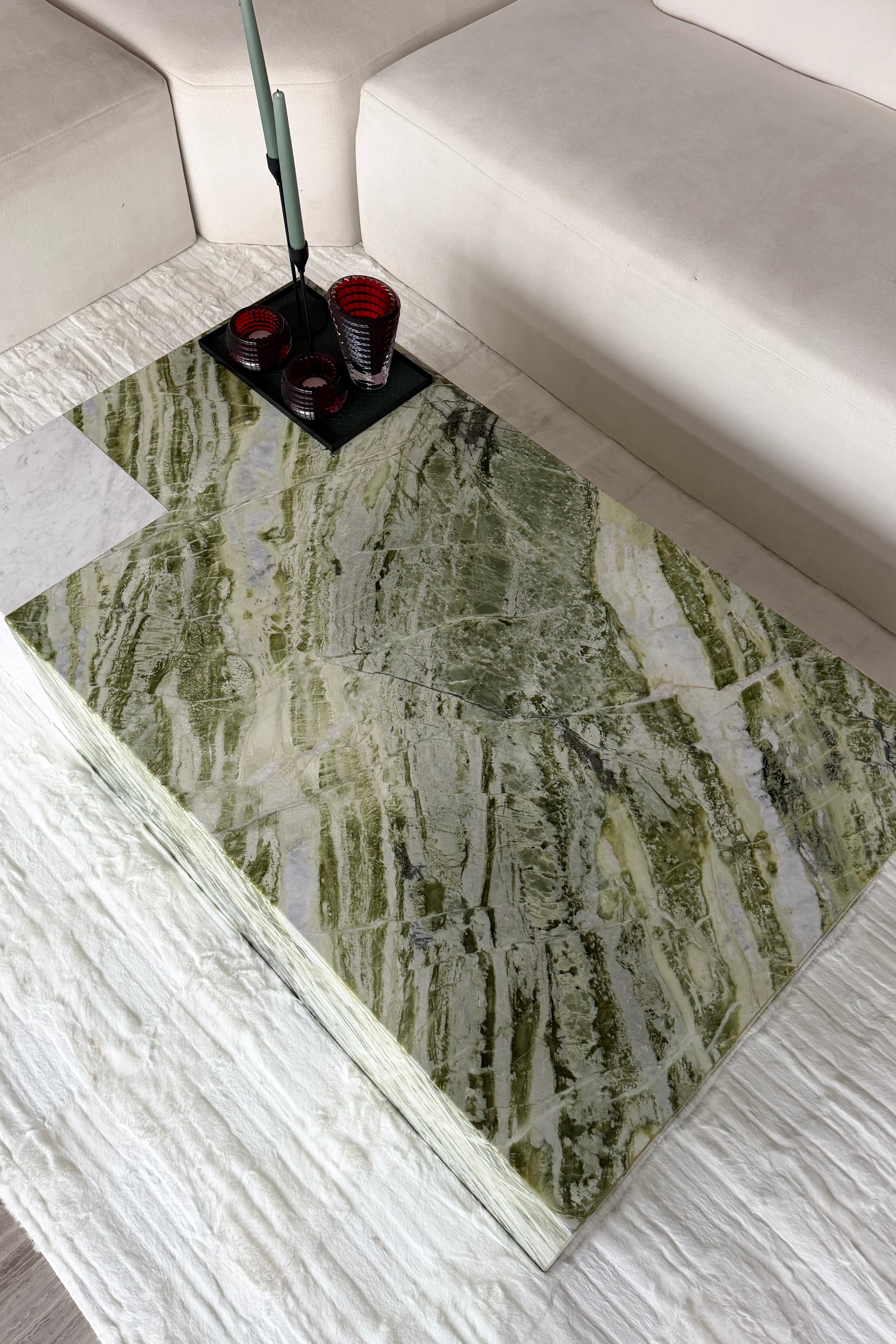 Crafted to make a bold architectural statement, this green marble coffee table showcases dramatic natural movement paired with refined minimalism. The solid form highlights rich green tones with striking veining and organic variation, creating a one of a kind surface that feels both earthy and elevated. Its monolithic block design delivers a sculptural silhouette that brings balance and modern edge to contemporary interiors. Finished with a polished surface and a grounded presence, it’s an ideal centerpiece for living rooms, lounges, or gallery inspired spaces seeking a luxury focal point.