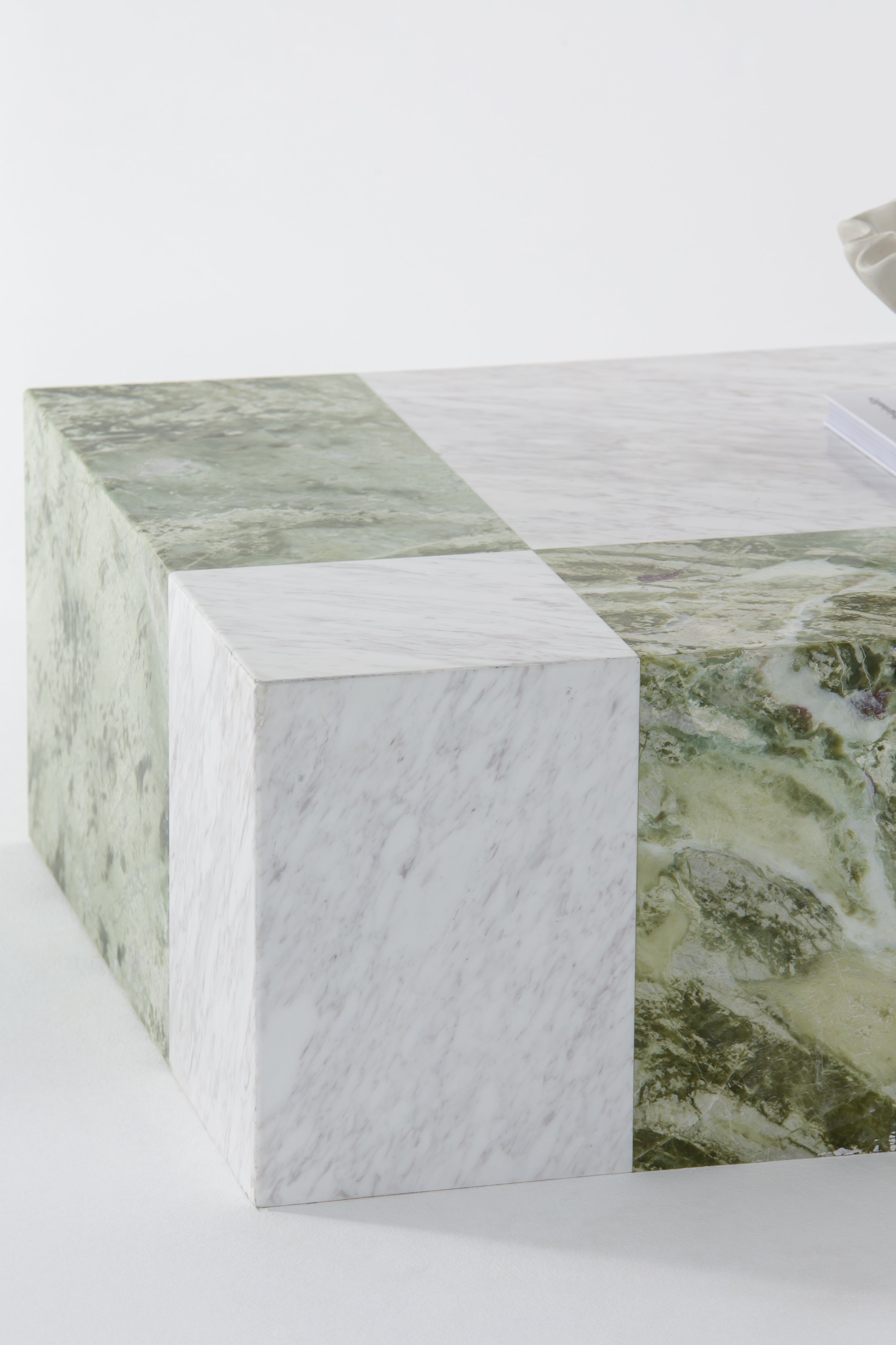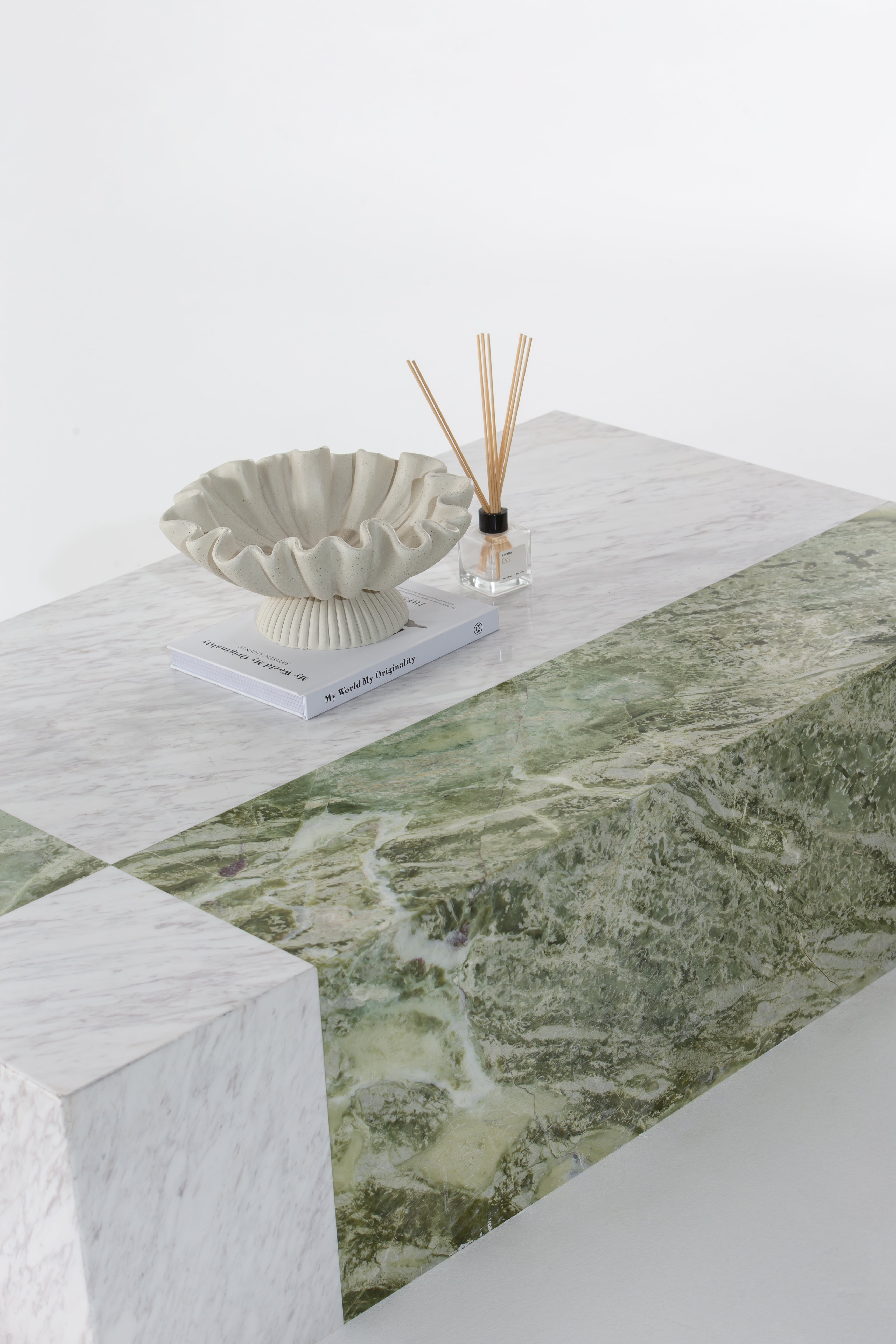 Crafted to make a bold architectural statement, this Green Exotic & Venus White Marble Coffee Table fuses dramatic natural texture with refined minimalism. The body features rich green exotic marble, renowned for its vibrant veining and tonal variation, contrasted by clean Venus White marble accents that provide crisp structure and visual balance. The table’s monolithic block design creates a sculptural silhouette that enhances modern interiors with elegance and edge. Its polished surfaces and solid form make it the ideal centerpiece for living rooms, lounges, or contemporary gallery-like spaces seeking a luxury focal point.