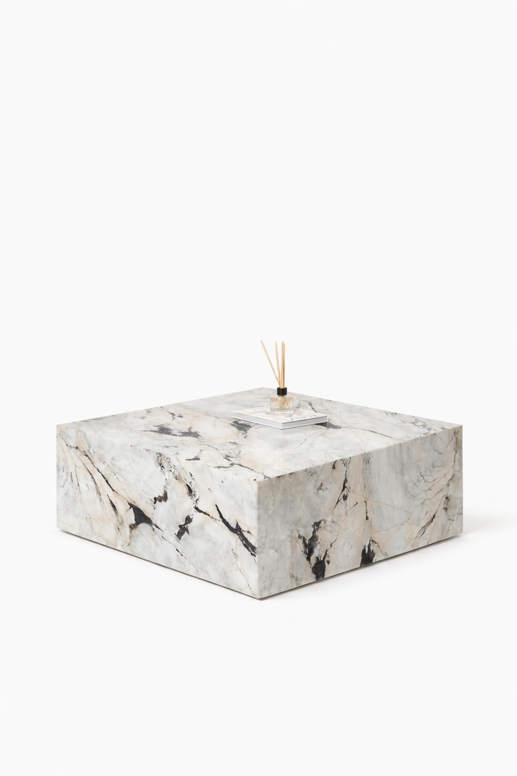 A bold square cube silhouette carved from Viola white marble creates a striking focal point defined by natural artistry and refined minimalism. Flowing charcoal veining moves across the luminous white stone, forming dramatic organic patterns that make each surface visually captivating. The low sculptural form brings a sense of architectural balance while allowing the rich marble texture to command attention with timeless modern elegance.