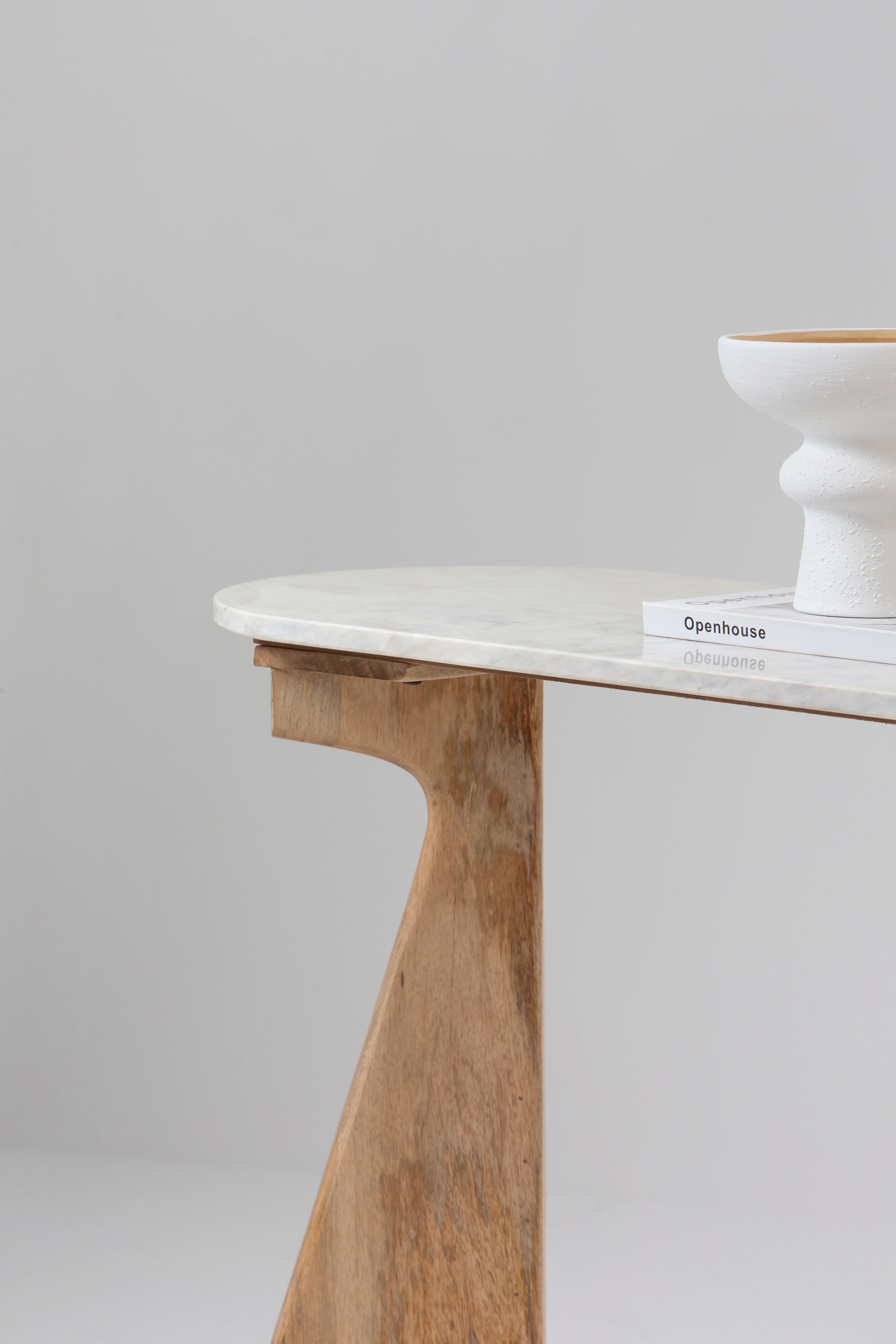 Crafted with an elegant white marble top and a unique mango wood base, this console table combines organic materials with sculptural design. The asymmetrical legs and smooth oval top bring a modern yet earthy charm to any space, making it perfect for entryways or living rooms. The neutral tones blend effortlessly with various interiors, creating a sophisticated focal point while offering a durable surface for decor or essentials.