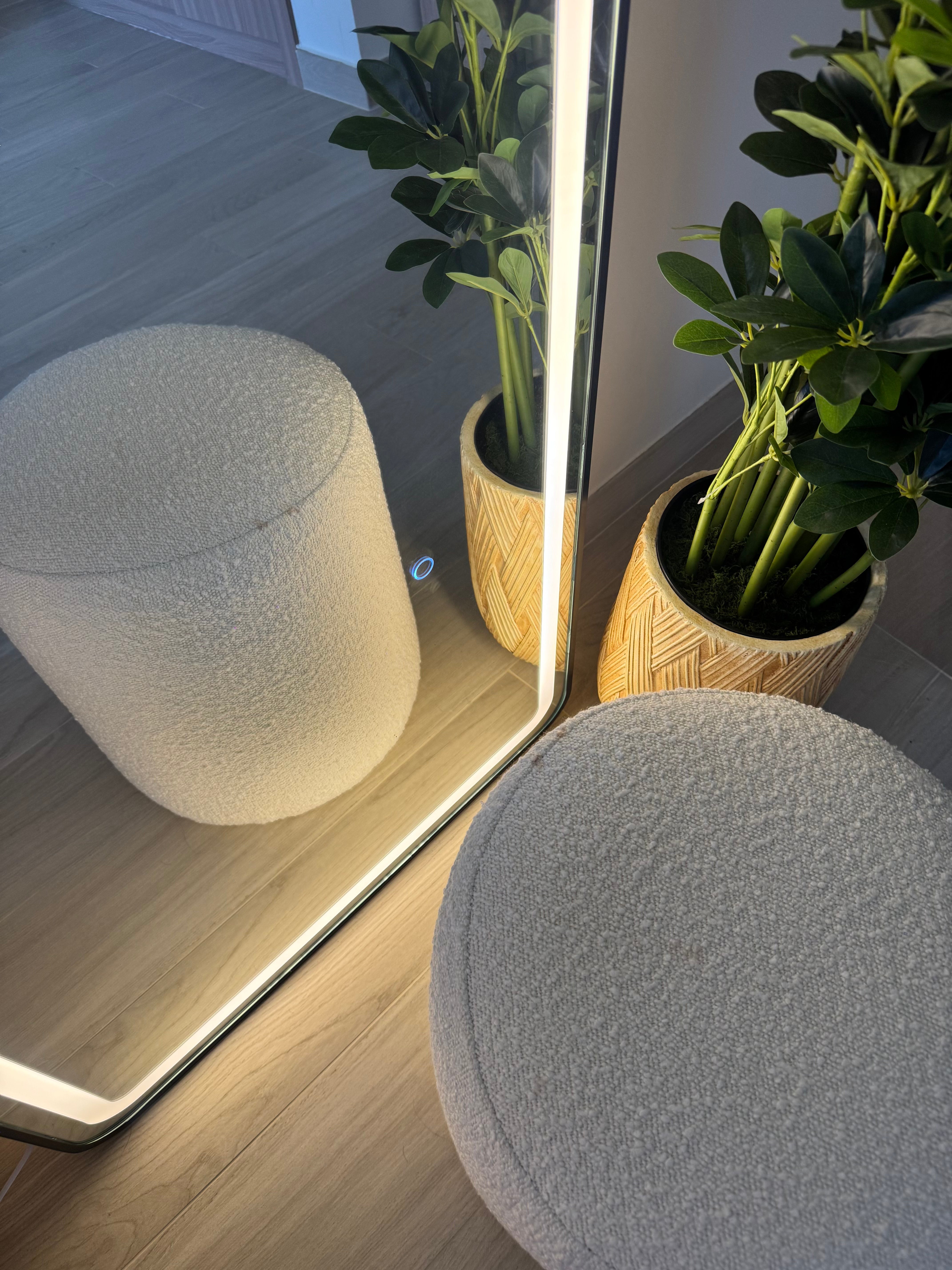 Discover a versatile LED mirror with smooth rounded corners that effortlessly adapts to your space, whether leaned casually against a wall or professionally mounted using its built-in wall mount. With customizable lighting options, it allows you to switch between radiant white, inviting warm white, and relaxing yellow hues with just a touch. The intuitive touch button ensures a seamless transition between light colors and an easy on/off operation, combining modern convenience with sophisticated style so you can enjoy beauty and illumination tailored to your mood and setting.