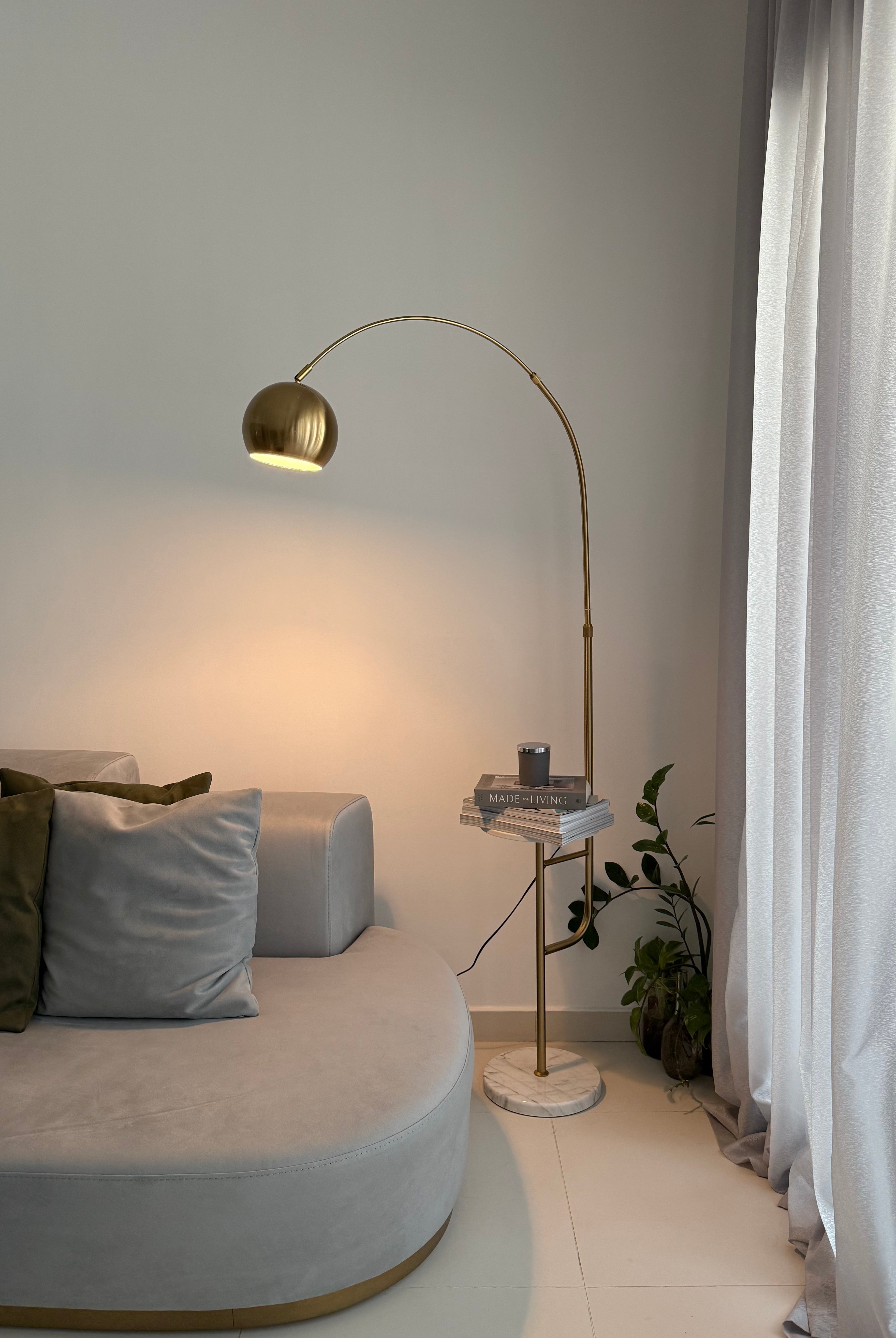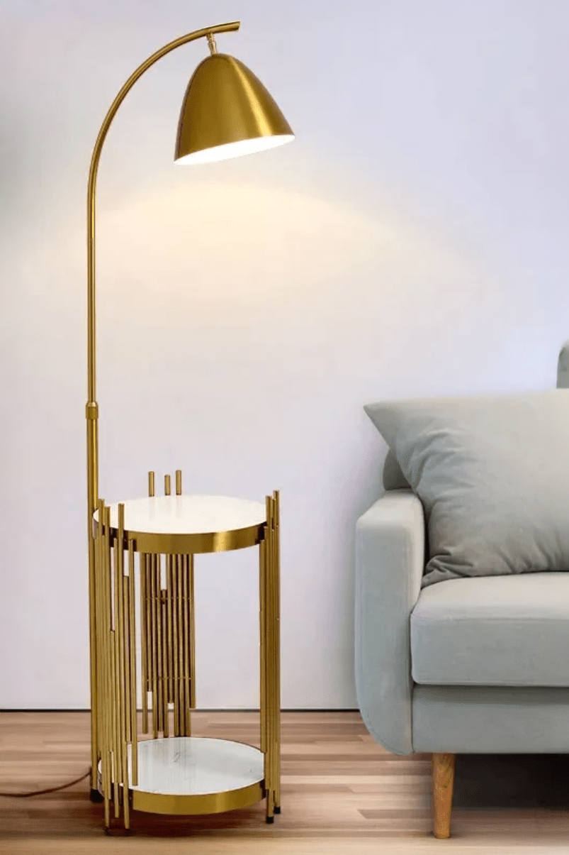 This elegant and highly functional Floor Lamp with Integrated Table is a sophisticated addition to any modern living space. Crafted from durable metal with a luxurious golden finish, its striking design features a gracefully arched neck culminating in a bell-shaped lampshade, providing focused illumination. Below the lamp, two circular shelves made of pristine glass offer convenient surfaces for your essentials – a cup of coffee, a book, or decorative items. The base and integrated table structure are meticulously designed with vertical metal rods, adding a touch of contemporary artistry and stability. This versatile piece serves as both a stylish lighting solution and a practical side table, perfect for illuminating your reading nook or enhancing your lounge area.