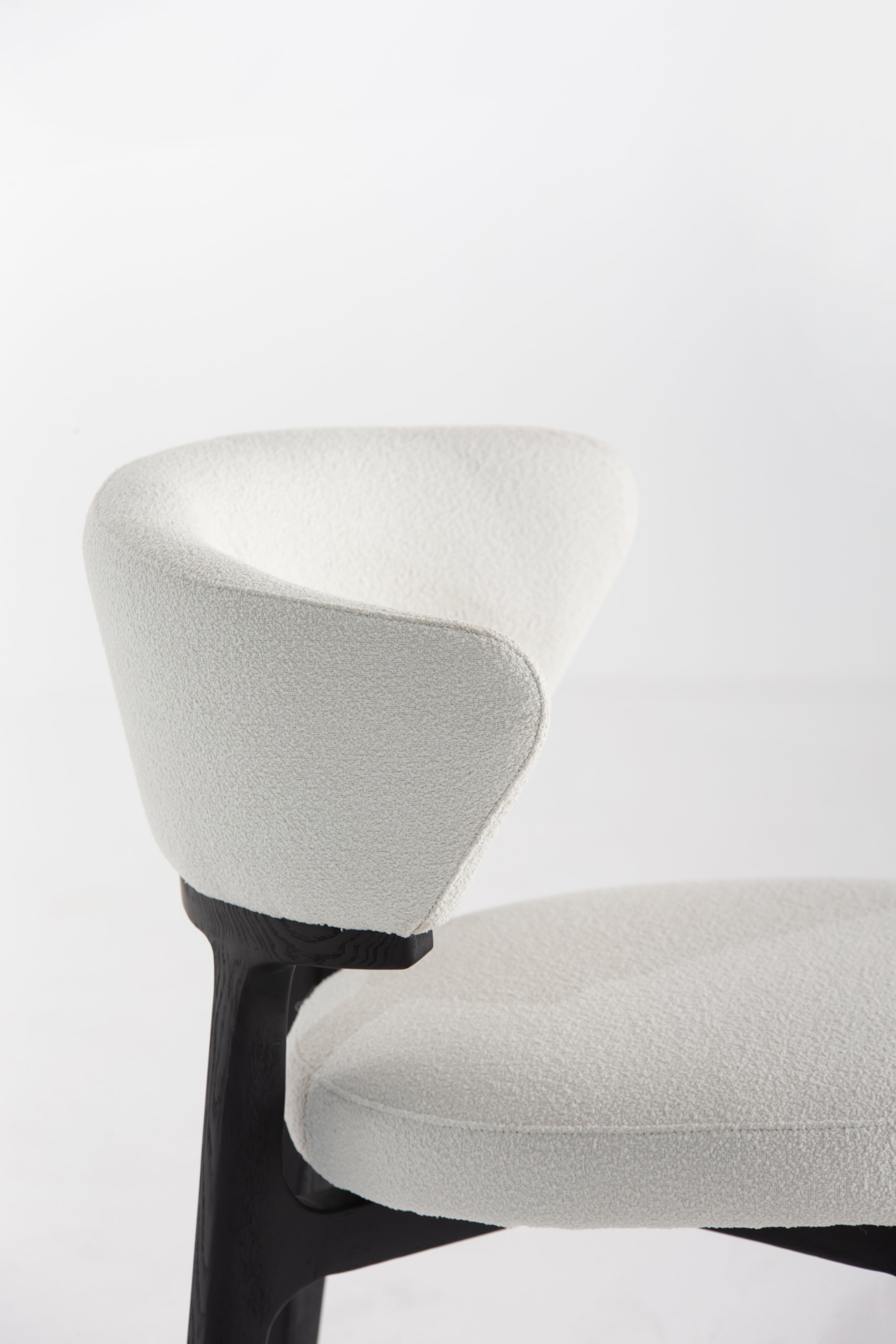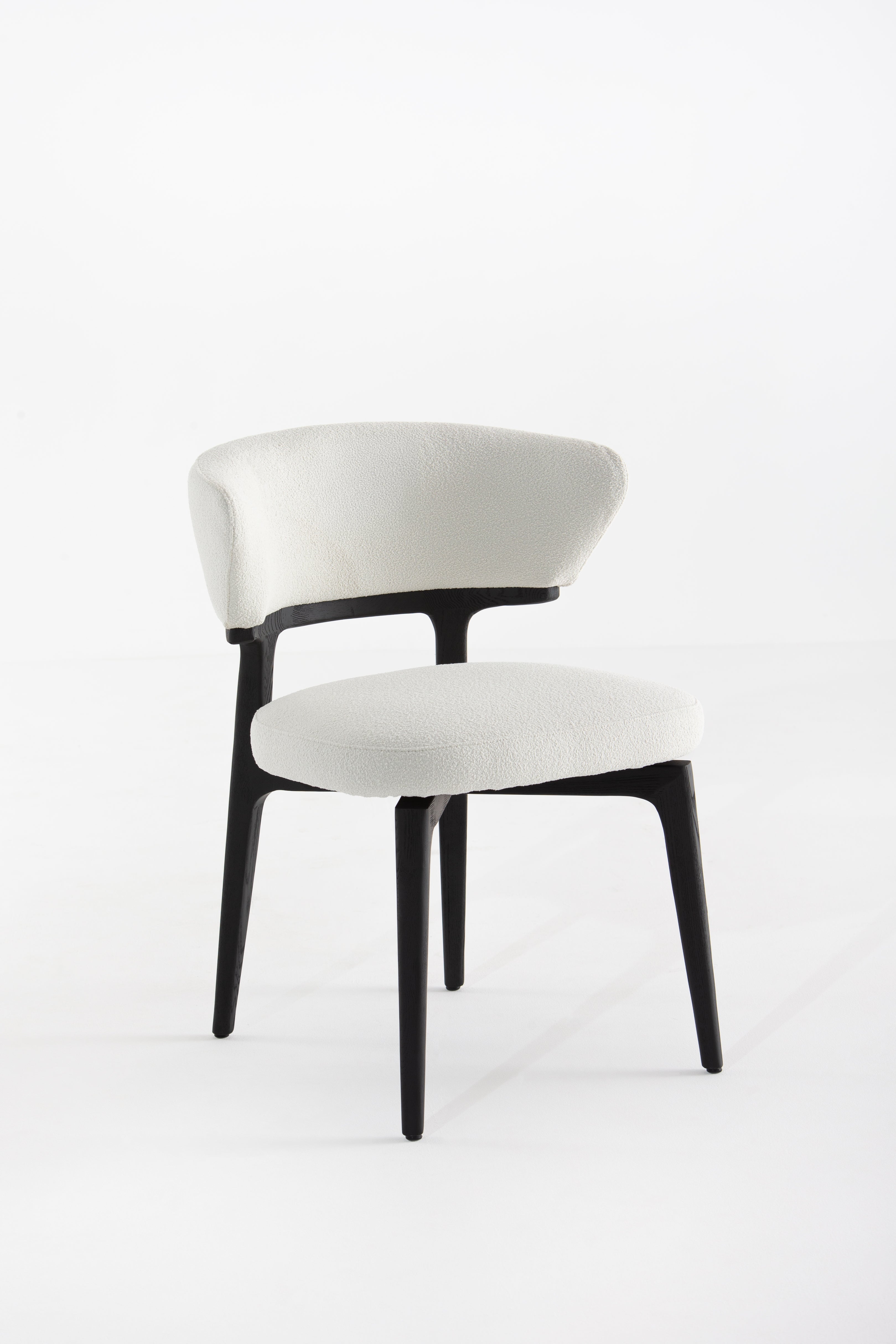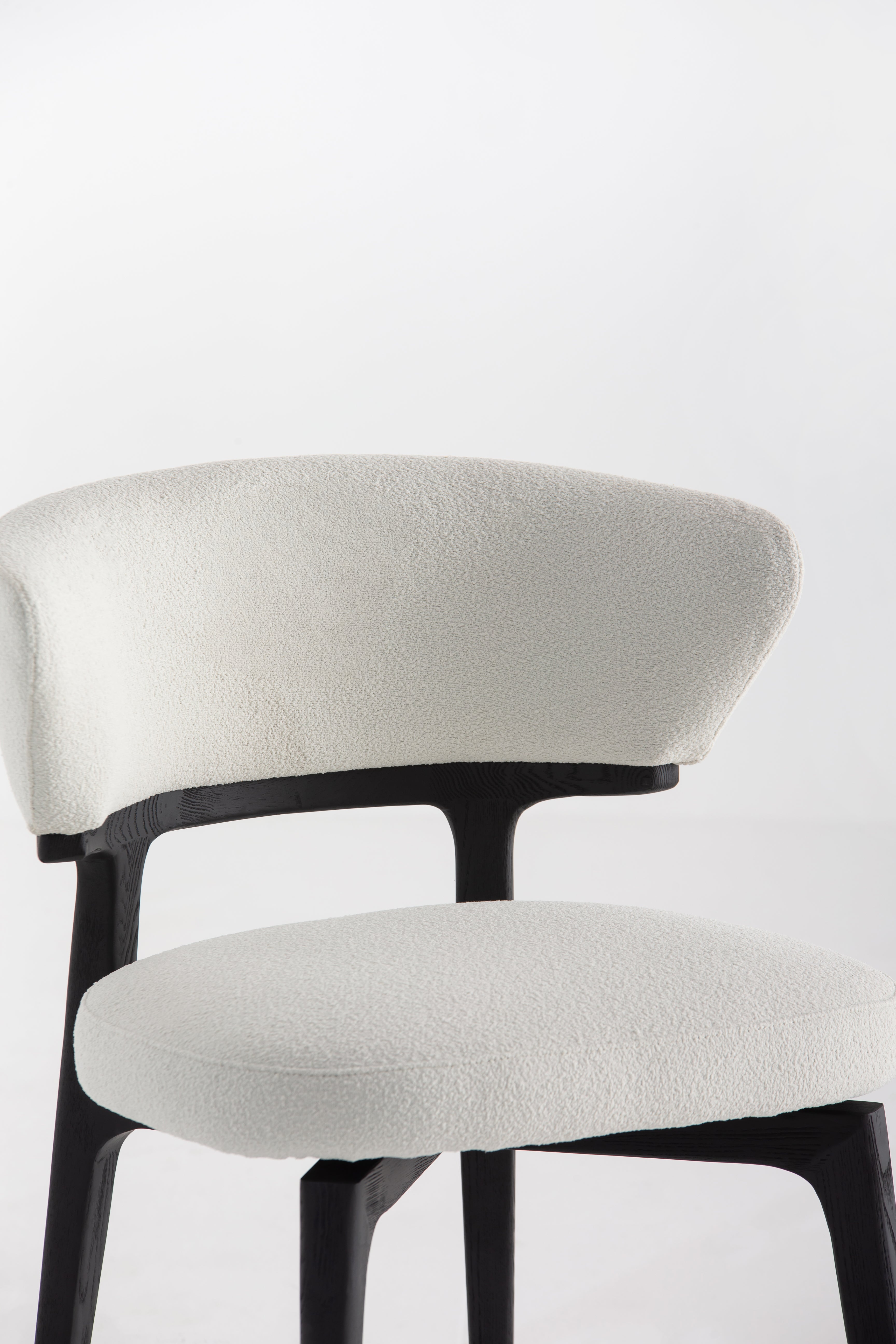 The Grusha Dining Chair transforms your dining experience with its sculptural wood frame and luxuriously soft fabric upholstery. The curved backrest embraces you in comfort, while the plush seat invites relaxation. Its sleek black legs contrast beautifully with the light, textured fabric, creating a modern yet timeless look. Ideal for contemporary dining spaces, this chair blends elegance and functionality, making every meal feel like a refined occasion.