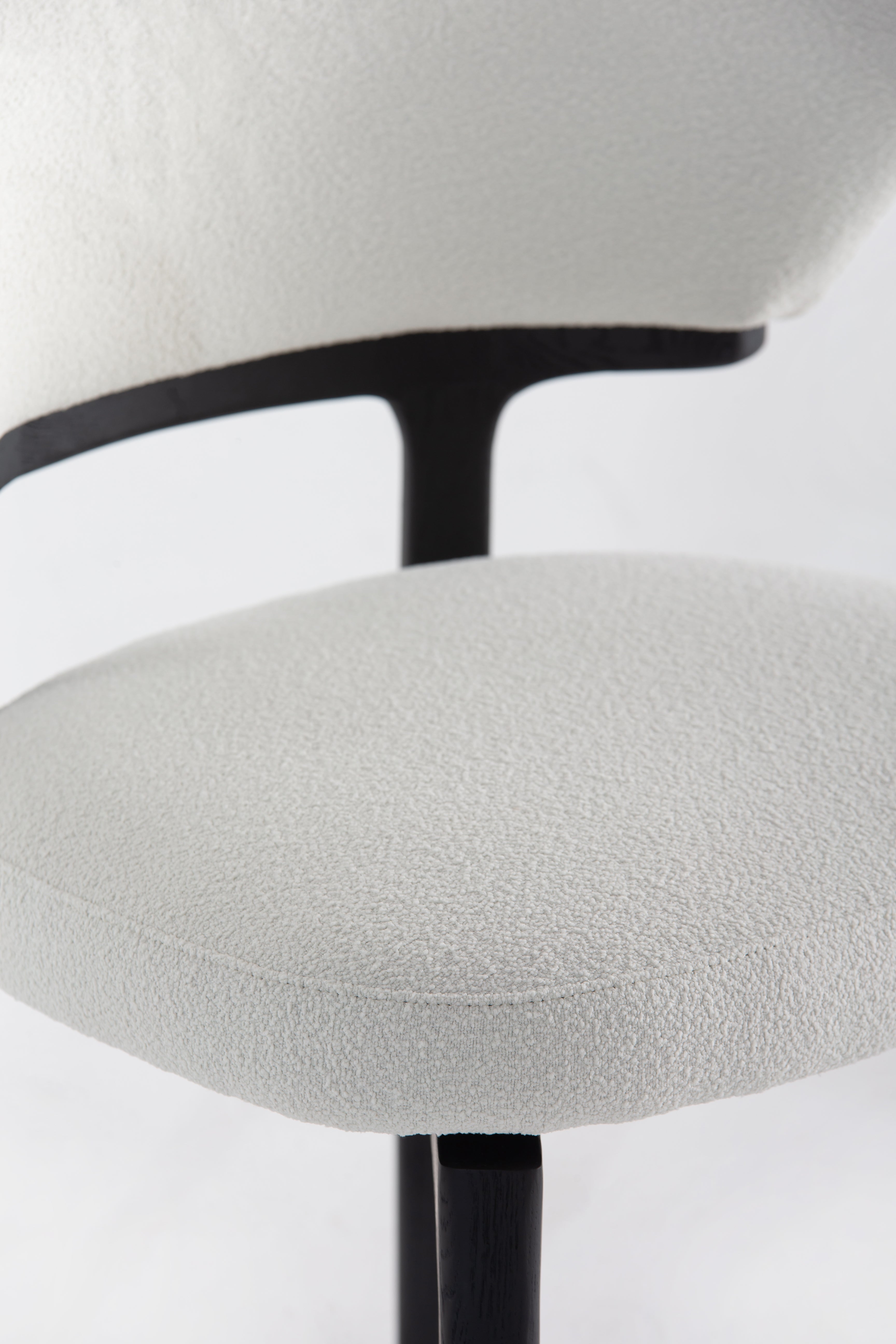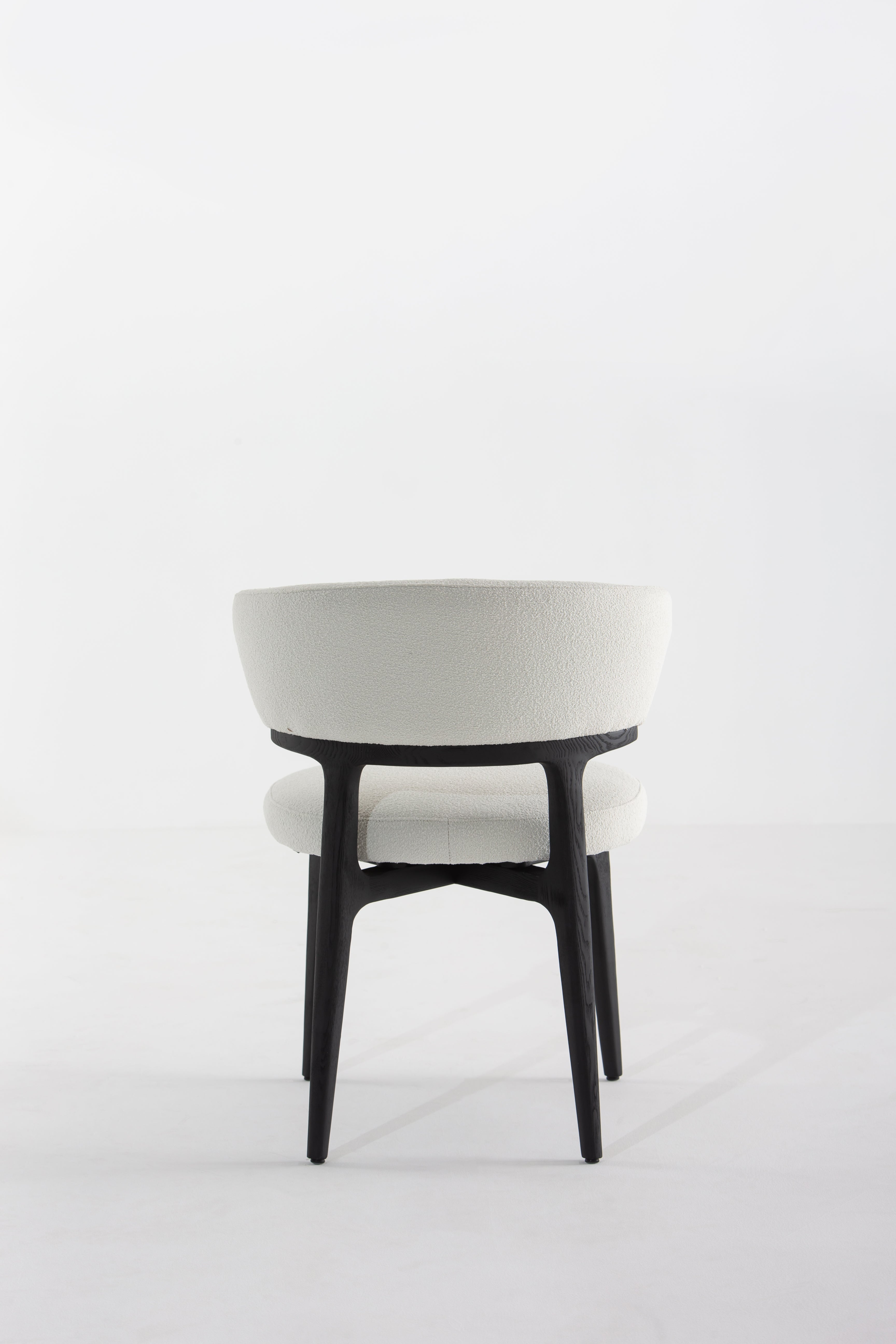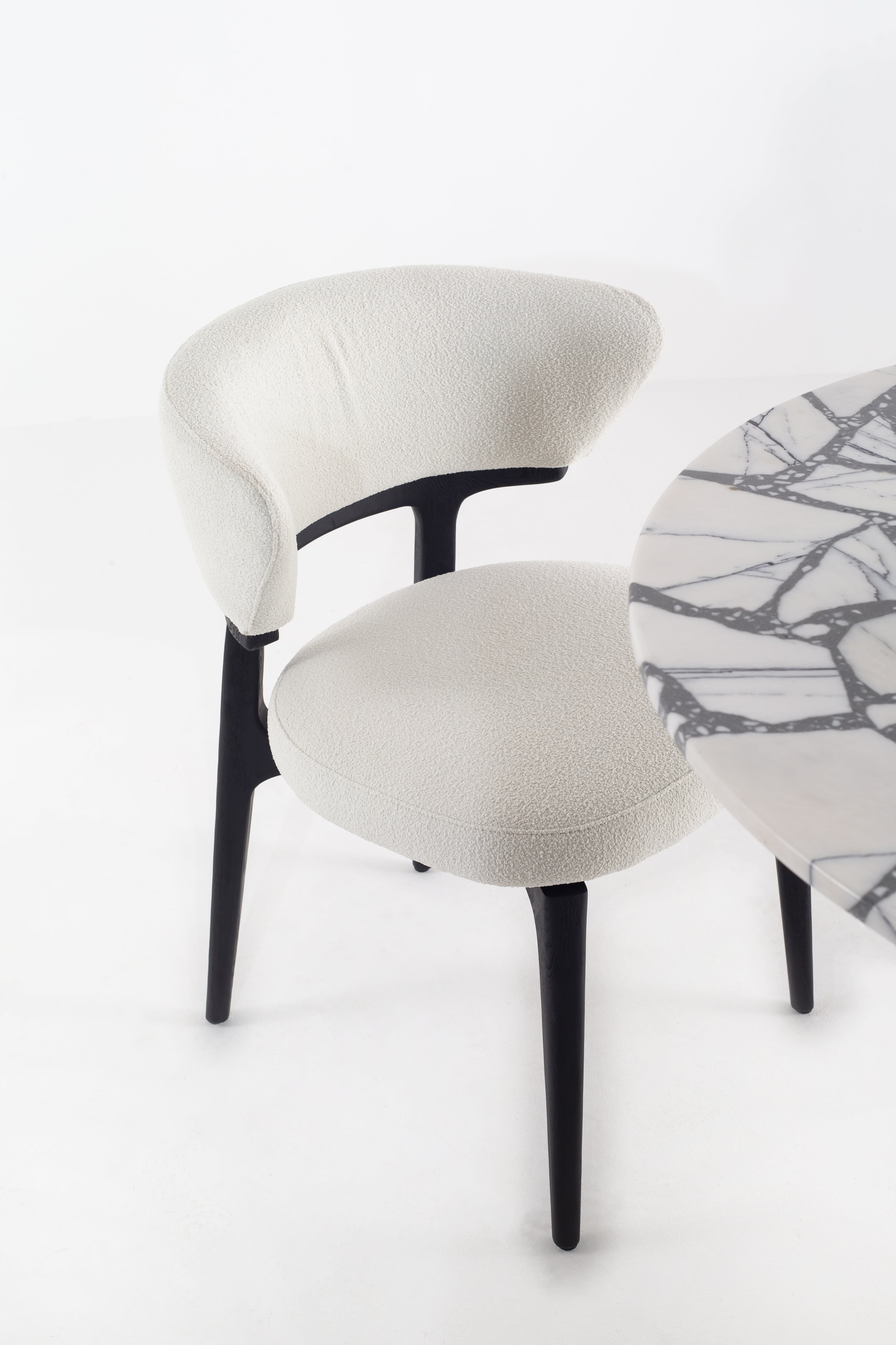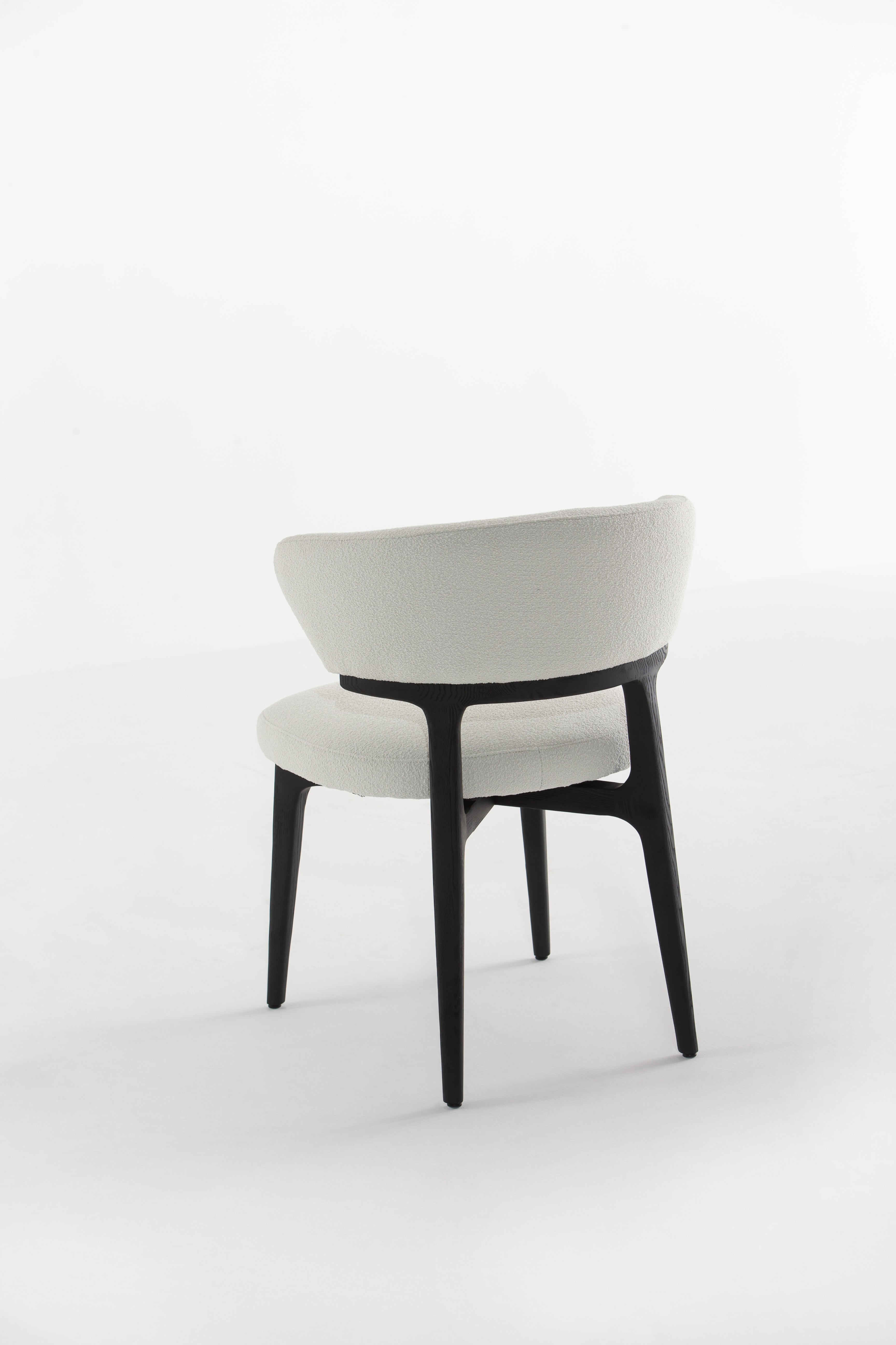 The Grusha Dining Chair transforms your dining experience with its sculptural wood frame and luxuriously soft fabric upholstery. The curved backrest embraces you in comfort, while the plush seat invites relaxation. Its sleek black legs contrast beautifully with the light, textured fabric, creating a modern yet timeless look. Ideal for contemporary dining spaces, this chair blends elegance and functionality, making every meal feel like a refined occasion.