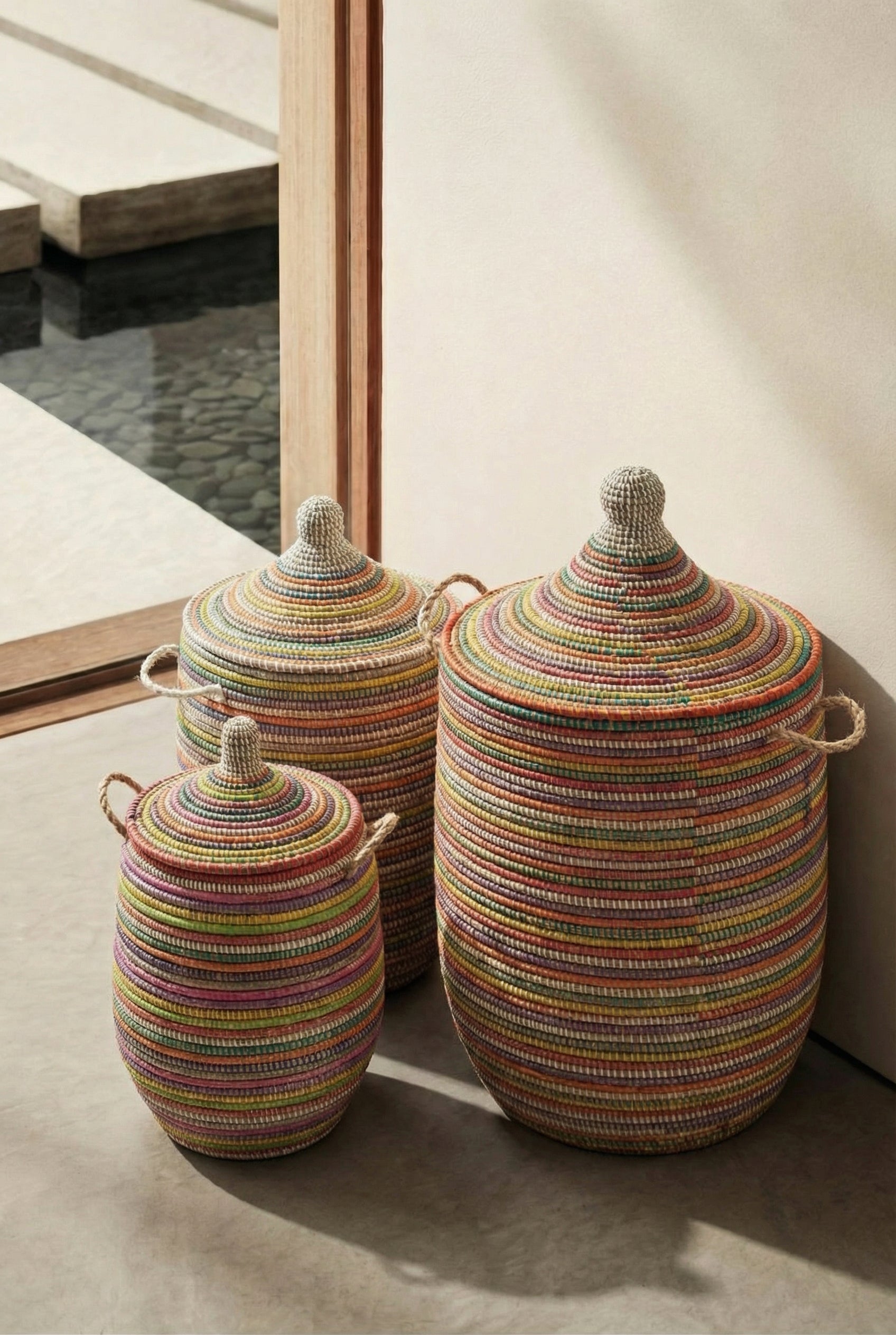 These baskets are handwoven by a group of women living in villages in Senegal. Made out of dried local grass and eco friendly PP plastic.