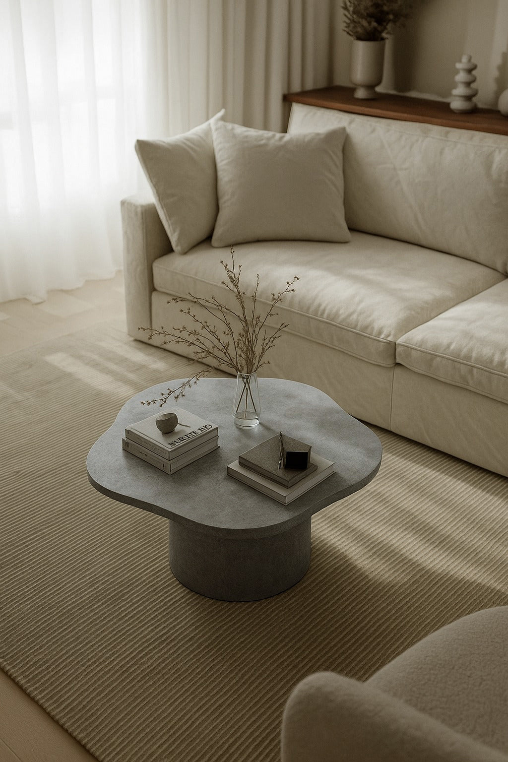 Step into your living space and elevate the ambiance with this striking irregular-top micro concrete coffee table, defined by its sculptural silhouette and soft grey finish. The organically curved shape introduces a touch of artistic character, while the smooth micro concrete surface offers a refined, stone-like texture that complements both light and dark furnishings. Bold, rounded edges ground the space and make this piece the perfect centerpiece for modern, minimalist, and contemporary interiors. Handcrafted with durable materials and timeless design, it invites you to style it with curated décor items—art books, candles, or dried branches—to create a calm and elevated aesthetic that reflects your unique taste.