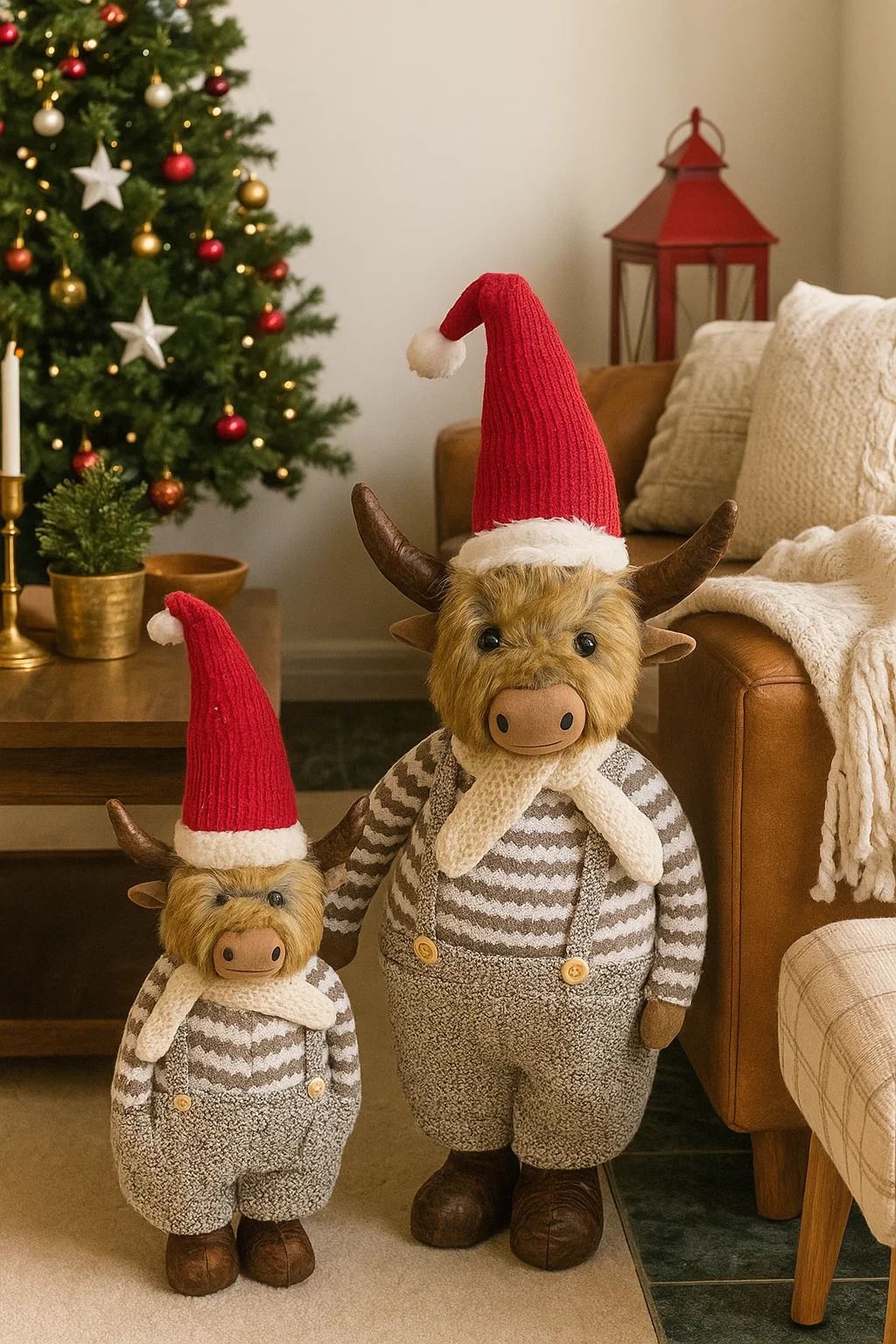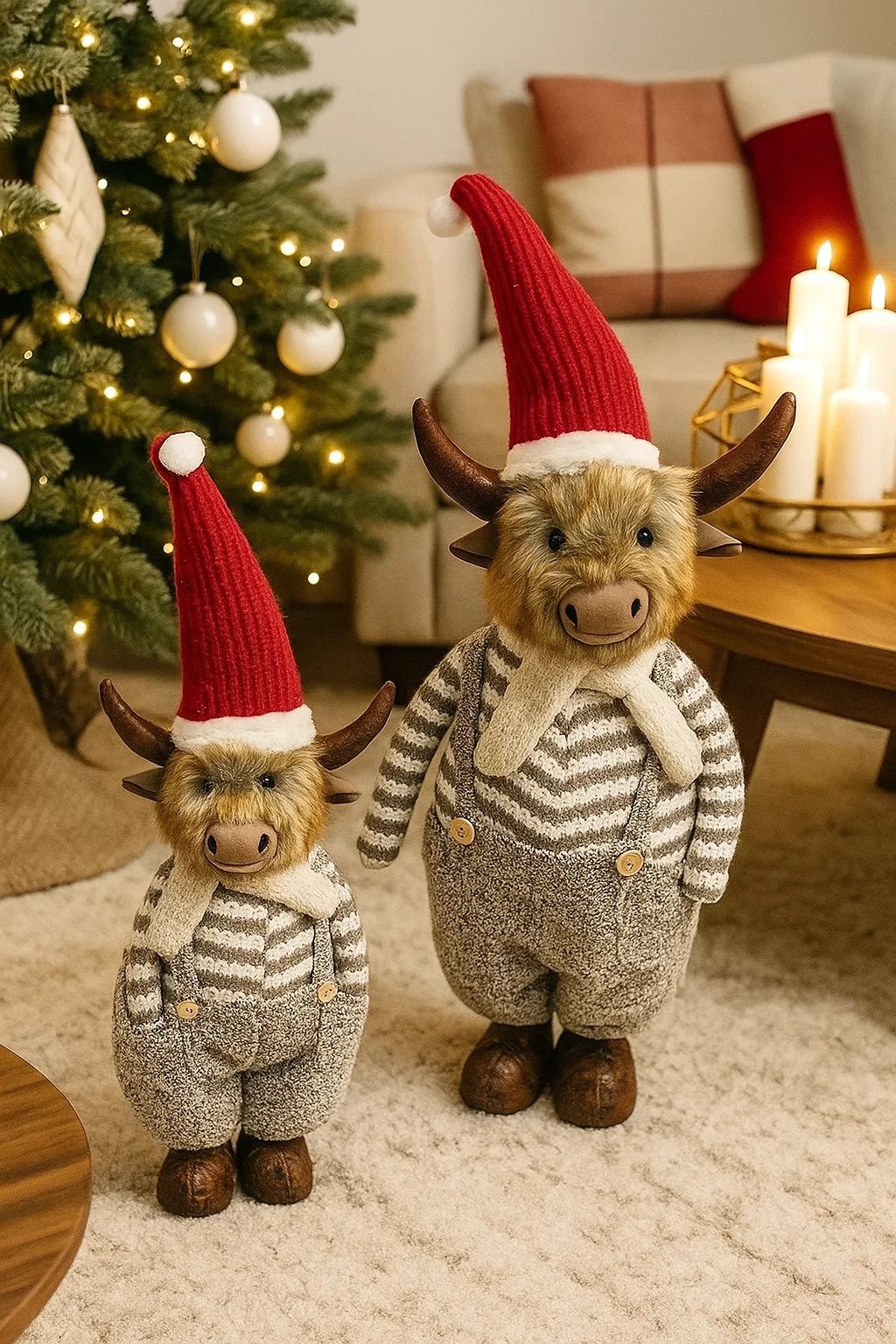 Bring home festive charm with this adorable Highland-inspired Christmas reindeer, dressed in cozy knitwear and a classic red Santa hat. With its soft faux fur, detailed horns, and handcrafted finish, this holiday decor piece adds warmth and character to your seasonal display. Perfect for placing by the Christmas tree, in entryways, or as a centerpiece, it blends rustic charm with holiday magic. Whether paired with other festive figurines or standing alone, it’s a delightful accent that captures the spirit of Christmas and makes your home feel extra joyful.