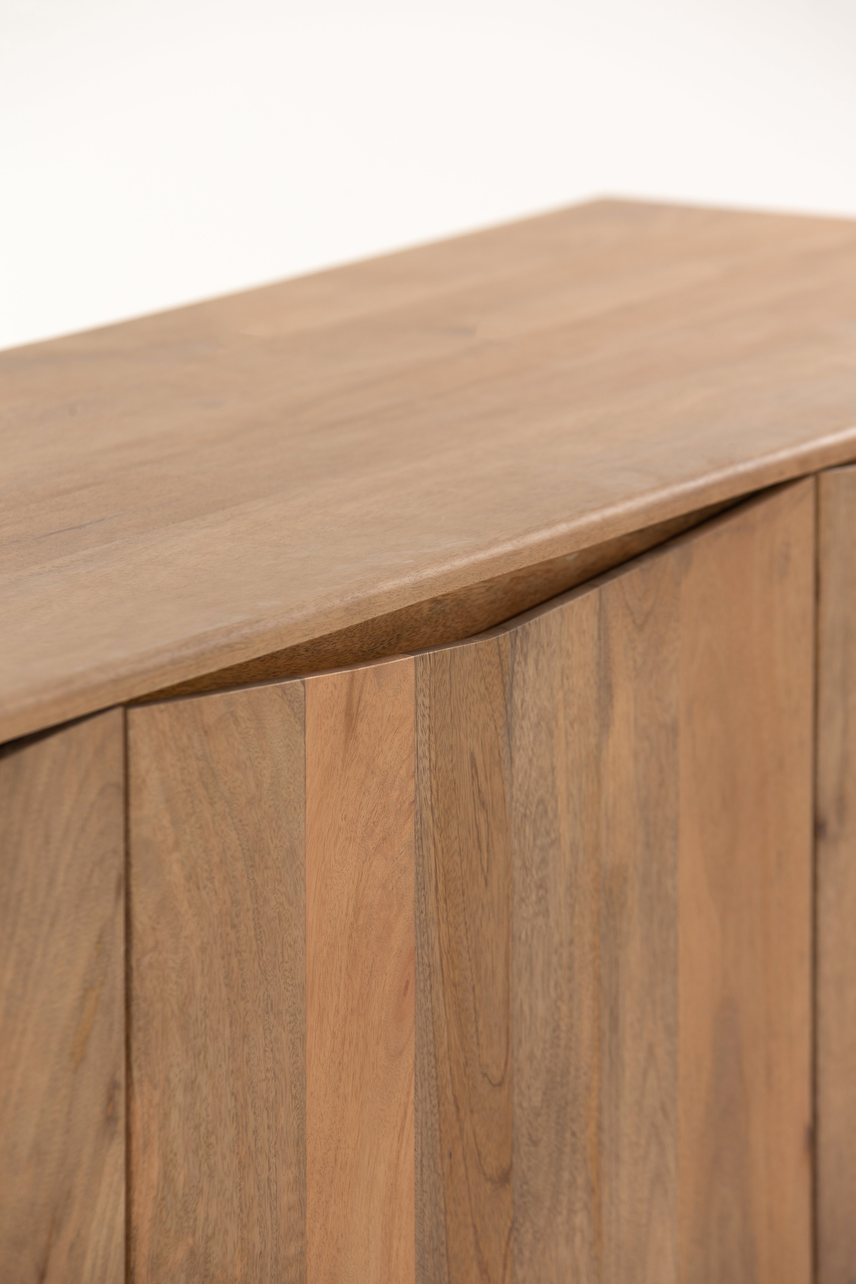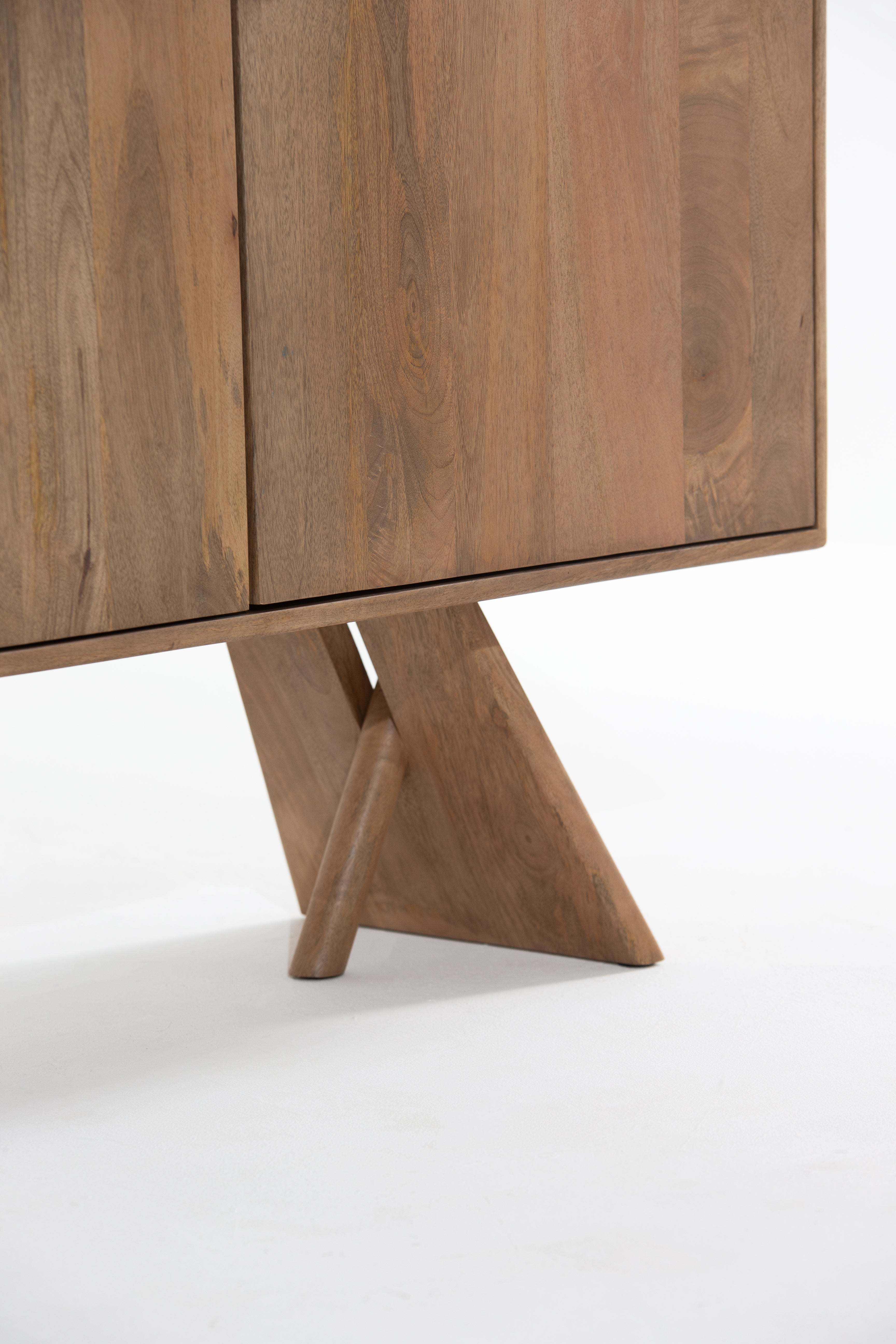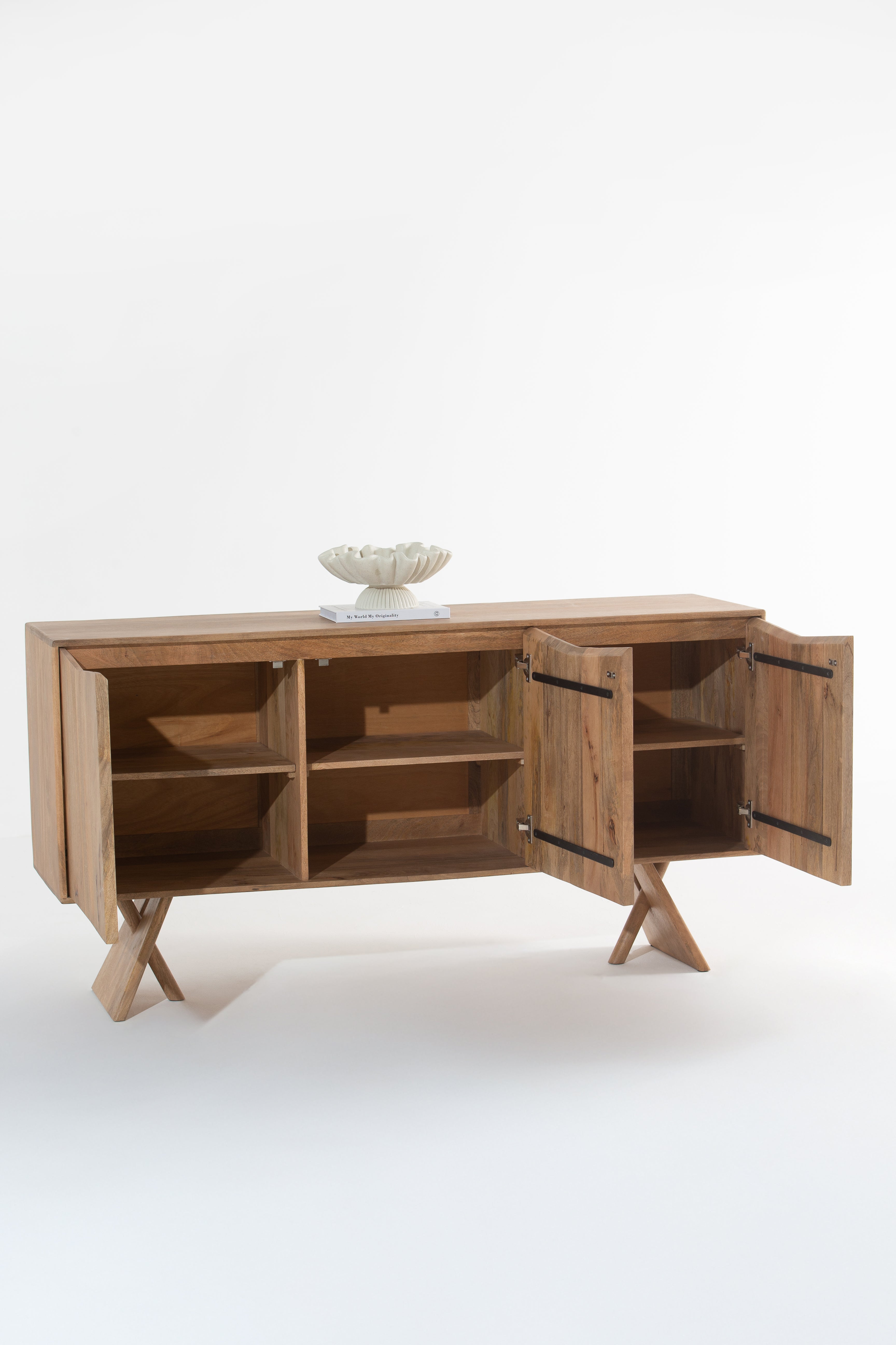 Elevate your storage with this 3-Door Wooden Sideboard, expertly constructed from solid Mindi wood and finished in a natural tone that highlights the rich, organic grain. Its clean, minimalist silhouette is complemented by unique angled X-style legs, lending it a modern sculptural character. The three flush cabinet doors open to spacious compartments with internal shelving—perfect for organizing serveware, linens, or living room essentials. Whether used in a dining area, entryway, or lounge, this sideboard delivers both timeless design and versatile storage with architectural charm.