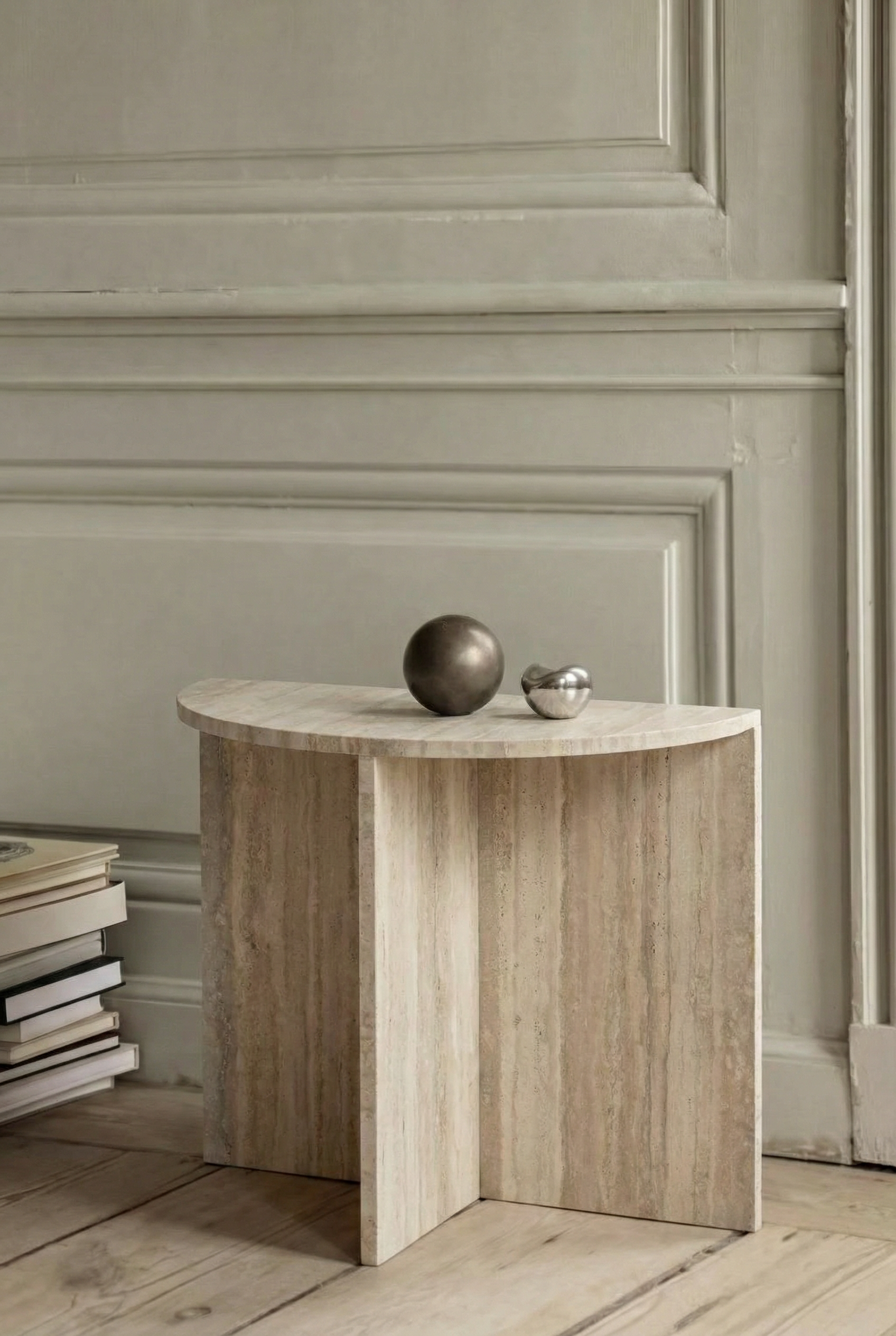 Enhance your space with the timeless beauty of honed travertine. A sculptural half-moon top and cross-base design showcase rich beige tones with natural veining. Perfect as a statement piece, its neutral palette blends seamlessly with modern, minimalist, and organic interiors. Crafted from solid travertine, this durable accent table offers both function and artistry for living rooms, bedrooms, or lounges.