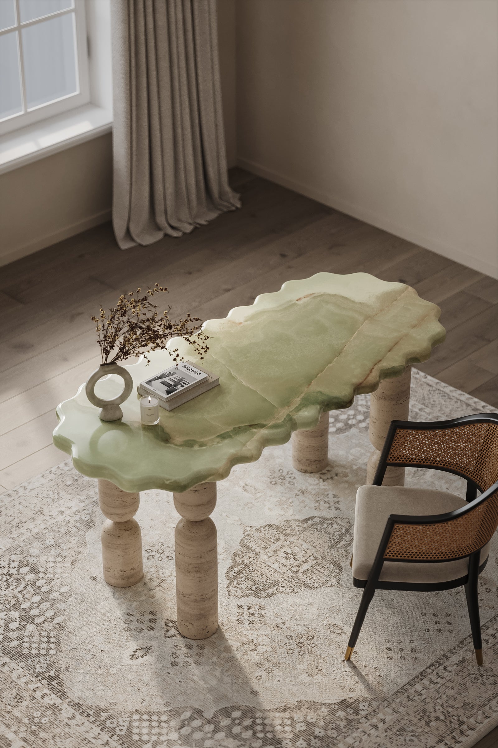 This sculptural desk features bold travertine cylinder legs paired with a stunning scalloped green onyx top, seamlessly blending natural elegance with contemporary design. Perfect for a modern office or refined interior, the desk showcases the rich textures and earthy tones of its materials, making it a luxurious statement piece that elevates any workspace.