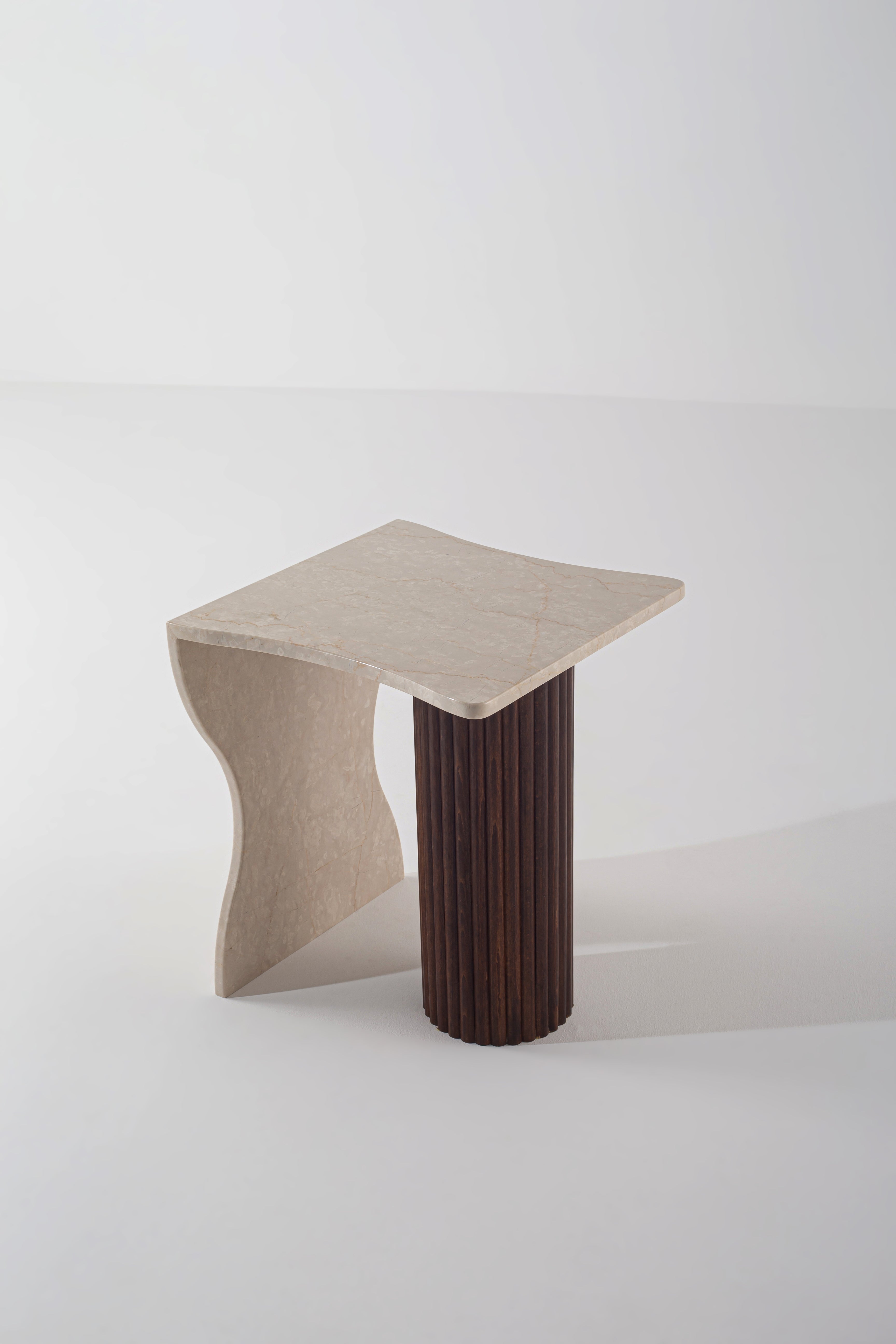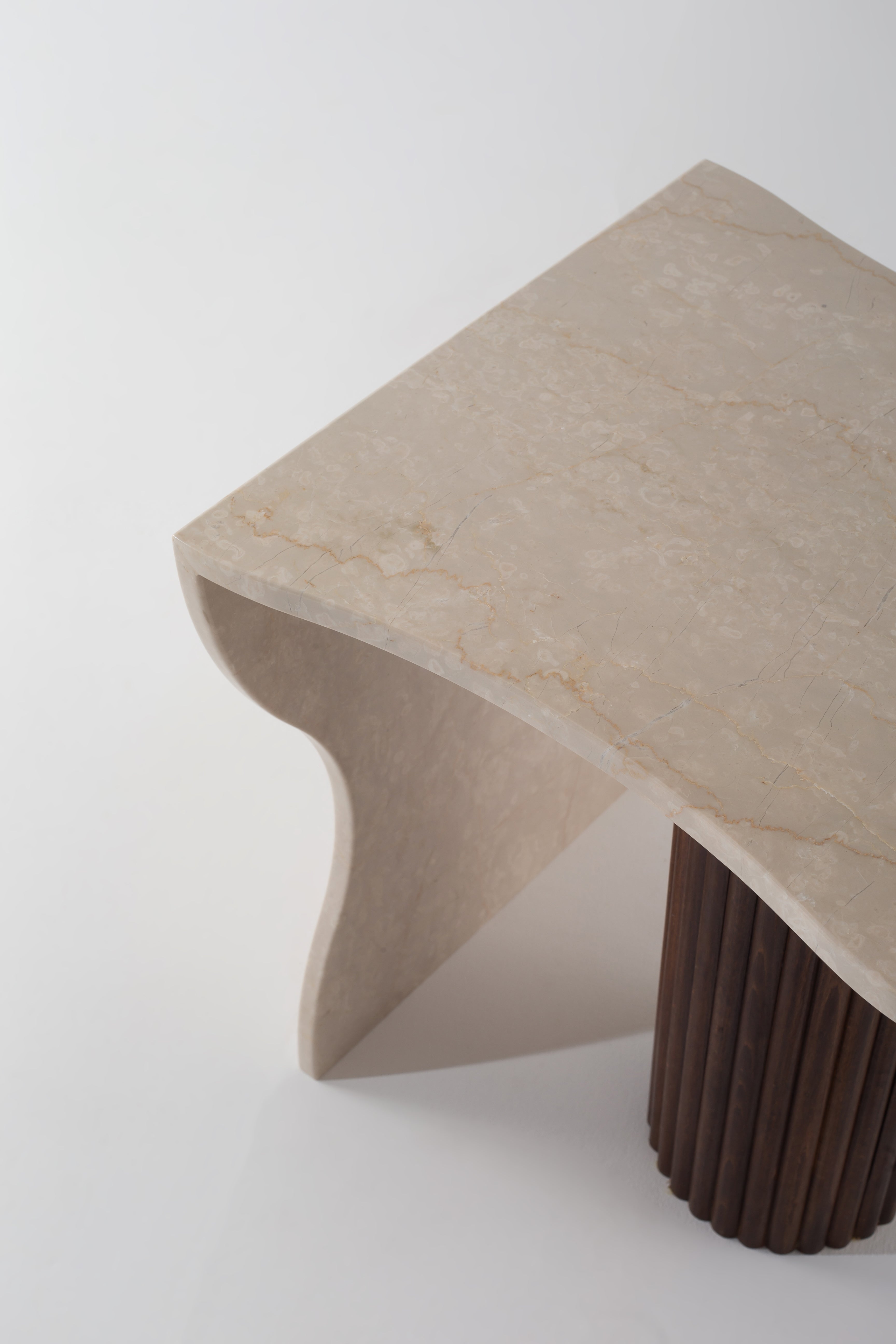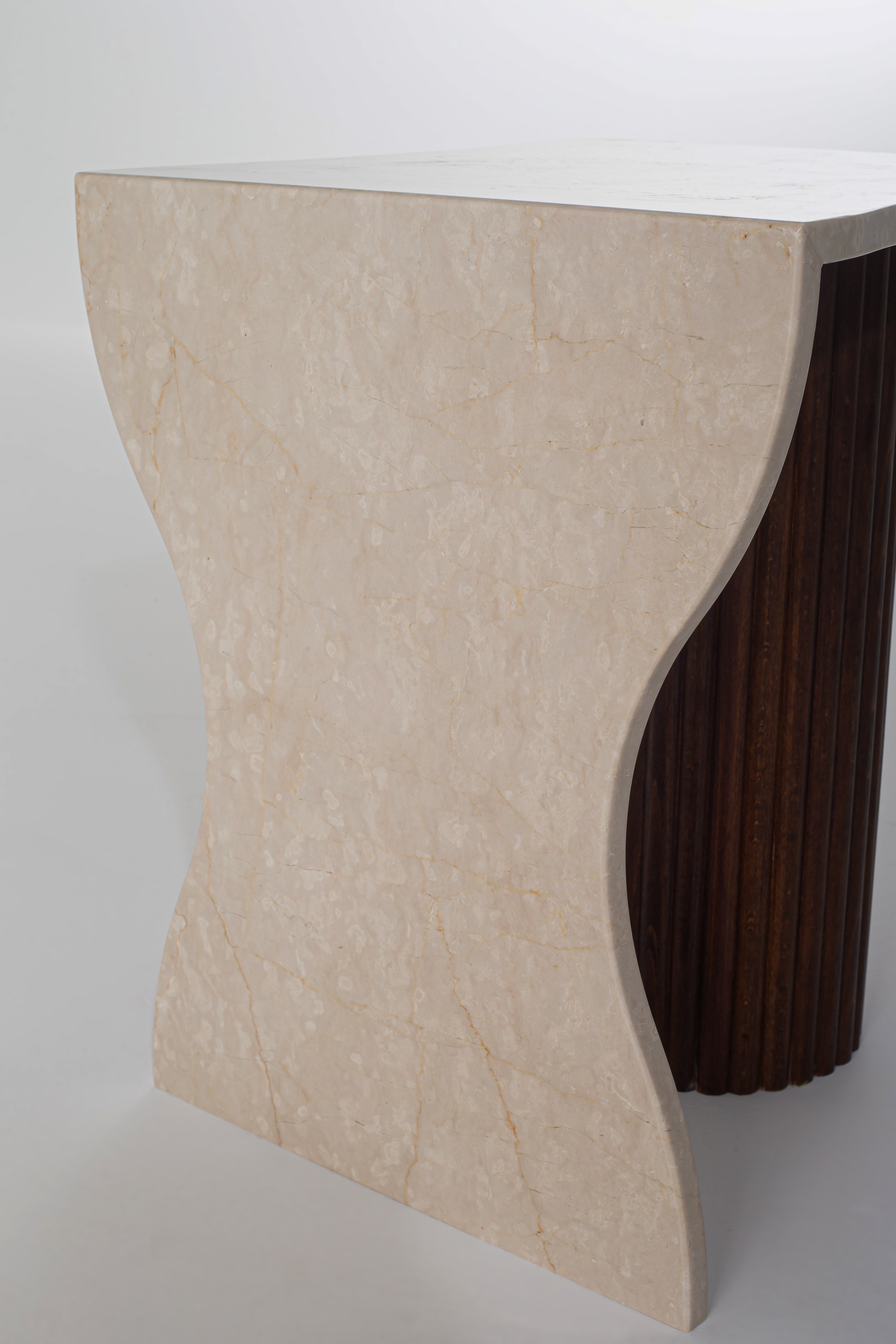 Your space deserves a statement piece that blends art with function. A sculptural Botticino marble top, with its soft beige tones and organic veining, flows seamlessly into a fluted walnut wood base, creating a striking contrast. The mix of textures and materials adds warmth and elegance, making this side table a refined accent for any modern interior.