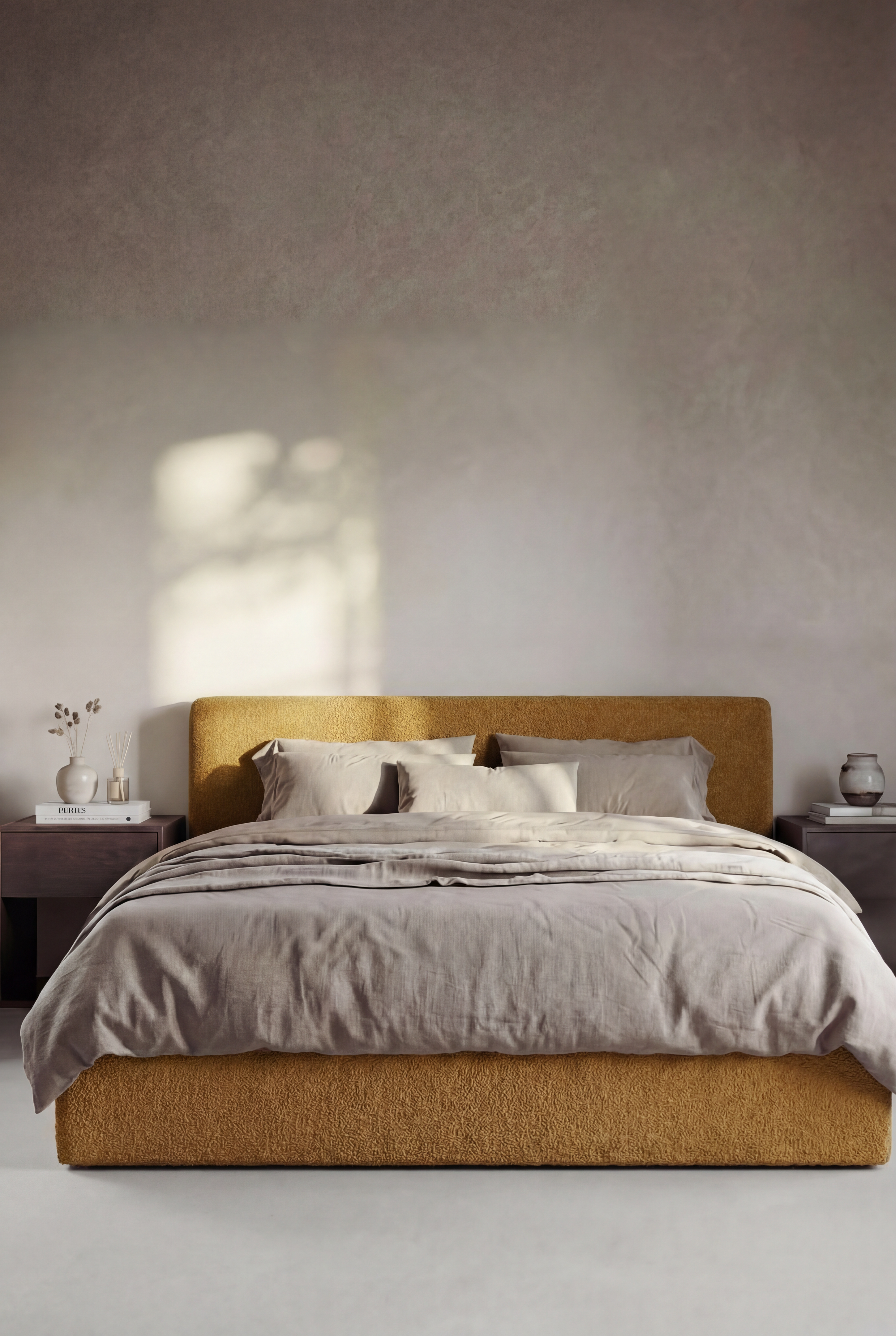 This upholstered bed enriches your bedroom with a warm, tactile presence, featuring a softly textured fabric and a refined modern silhouette that brings depth, comfort, and quiet luxury into your space. The padded headboard creates a cozy visual anchor, while the earthy golden tone adds warmth and sophistication, allowing your room to feel grounded, serene, and thoughtfully styled. Ideal for modern, minimalist, and organic interiors, this piece transforms your bedroom into an inviting retreat where calm design, natural elegance, and elevated comfort define your everyday rest.